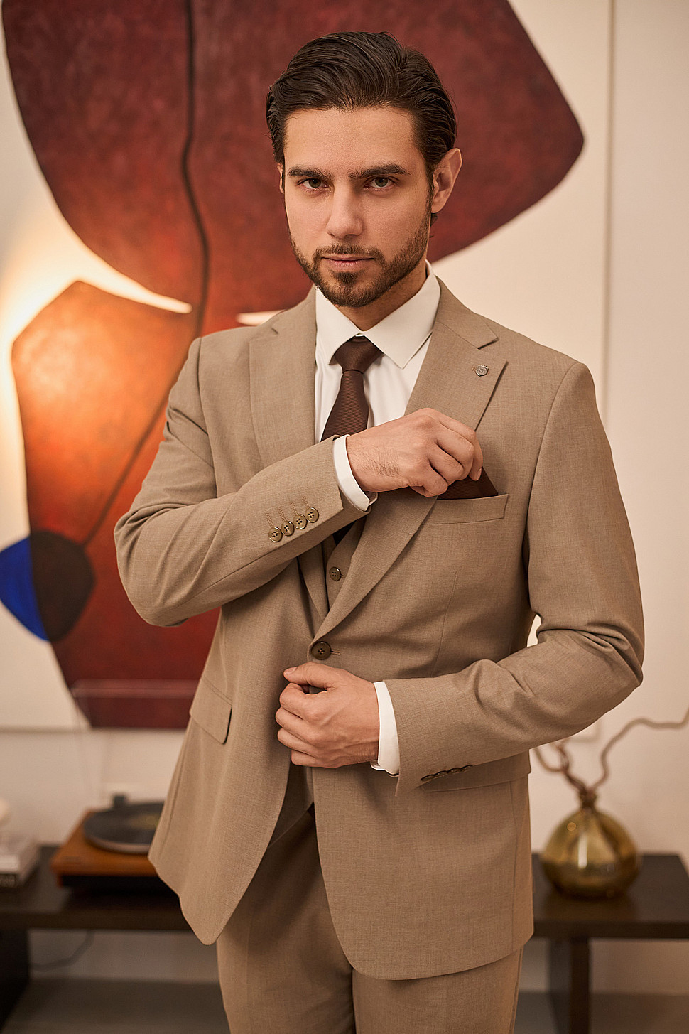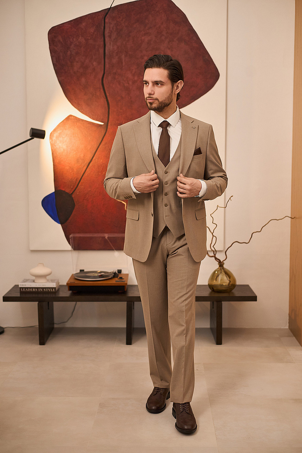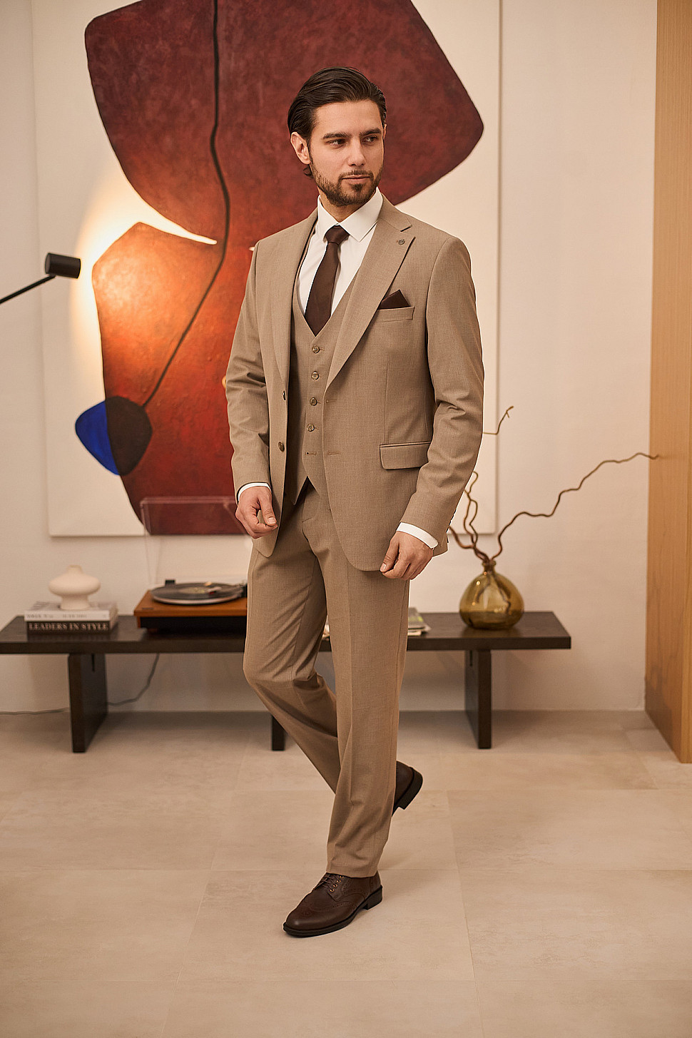 Костюм бежевый тройка с коричневым галстуком