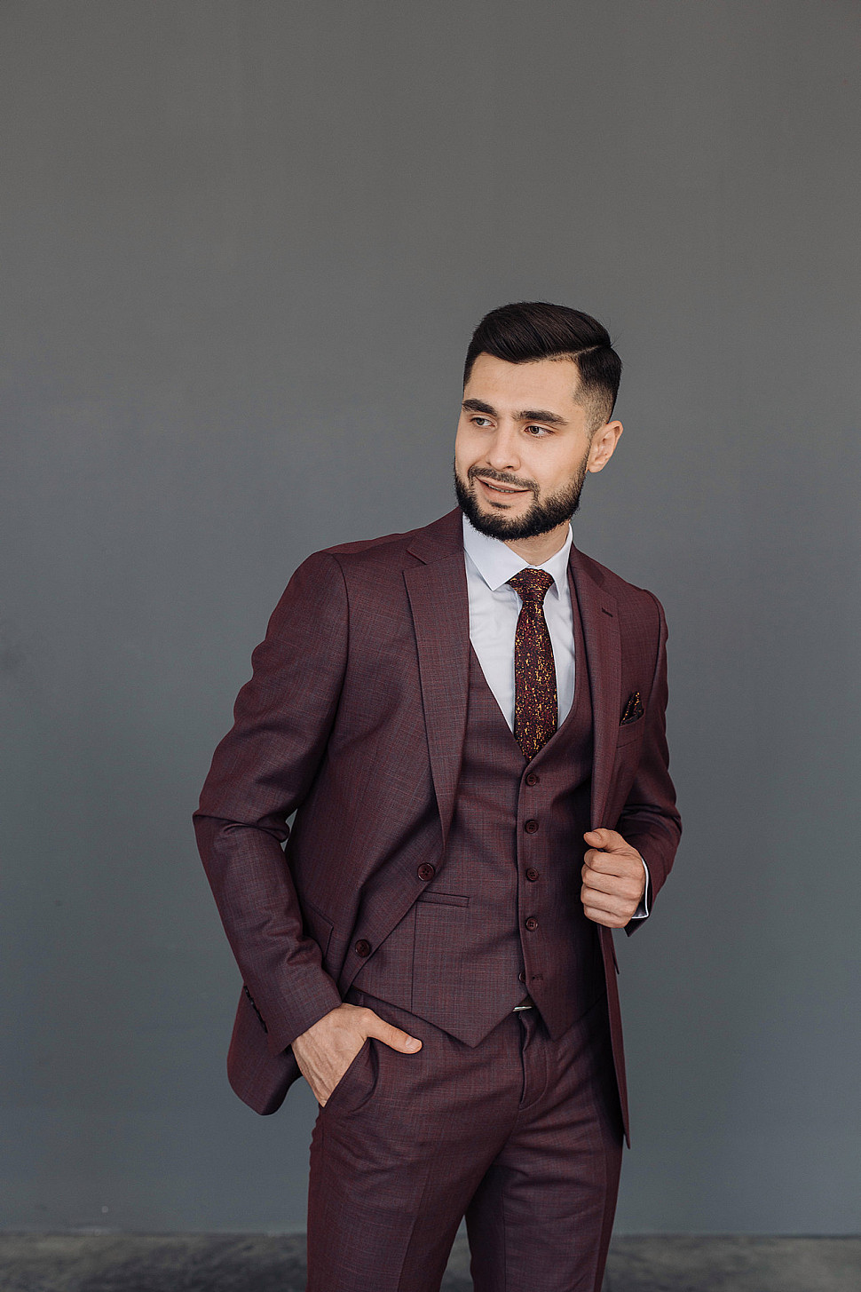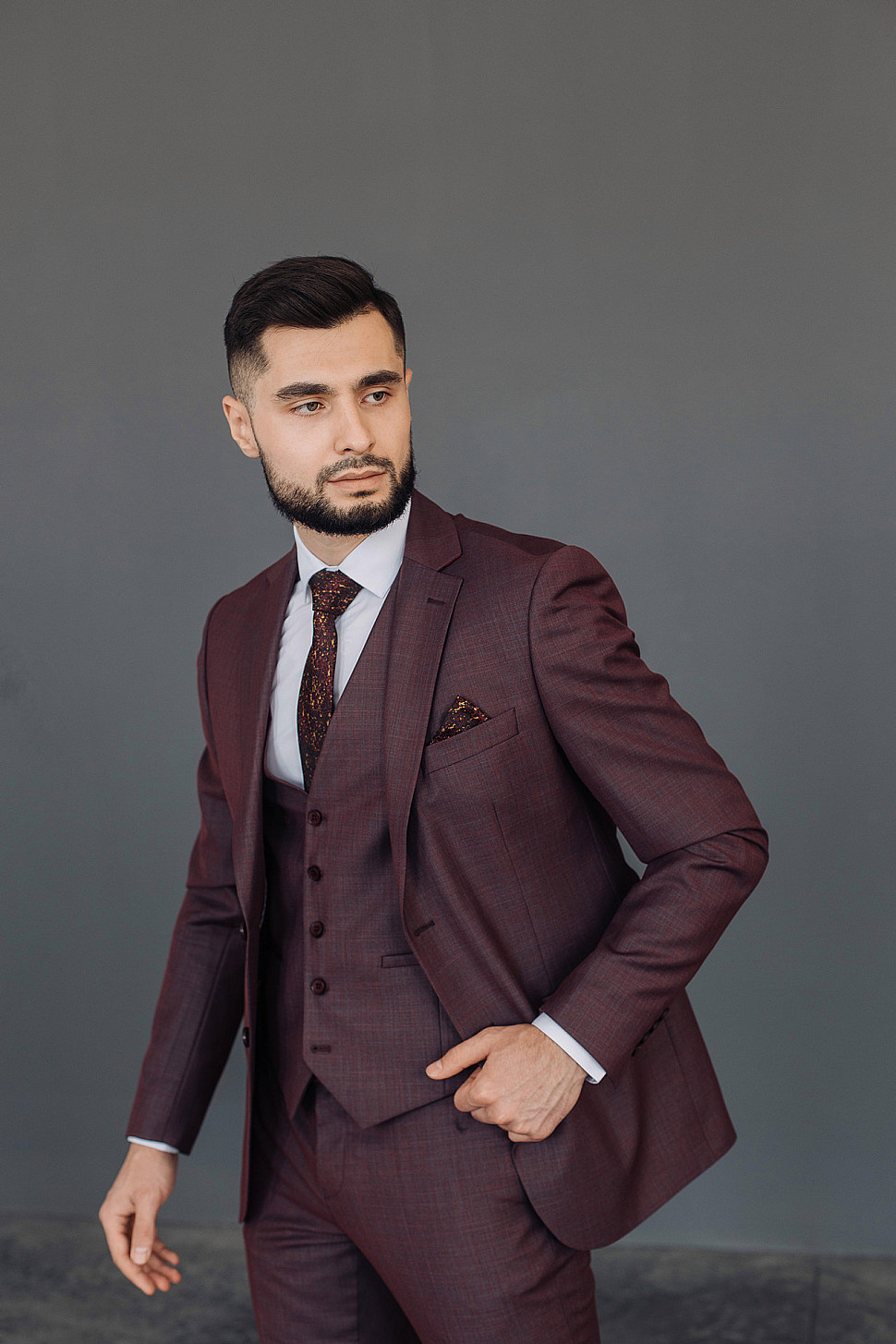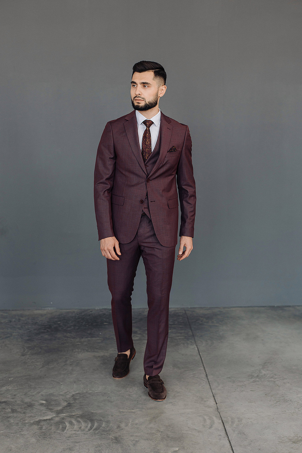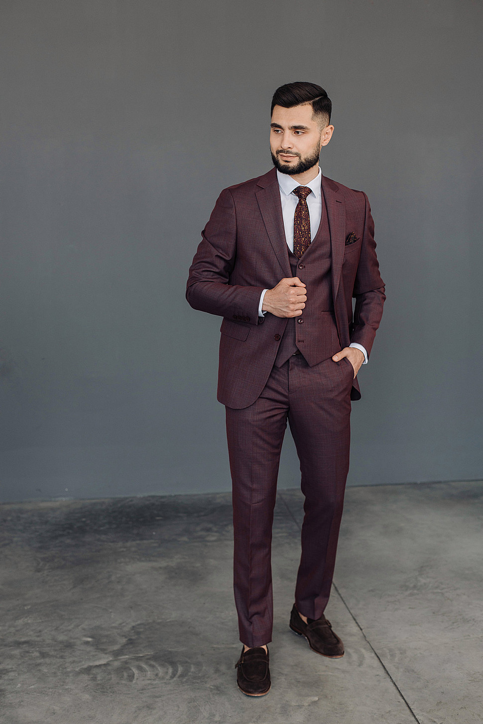 Костюм мужской тройка темно-бордового цвета фактурный