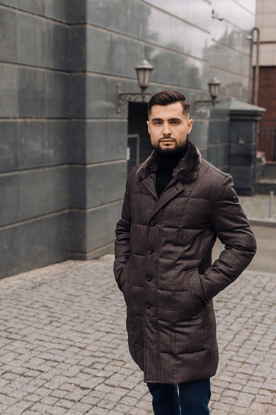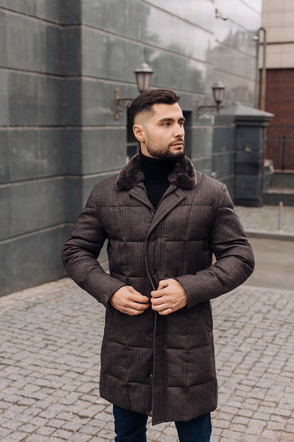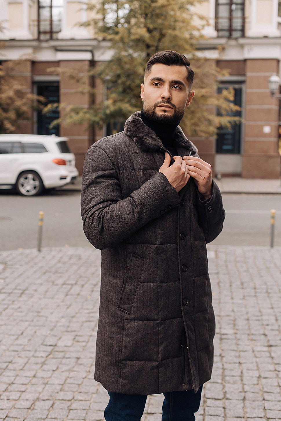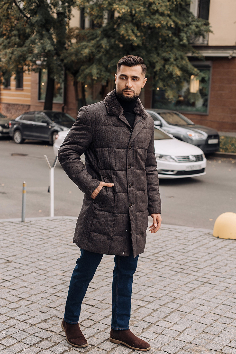 Мужская куртка темно-коричневого цвета с меховым воротником