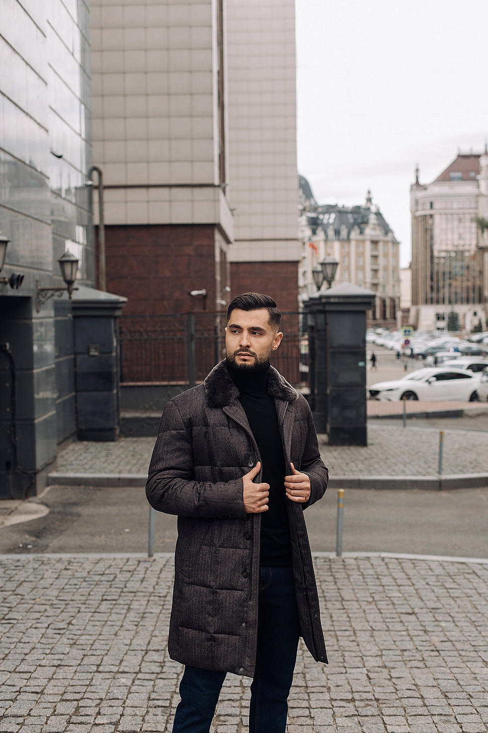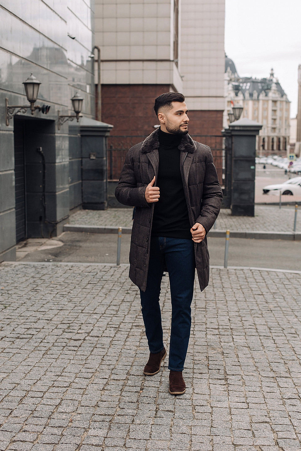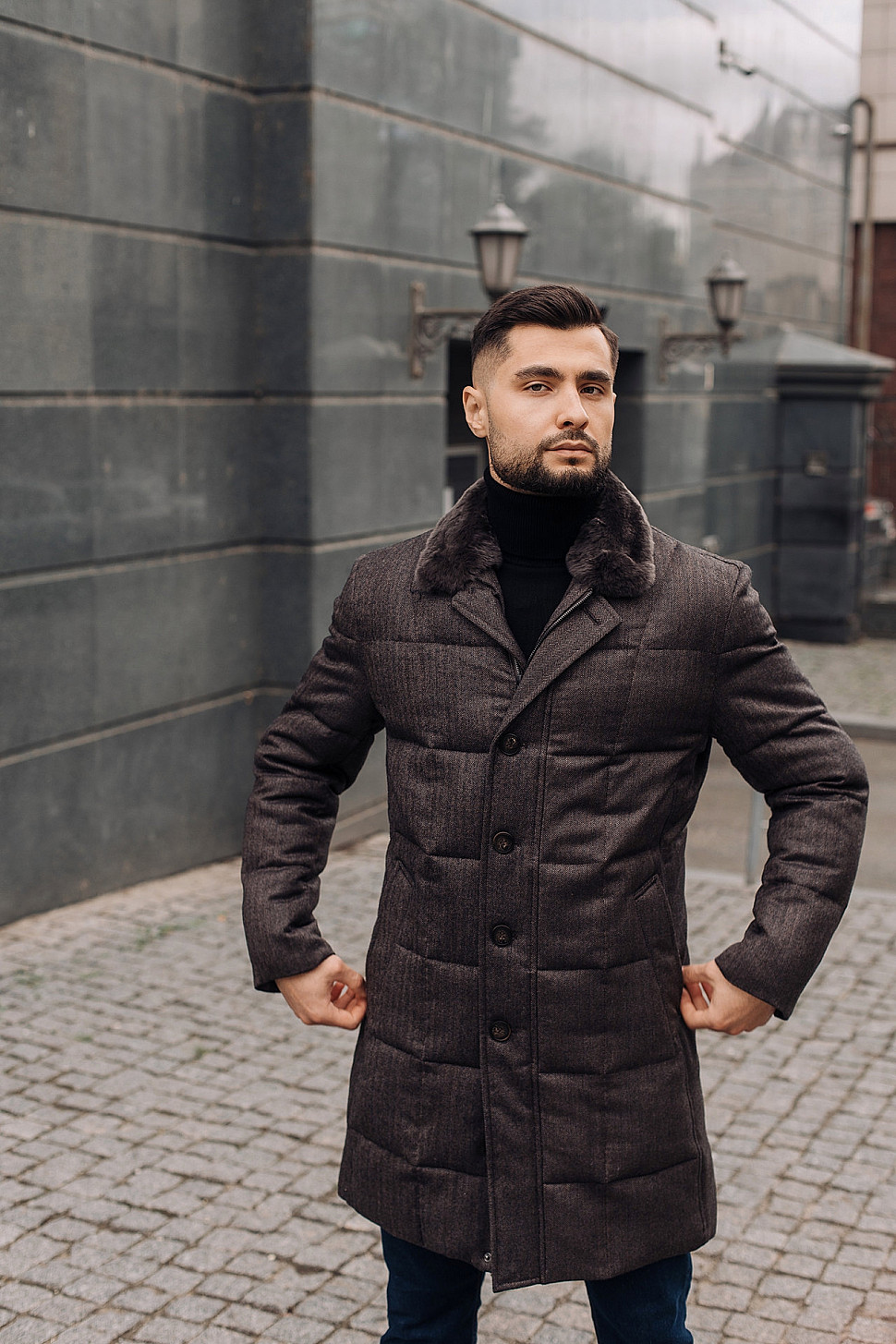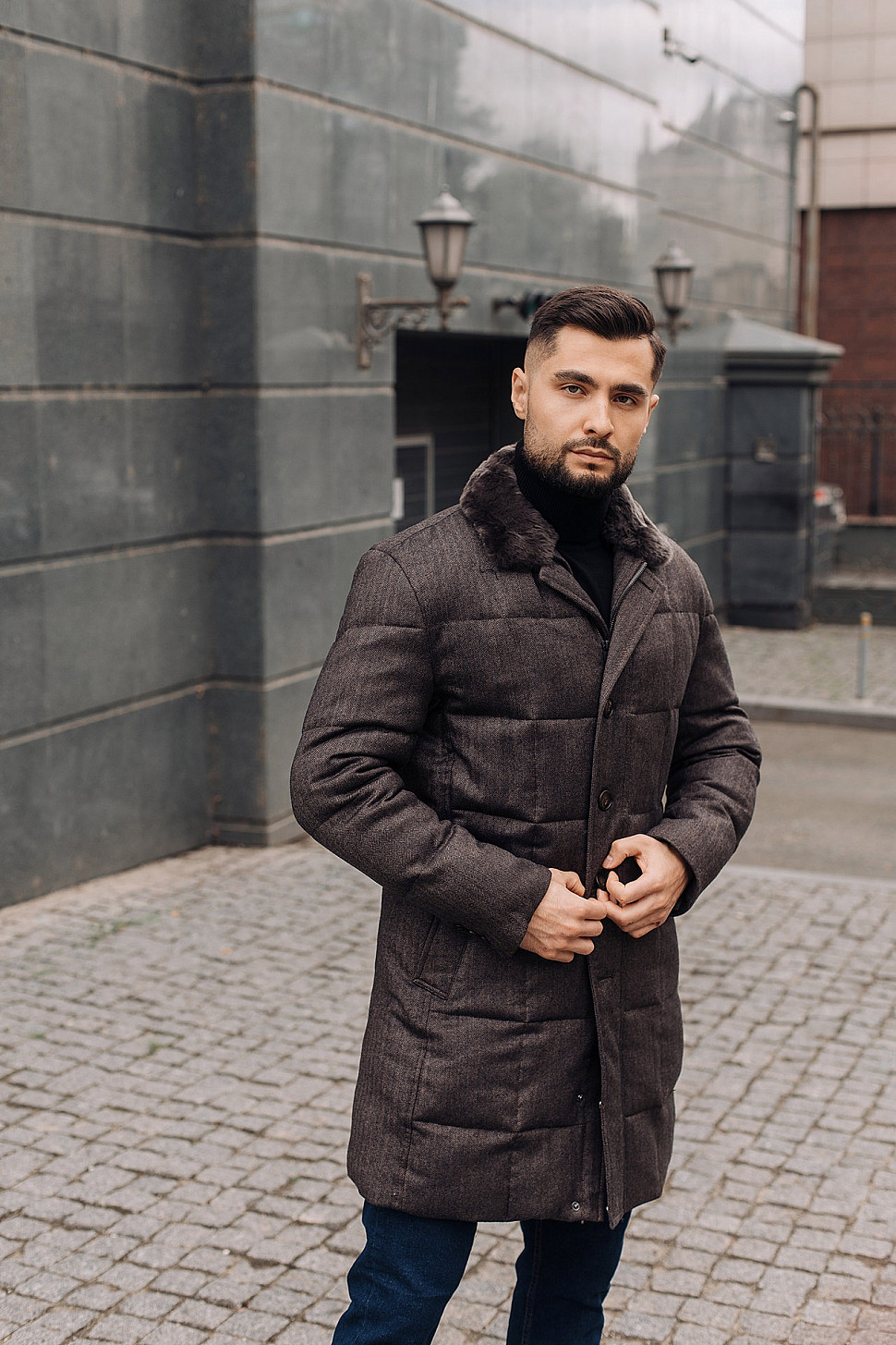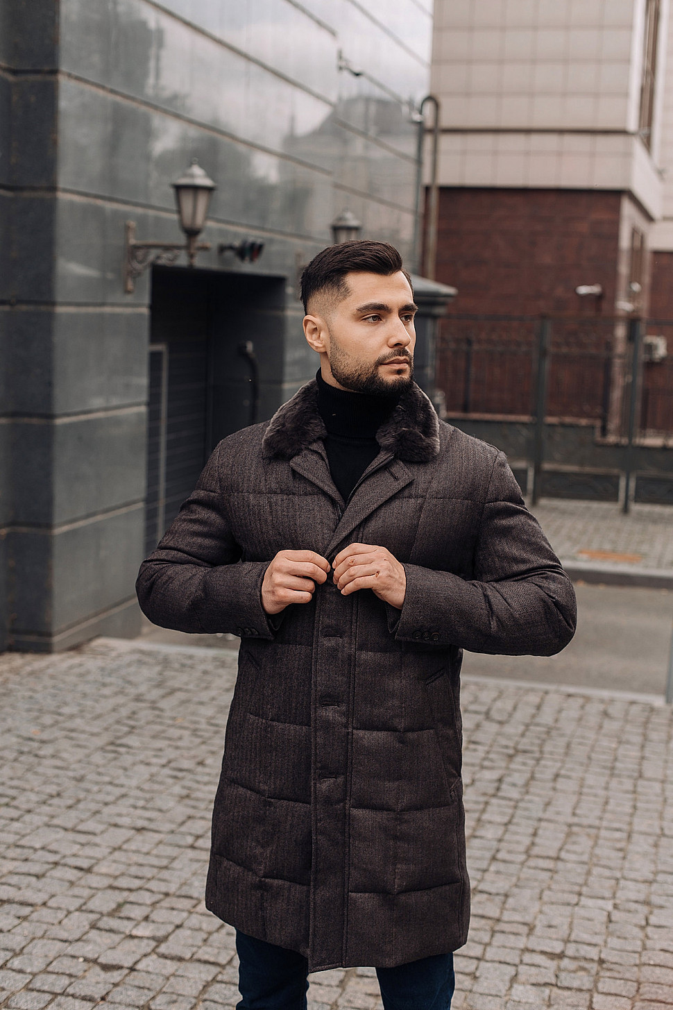 Мужская куртка темно-коричневого цвета с меховым воротником
