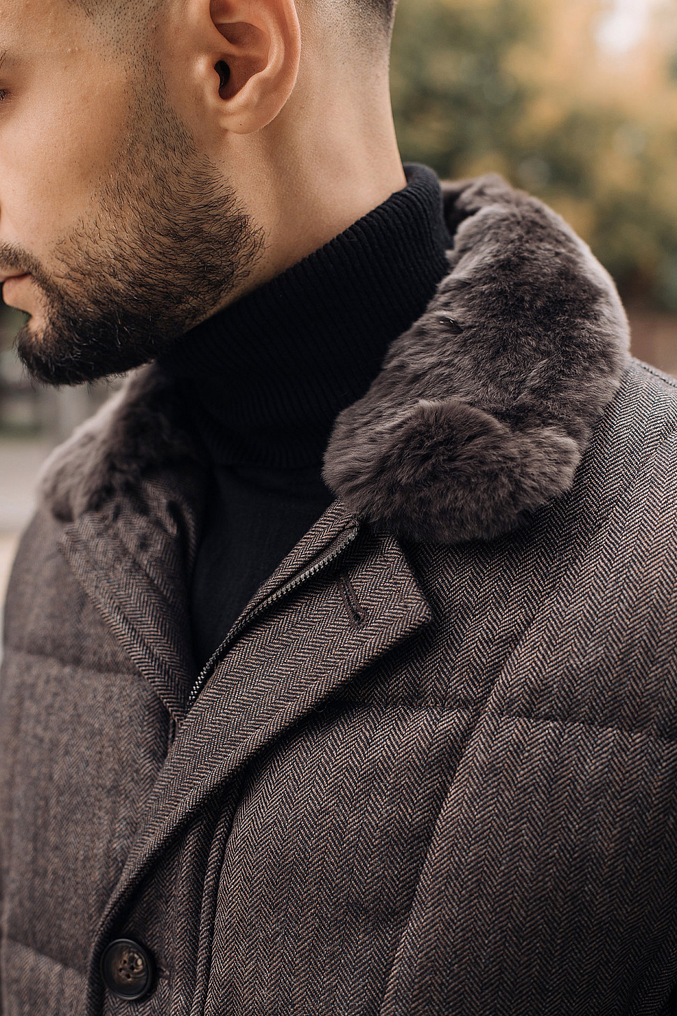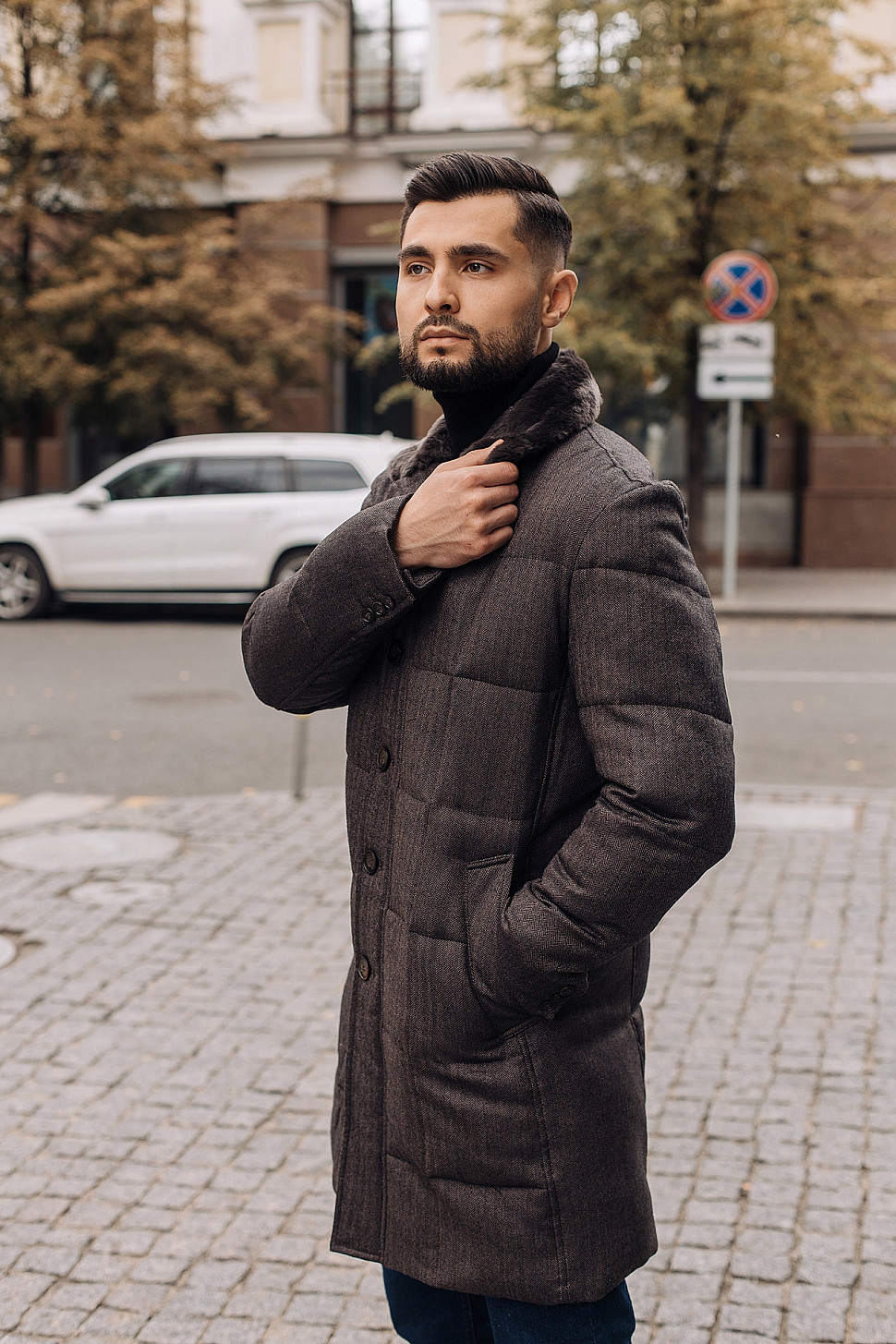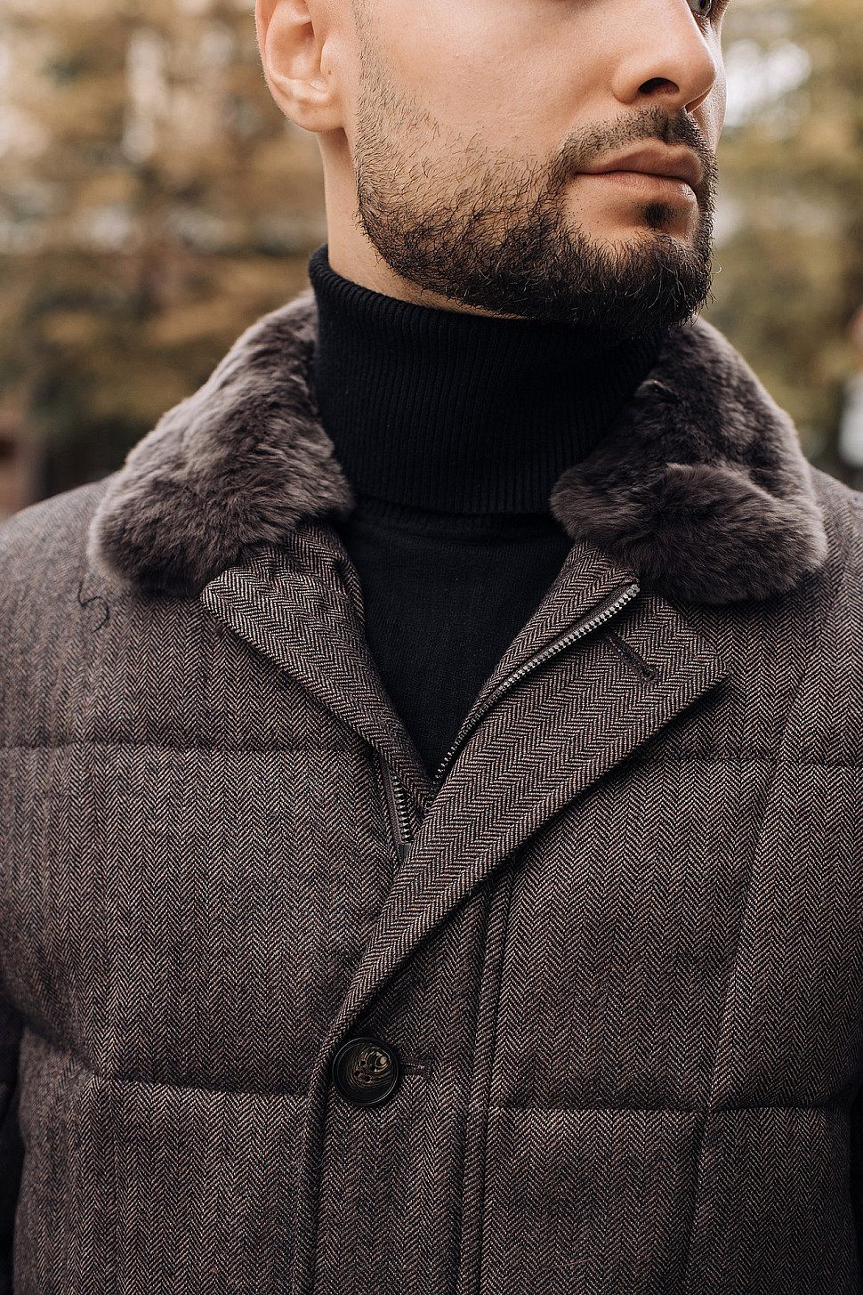 Мужская куртка коричневого цвета с меховым воротником