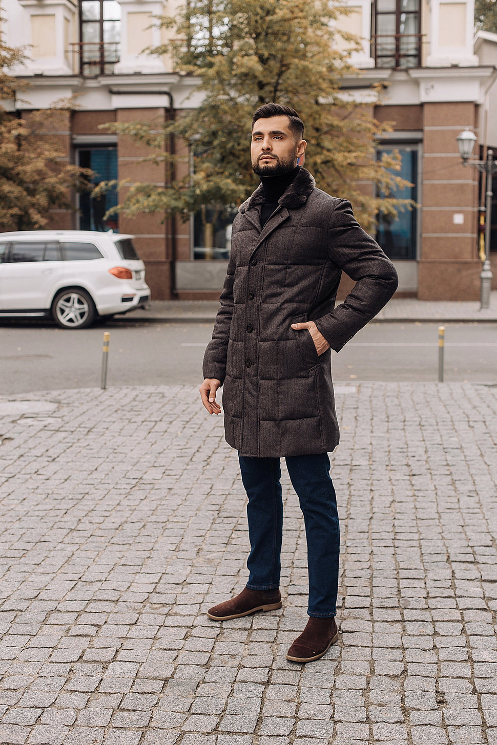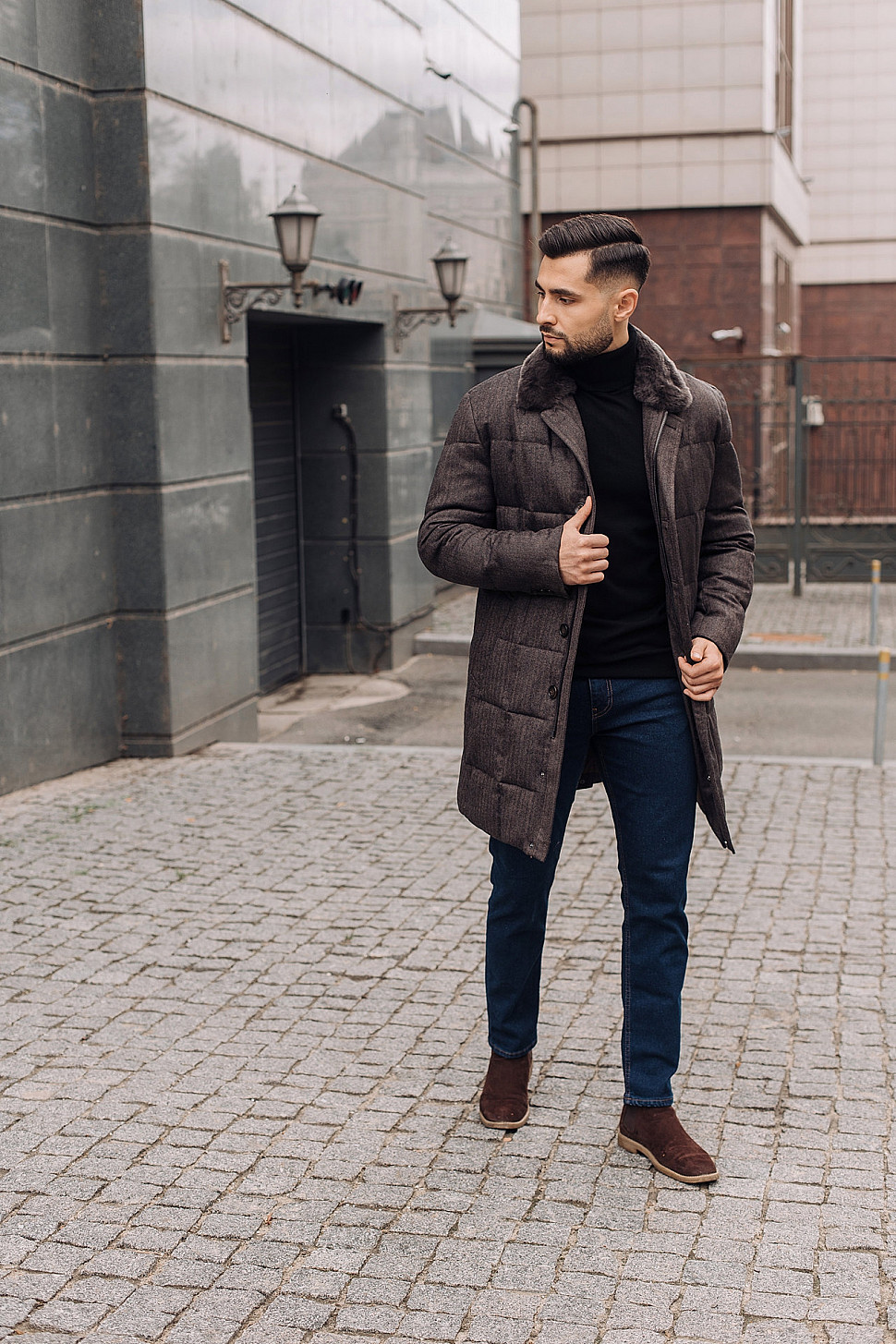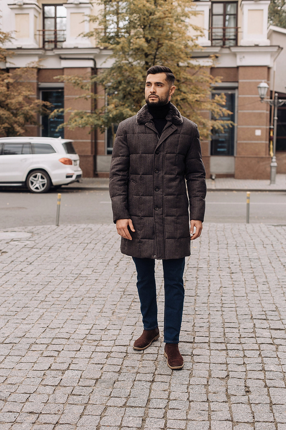Мужская куртка коричневого цвета с меховым воротником