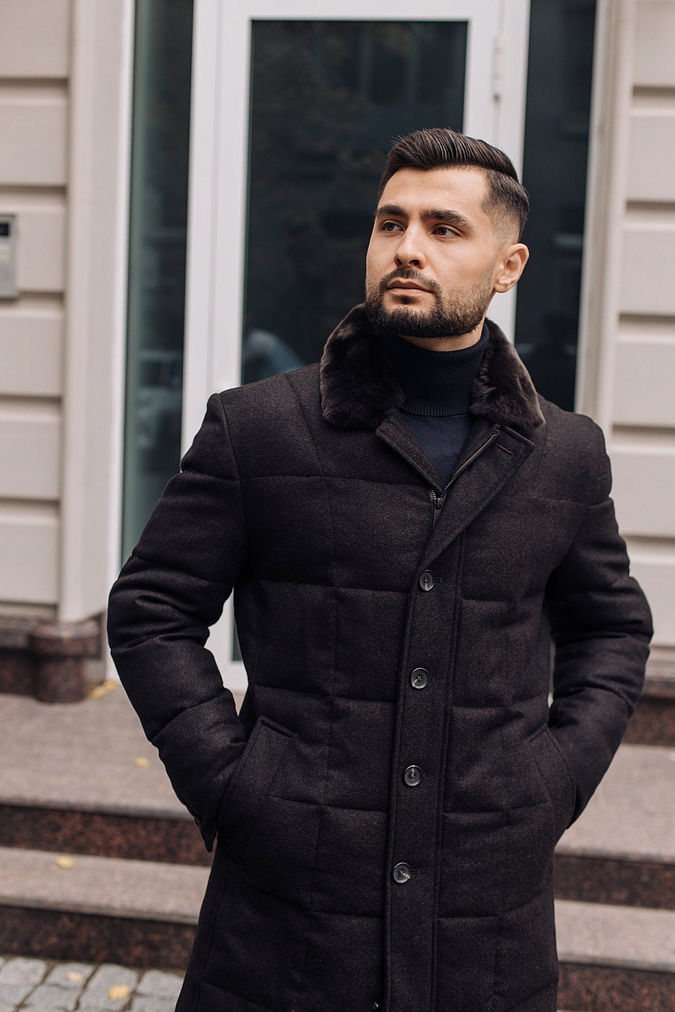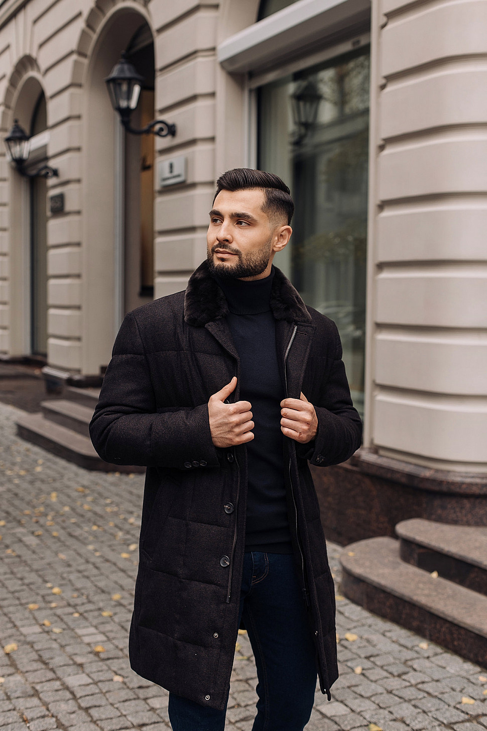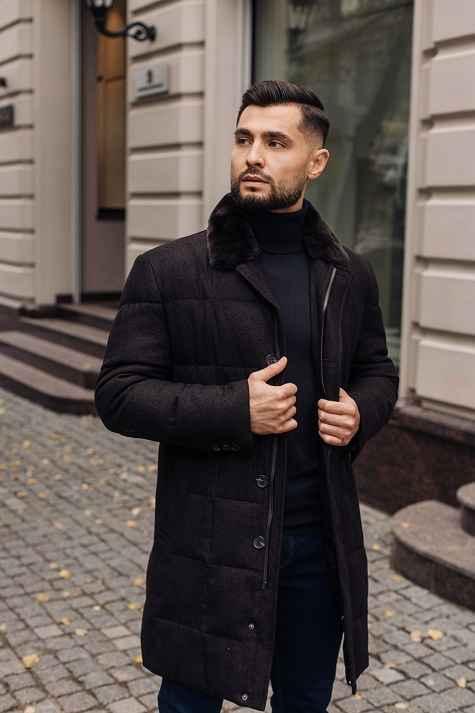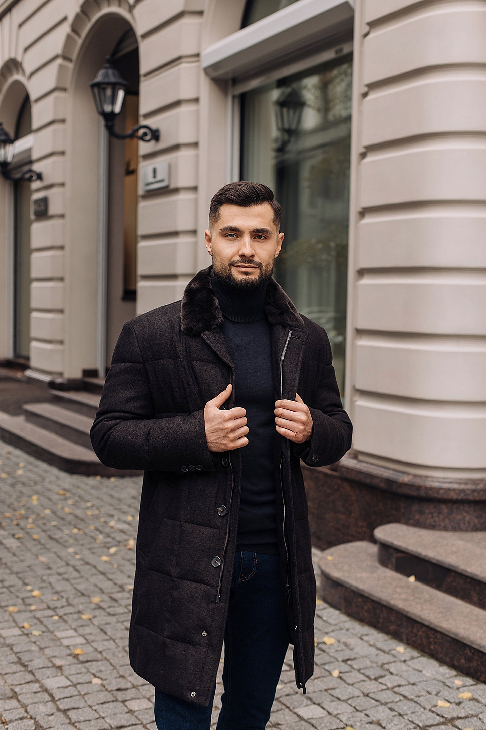 Мужское пальто черного цвета с двойным воротником