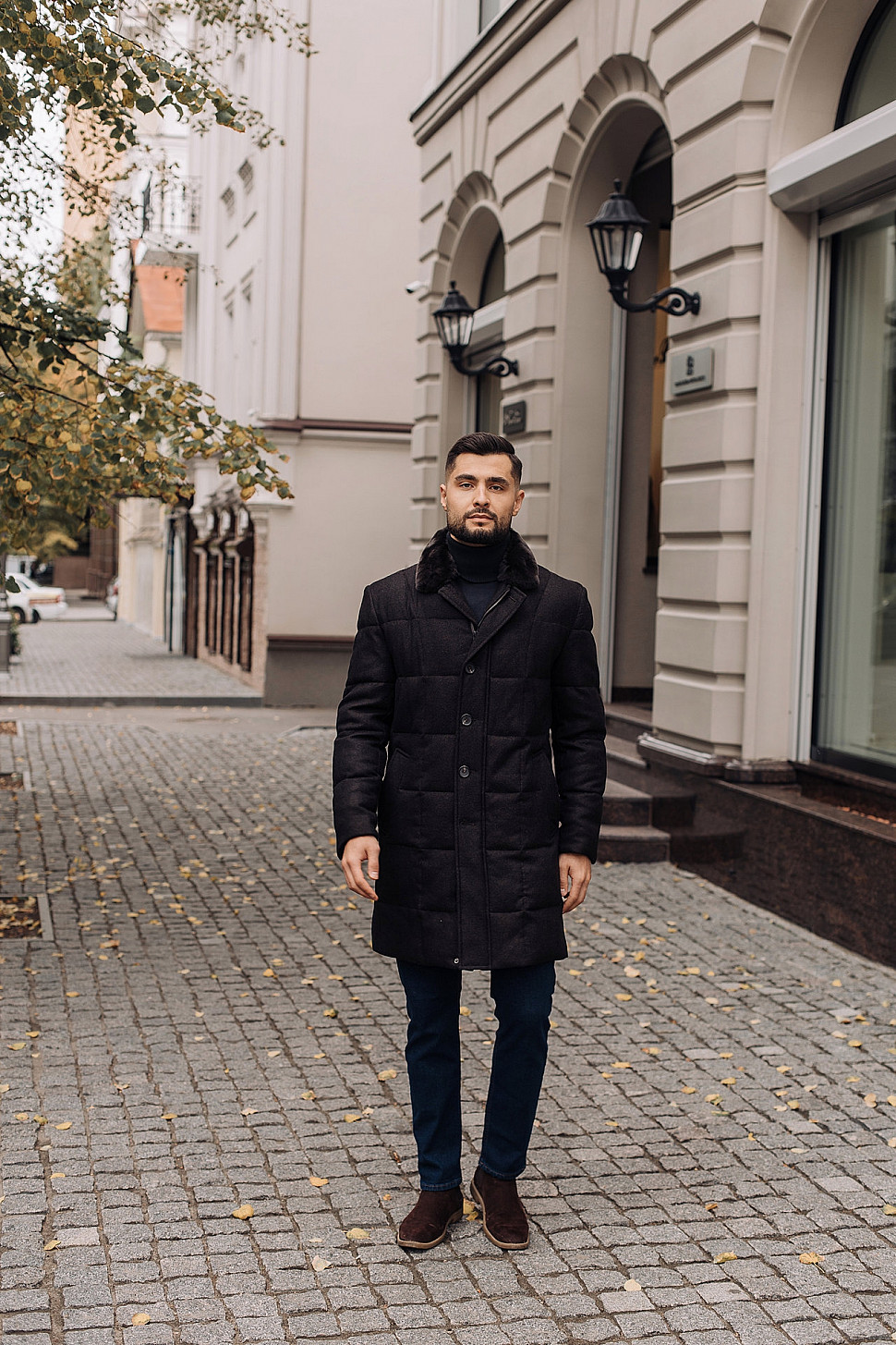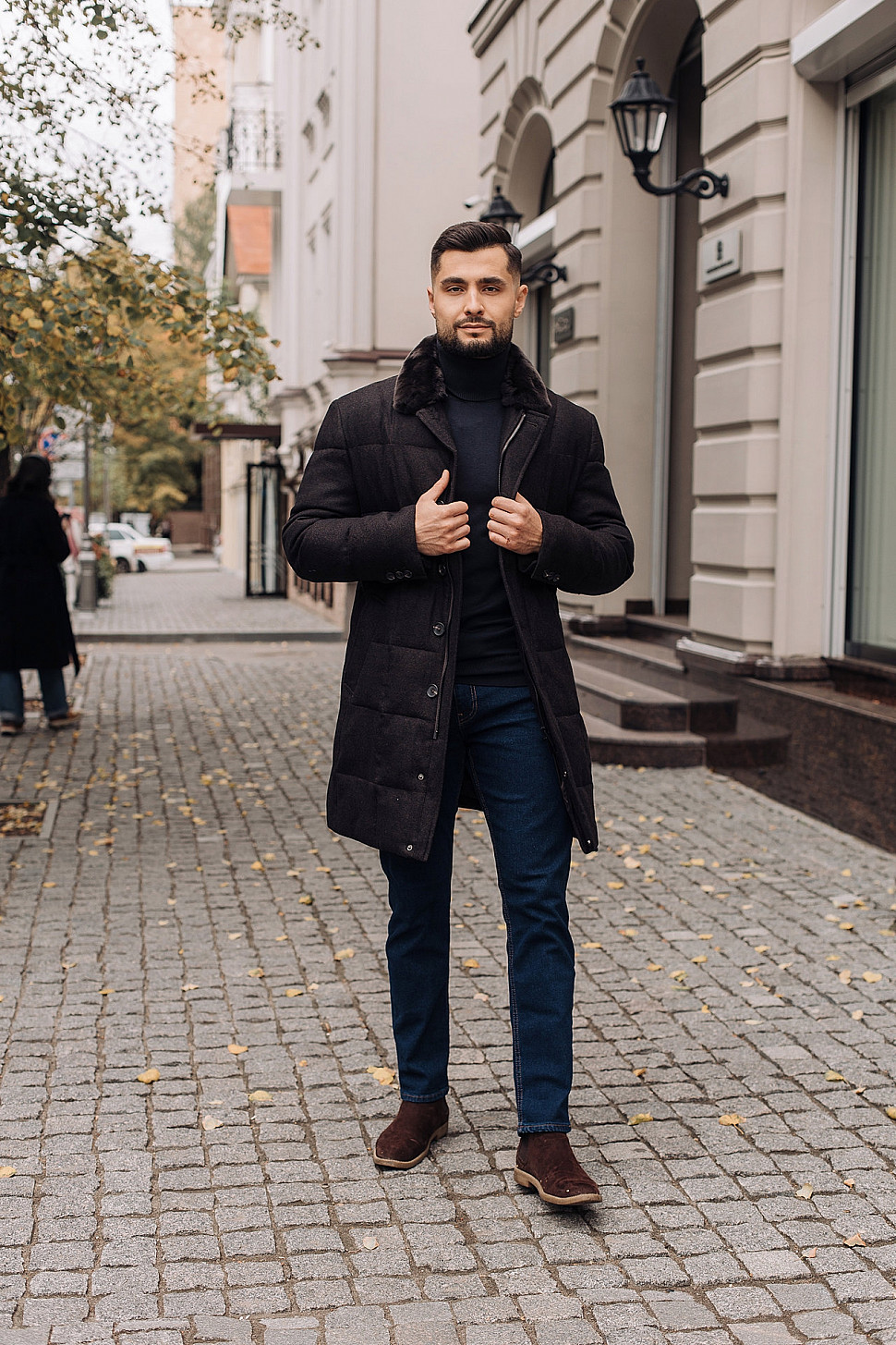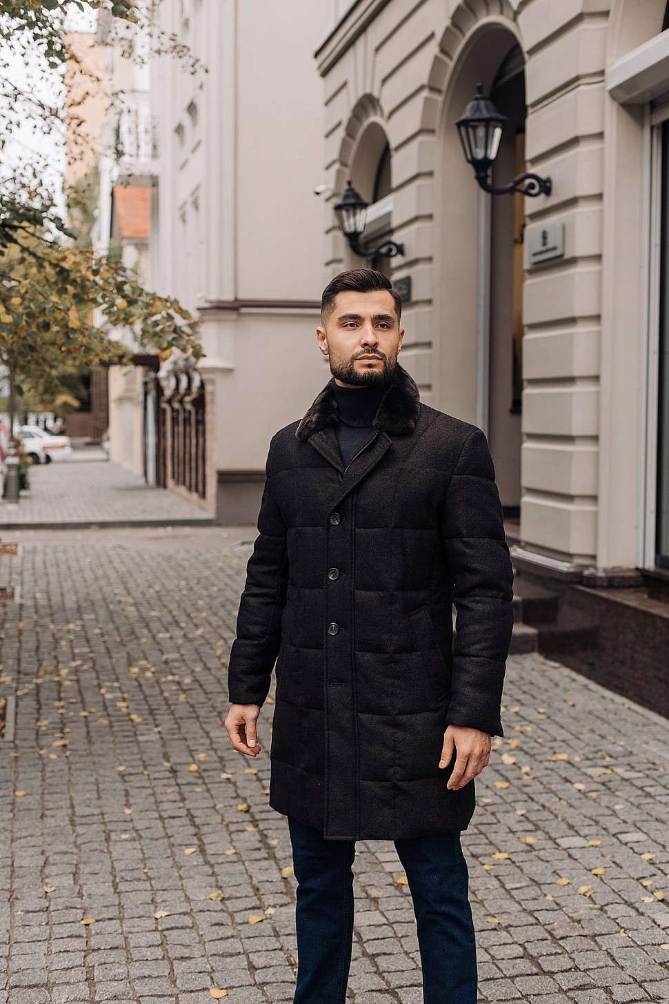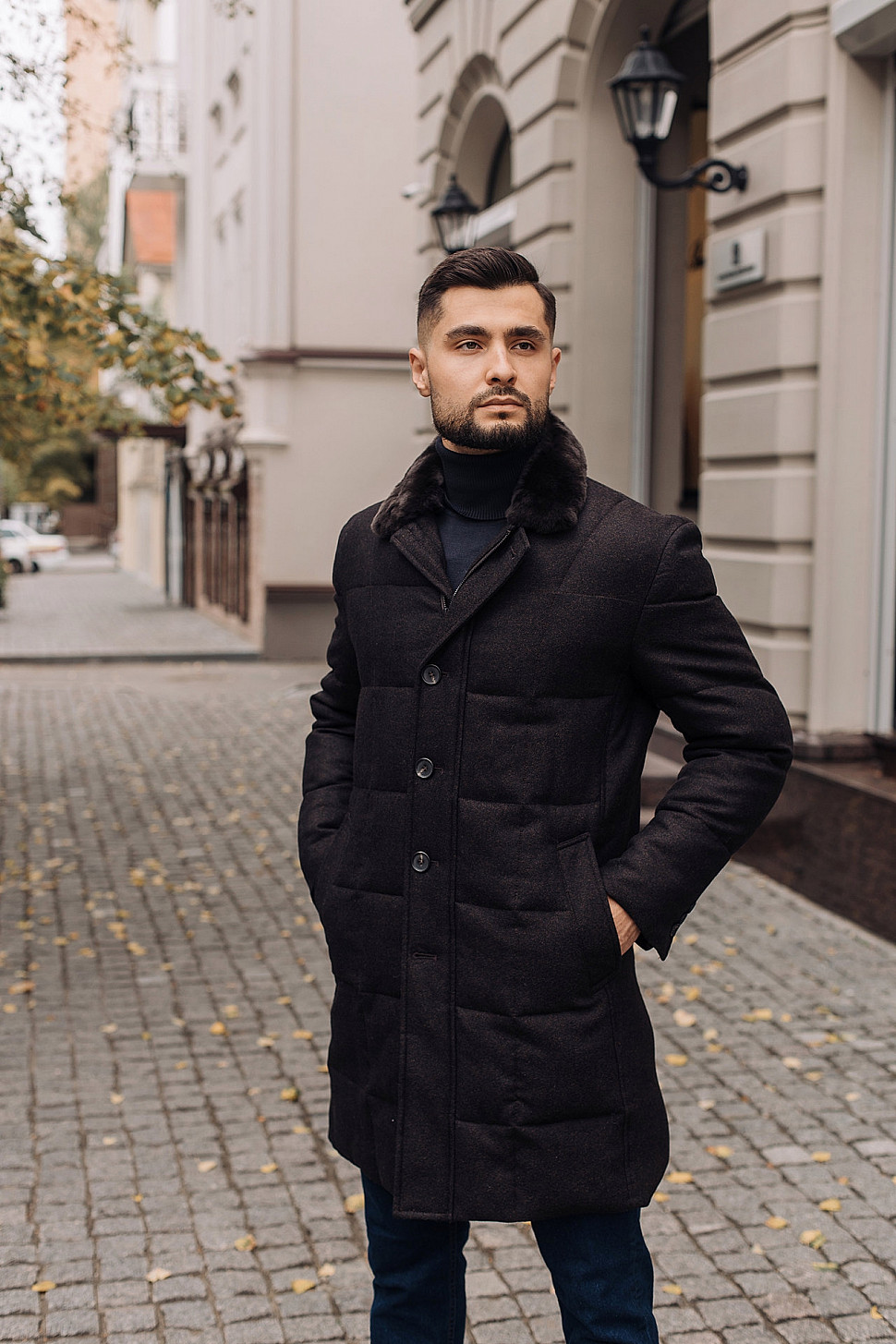 Мужское пальто черного цвета с двойным воротником