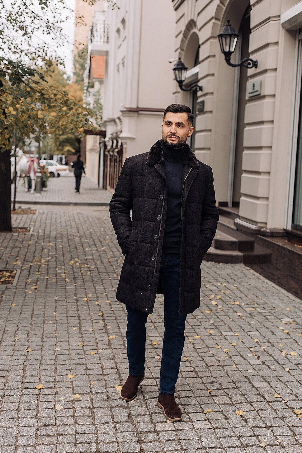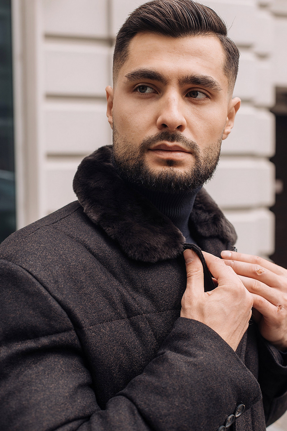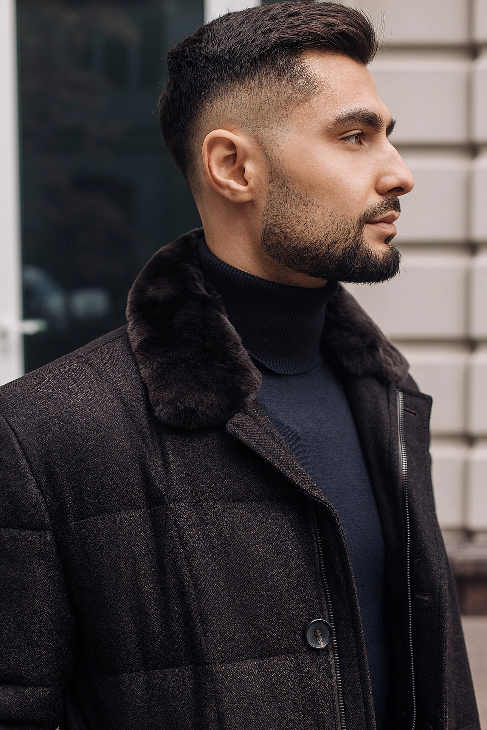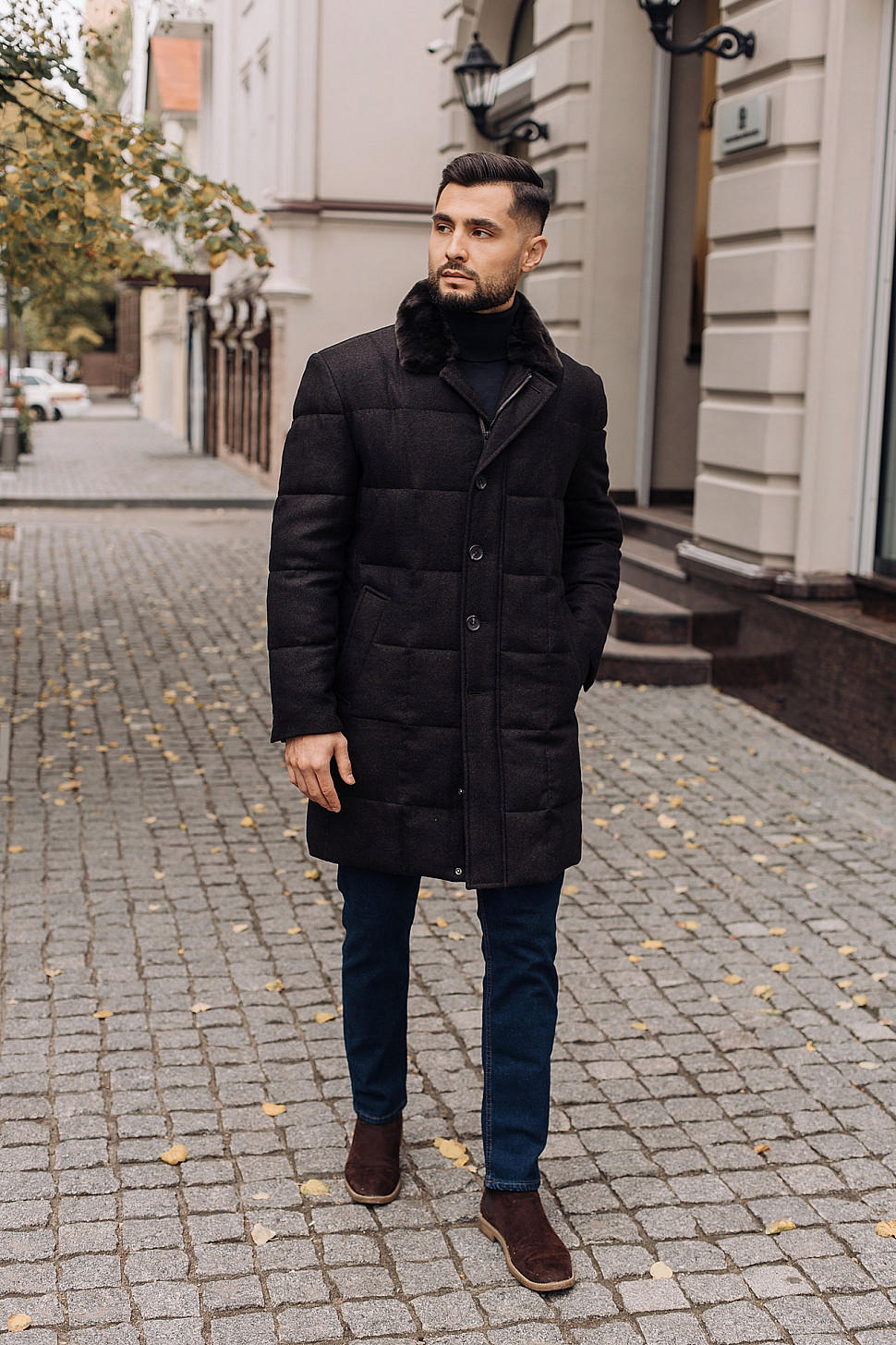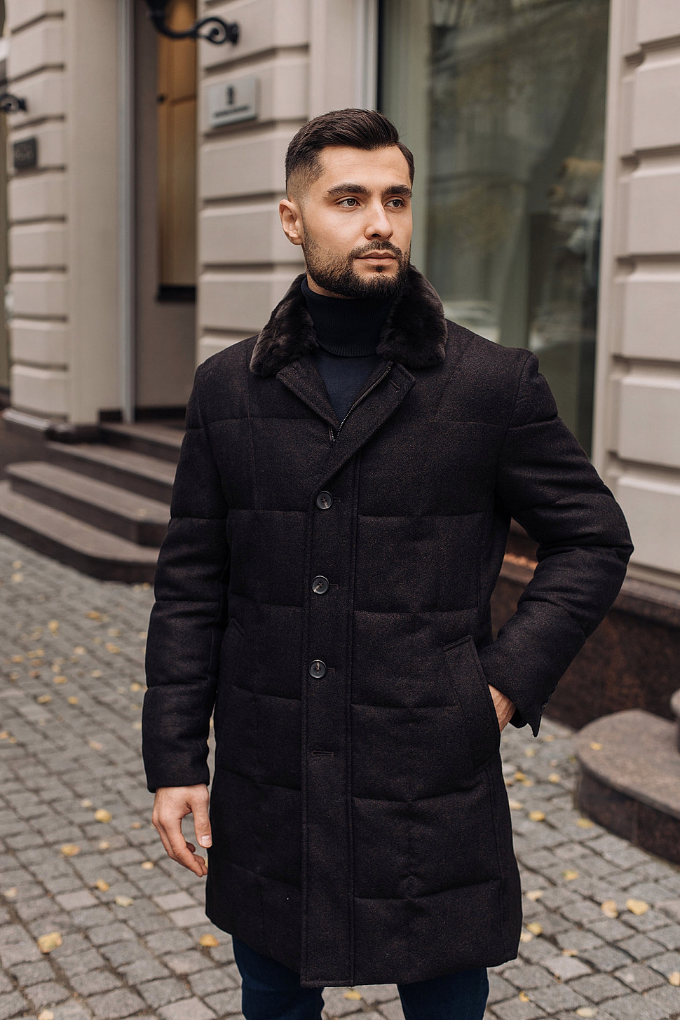 Мужская куртка темно-коричневого цвета с меховым воротником