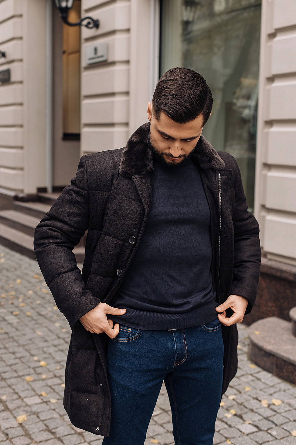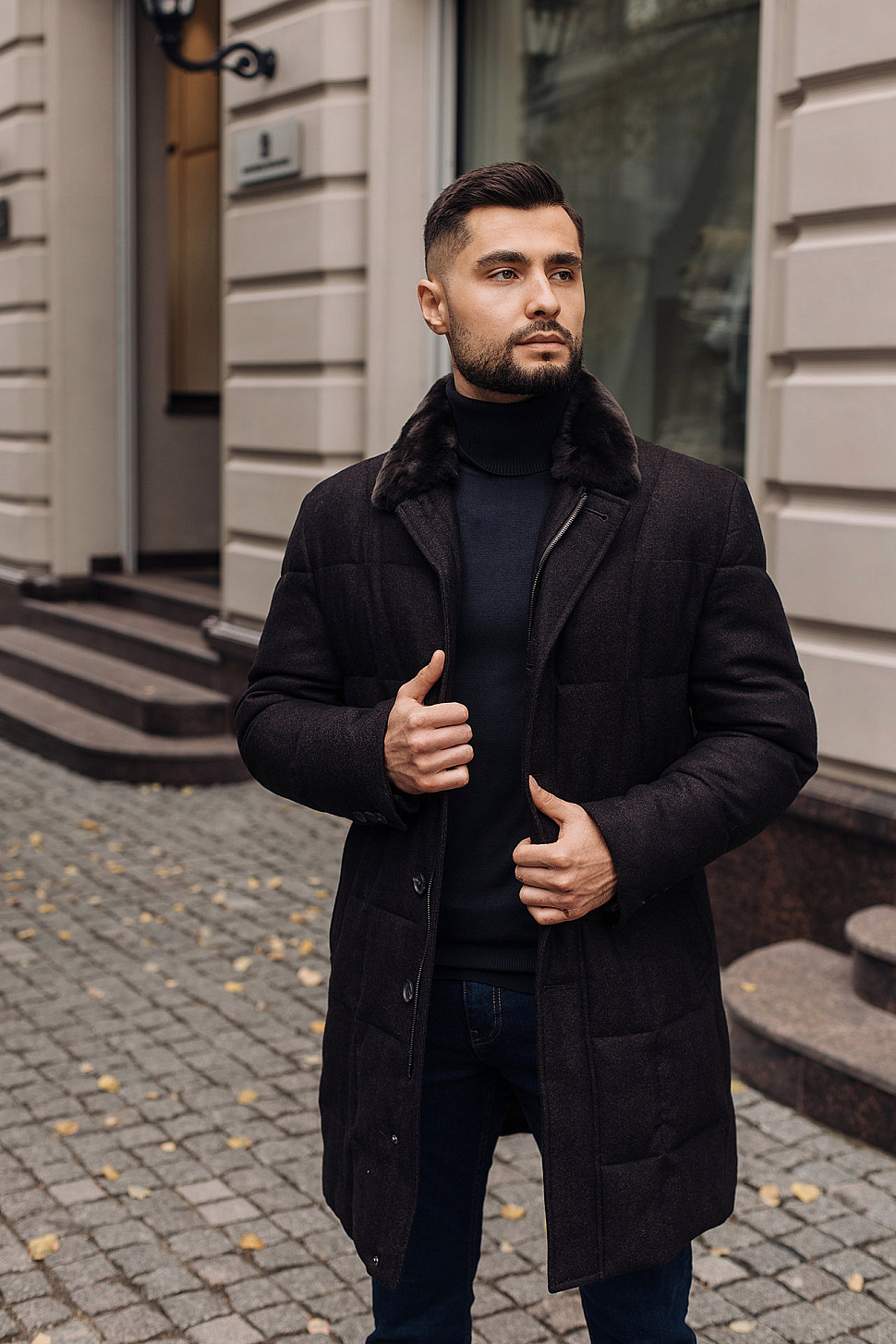 Мужская куртка темно-синего цвета с меховым воротником