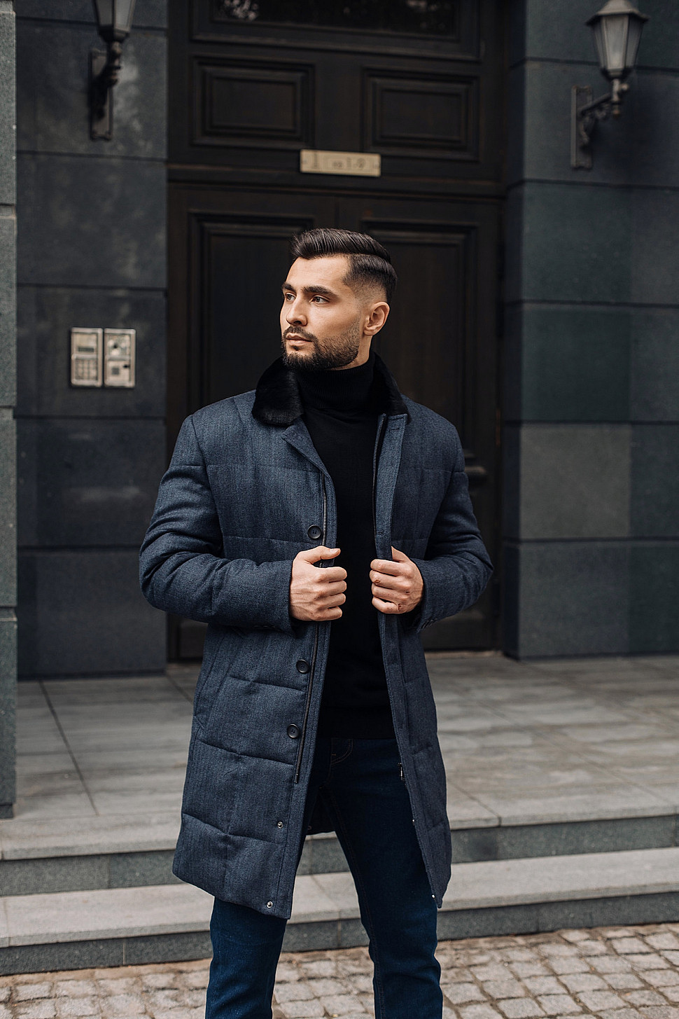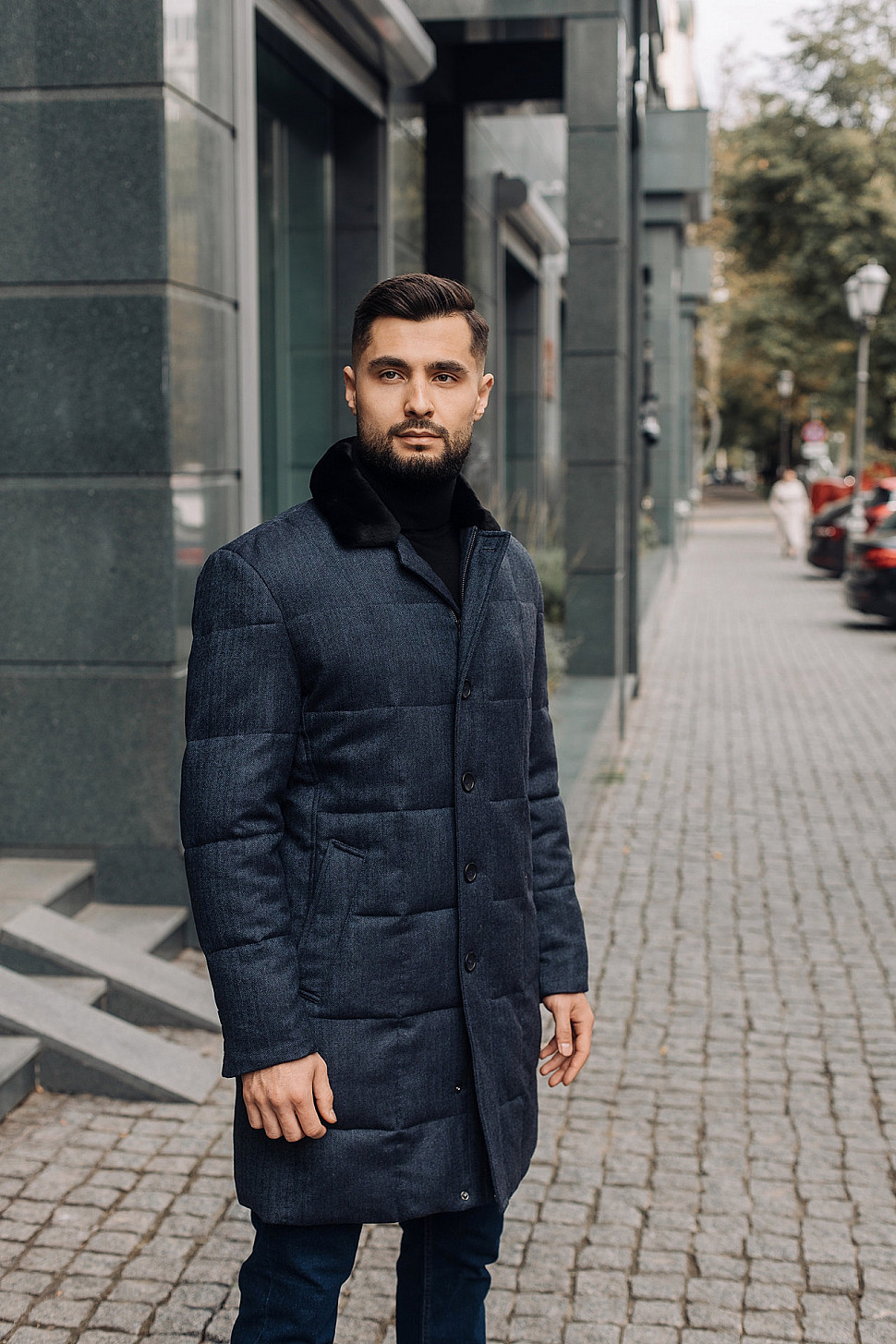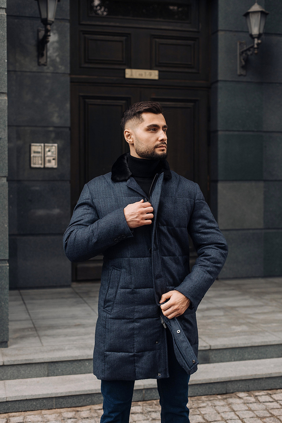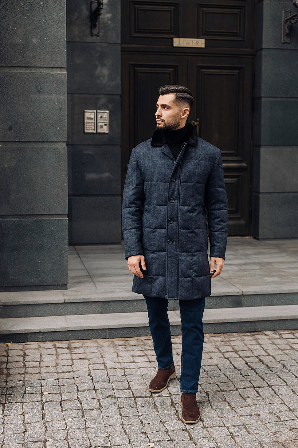 Мужская куртка темно-синего цвета с меховым воротником