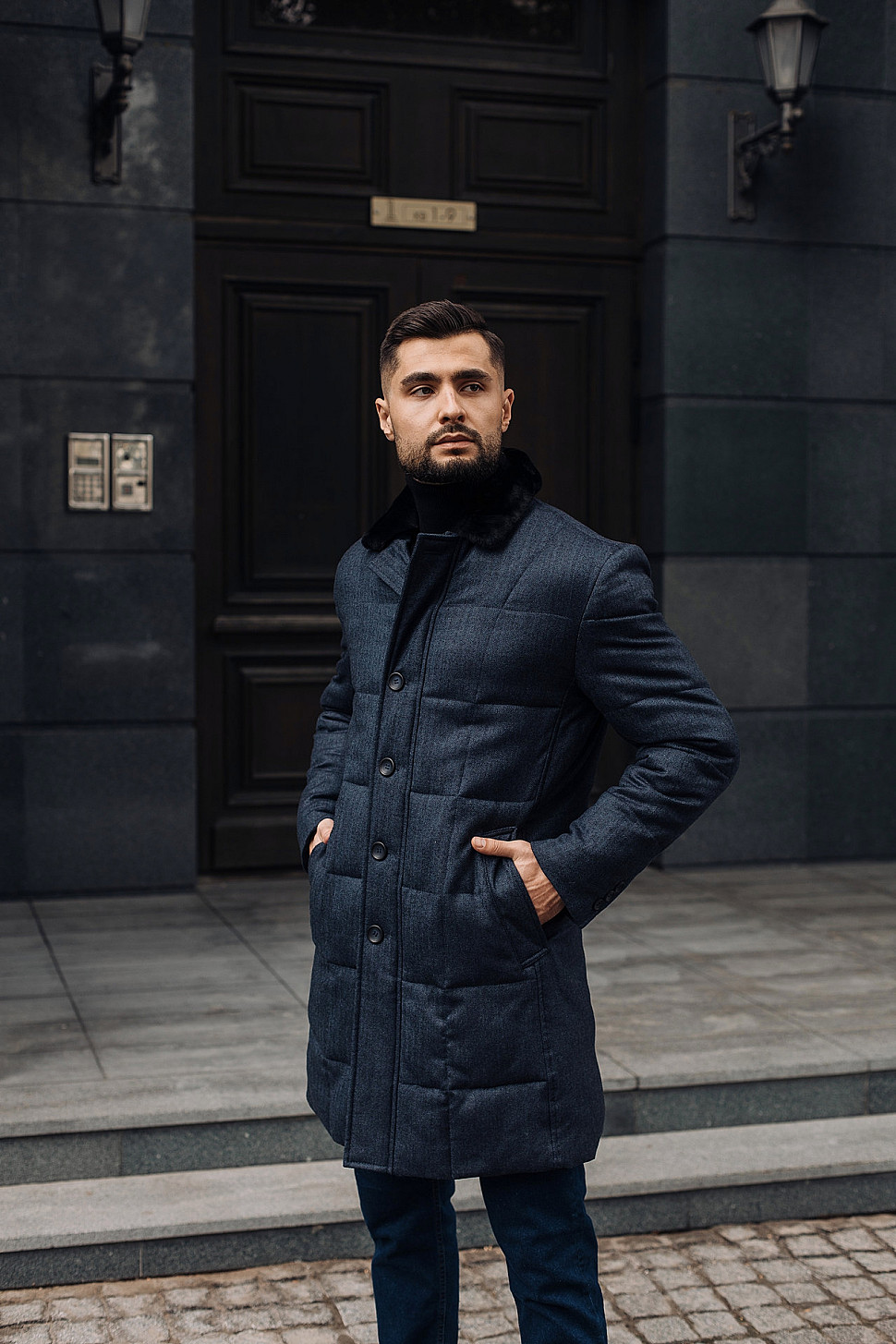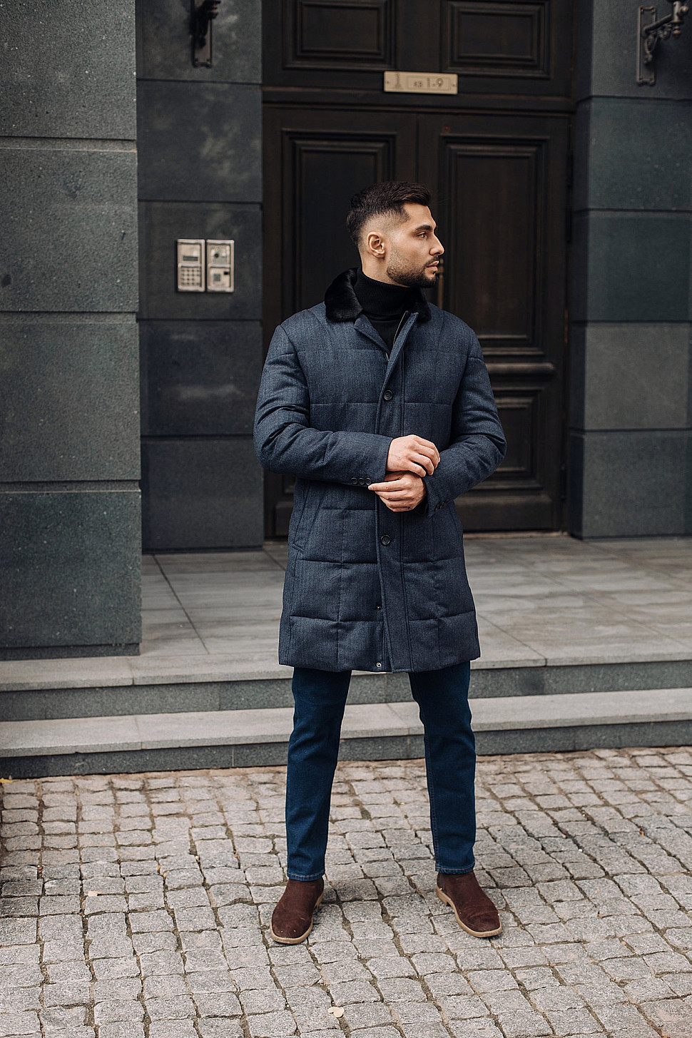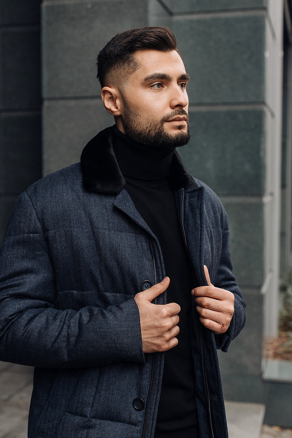 Мужская куртка темно-синего цвета с меховым воротником
