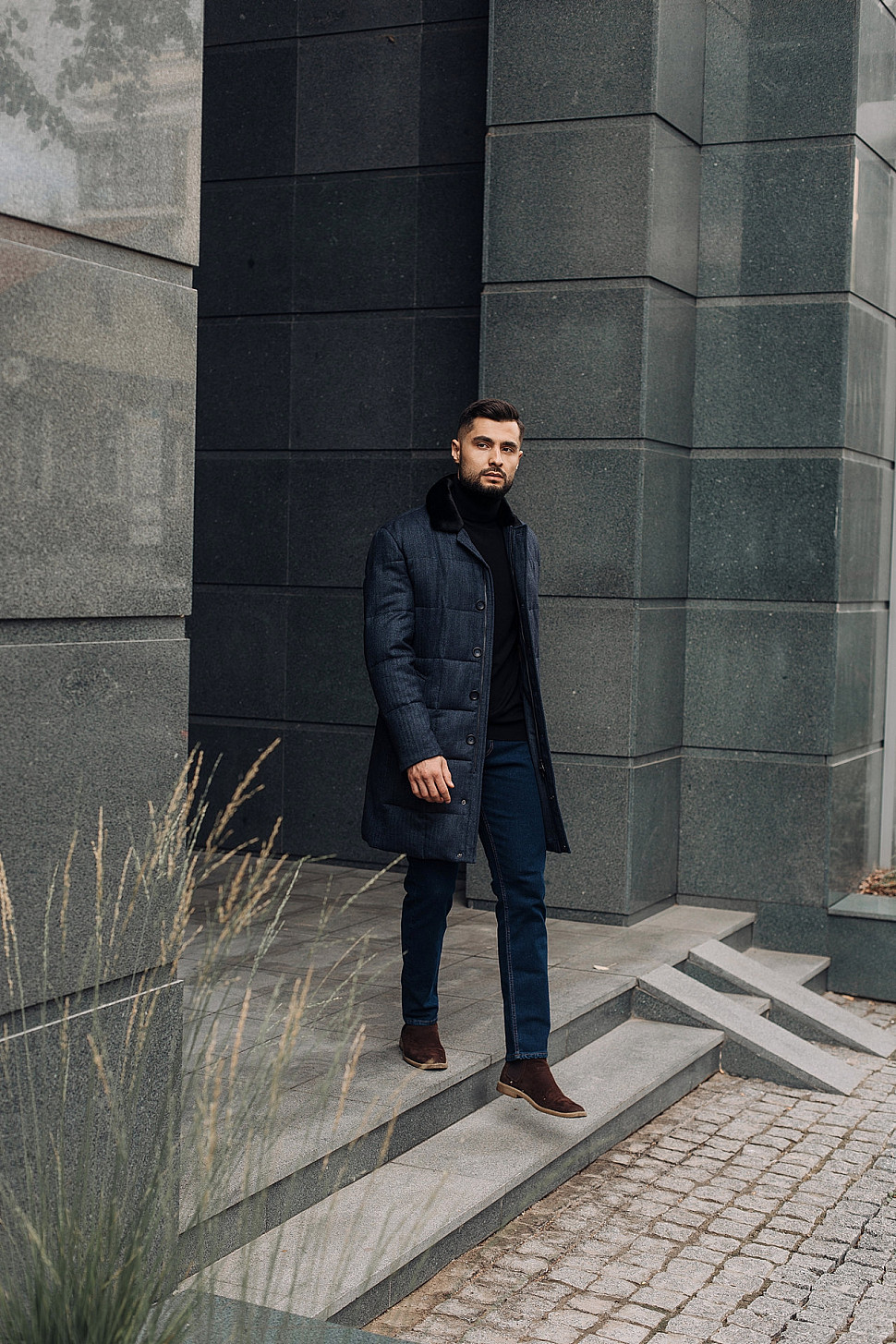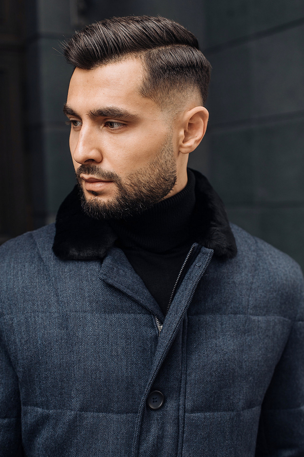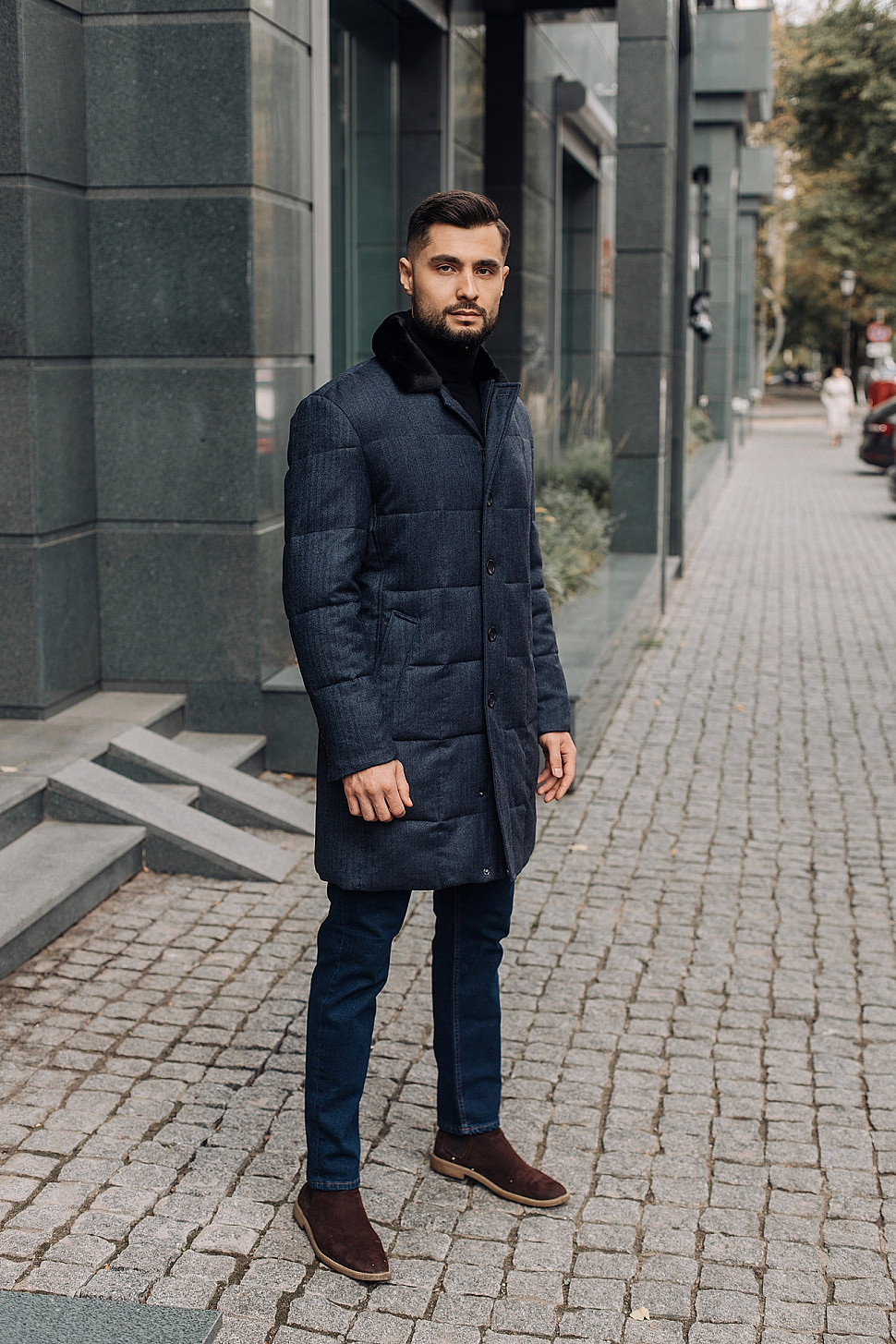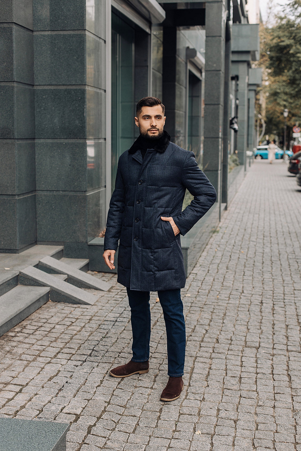Мужская куртка темно-синего цвета с меховым воротником