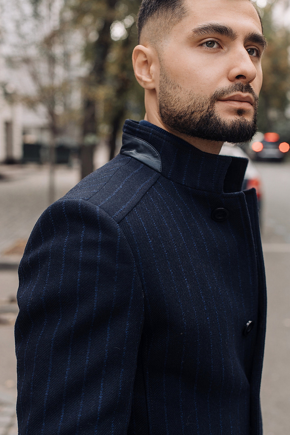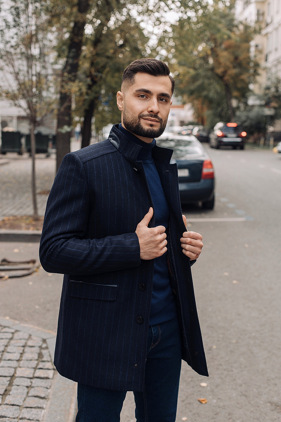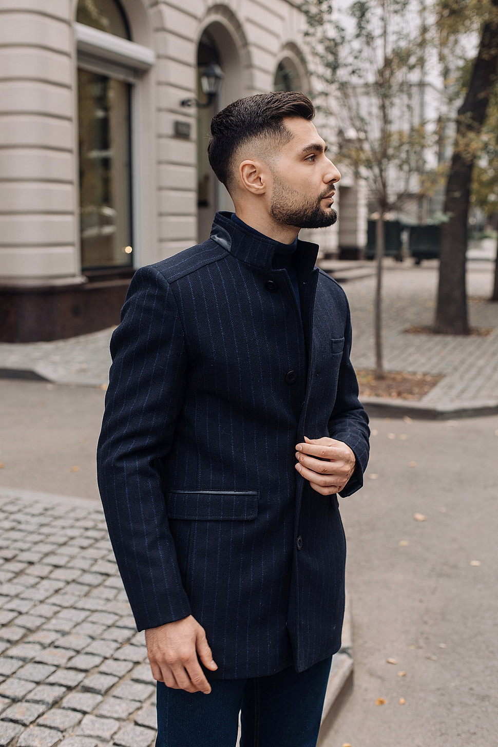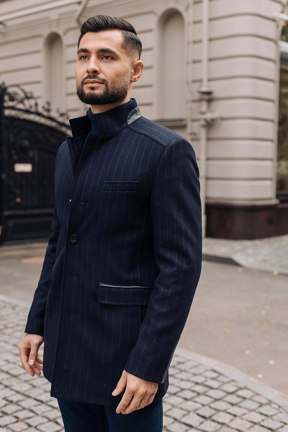 Мужское пальто черного цвета в синюю полоску