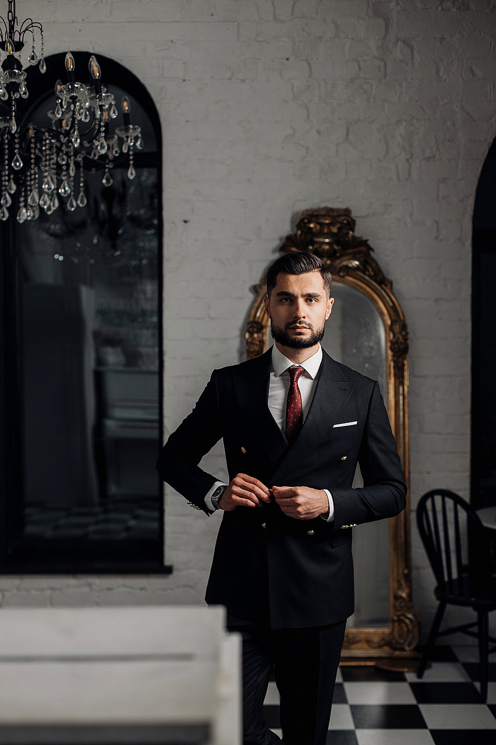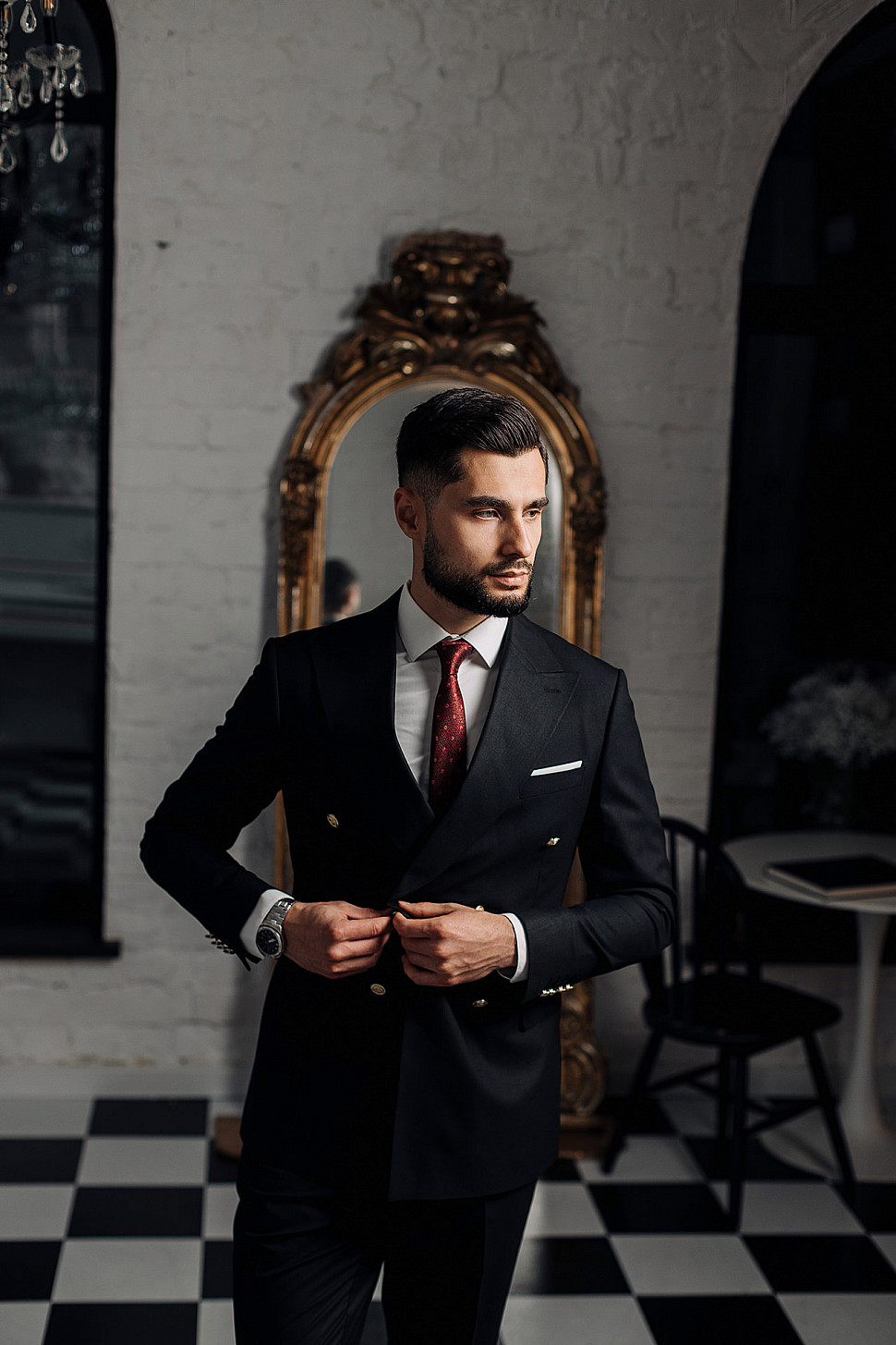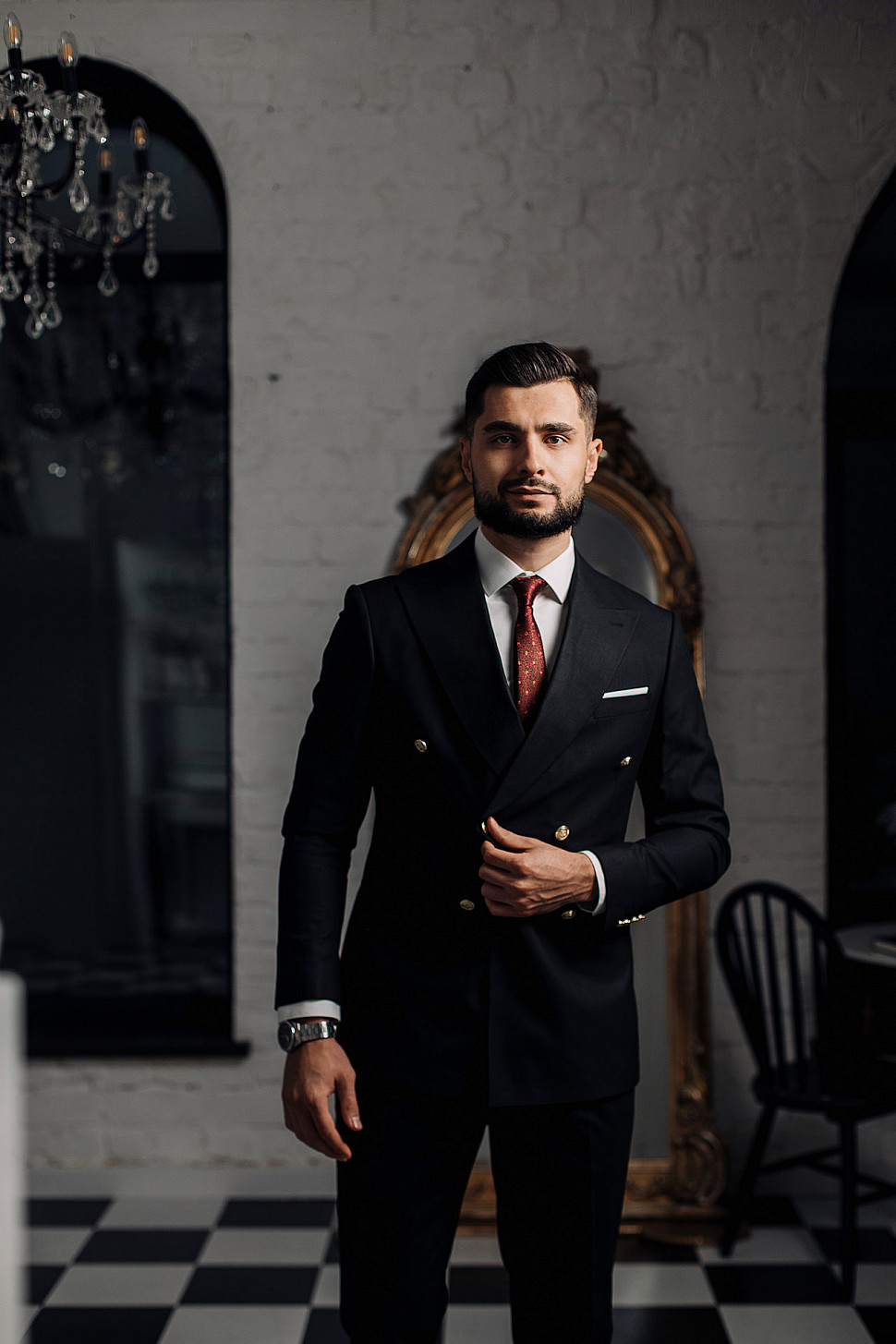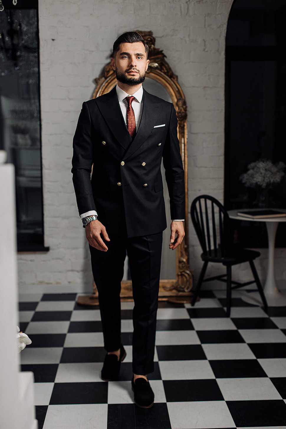 Мужской костюм двойка темно-синий двубортный с золотыми пуговицами