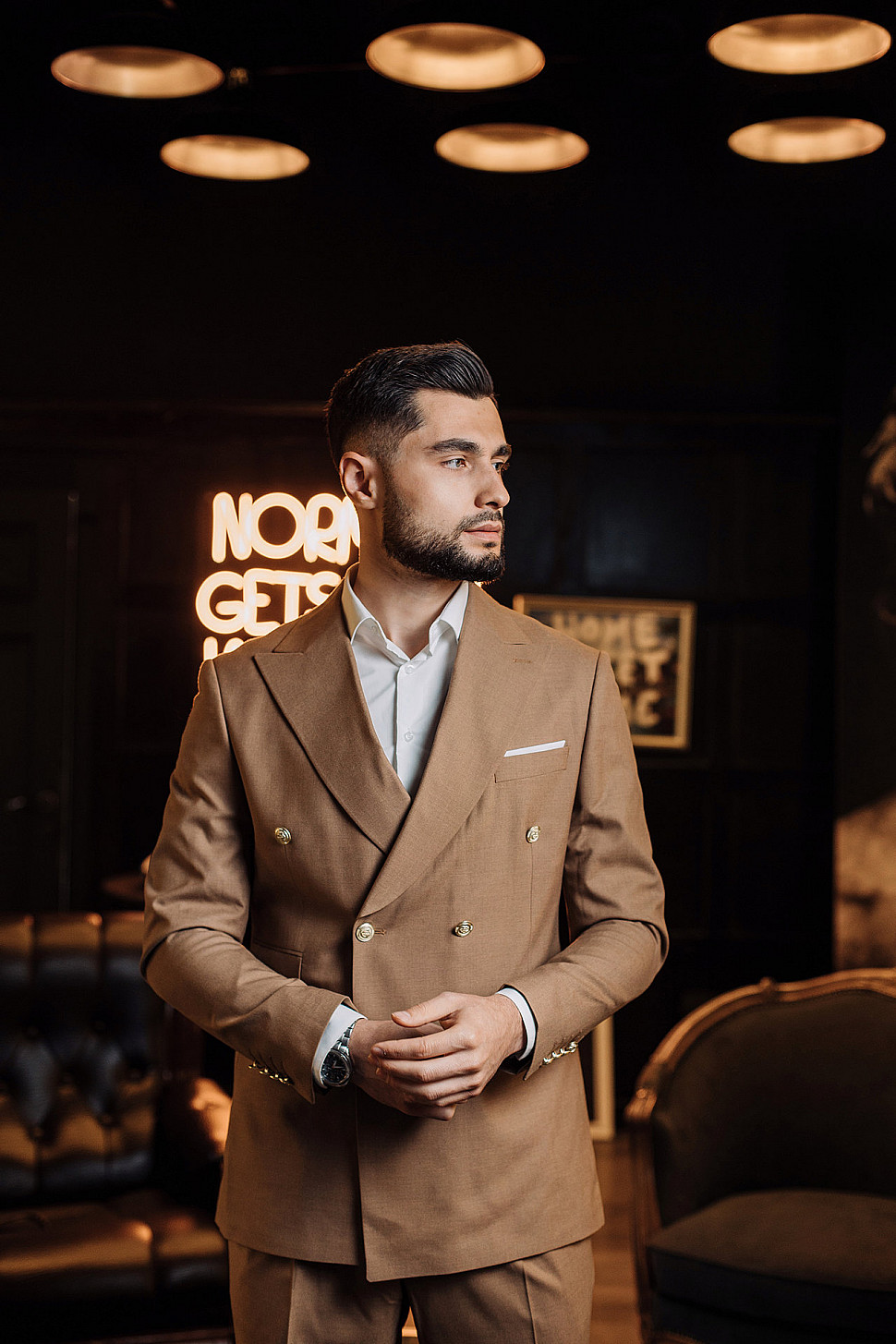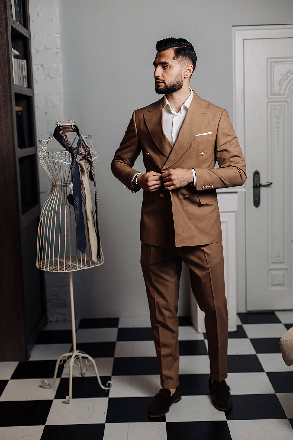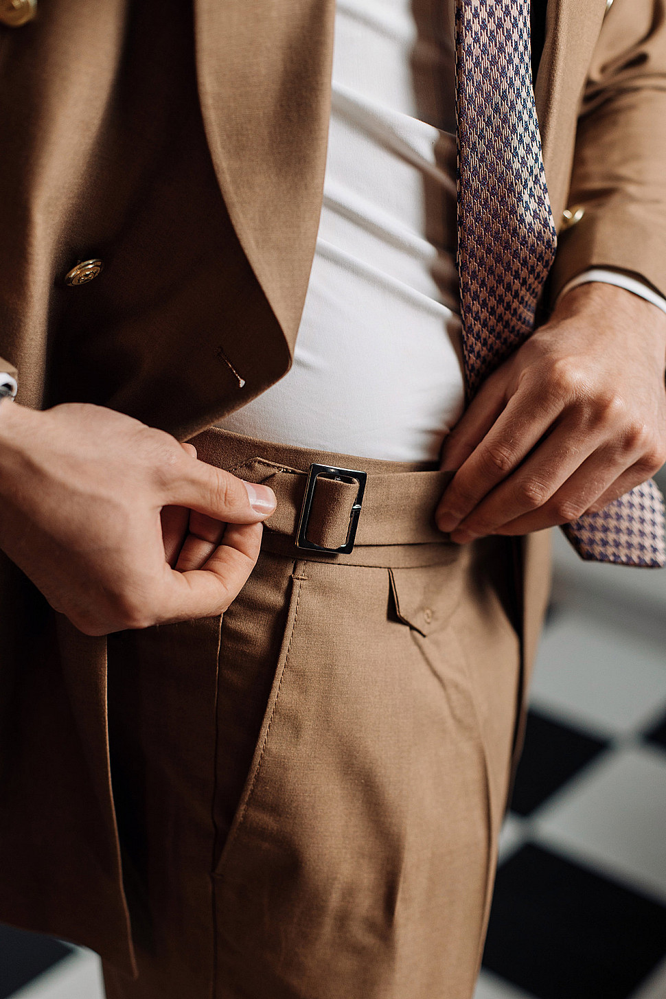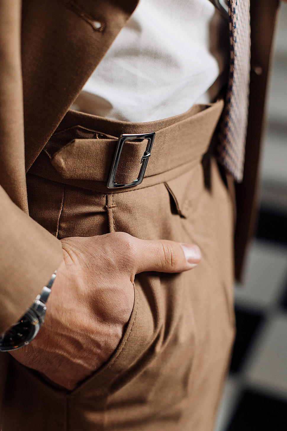 Костюм светло-коричневый двойка в клетку, повседневный и классический образ