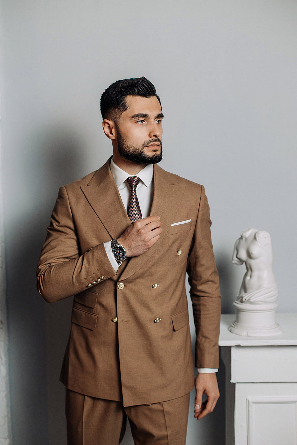 Мужской костюм тройка коричневого цвета текстурный
