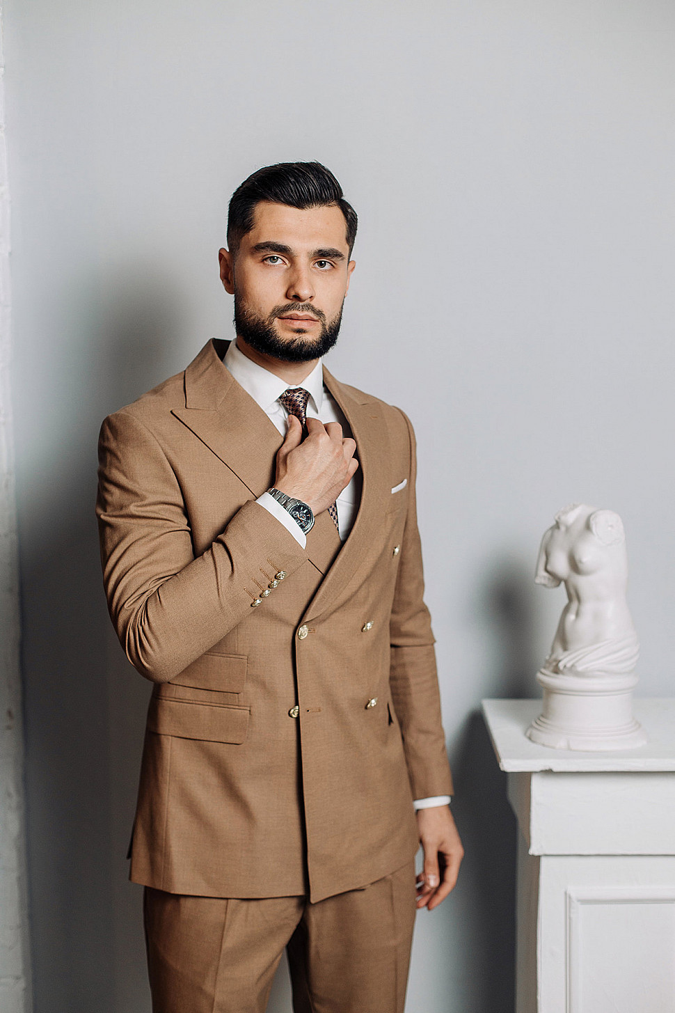 Костюм бежевый тройка с коричневым галстуком