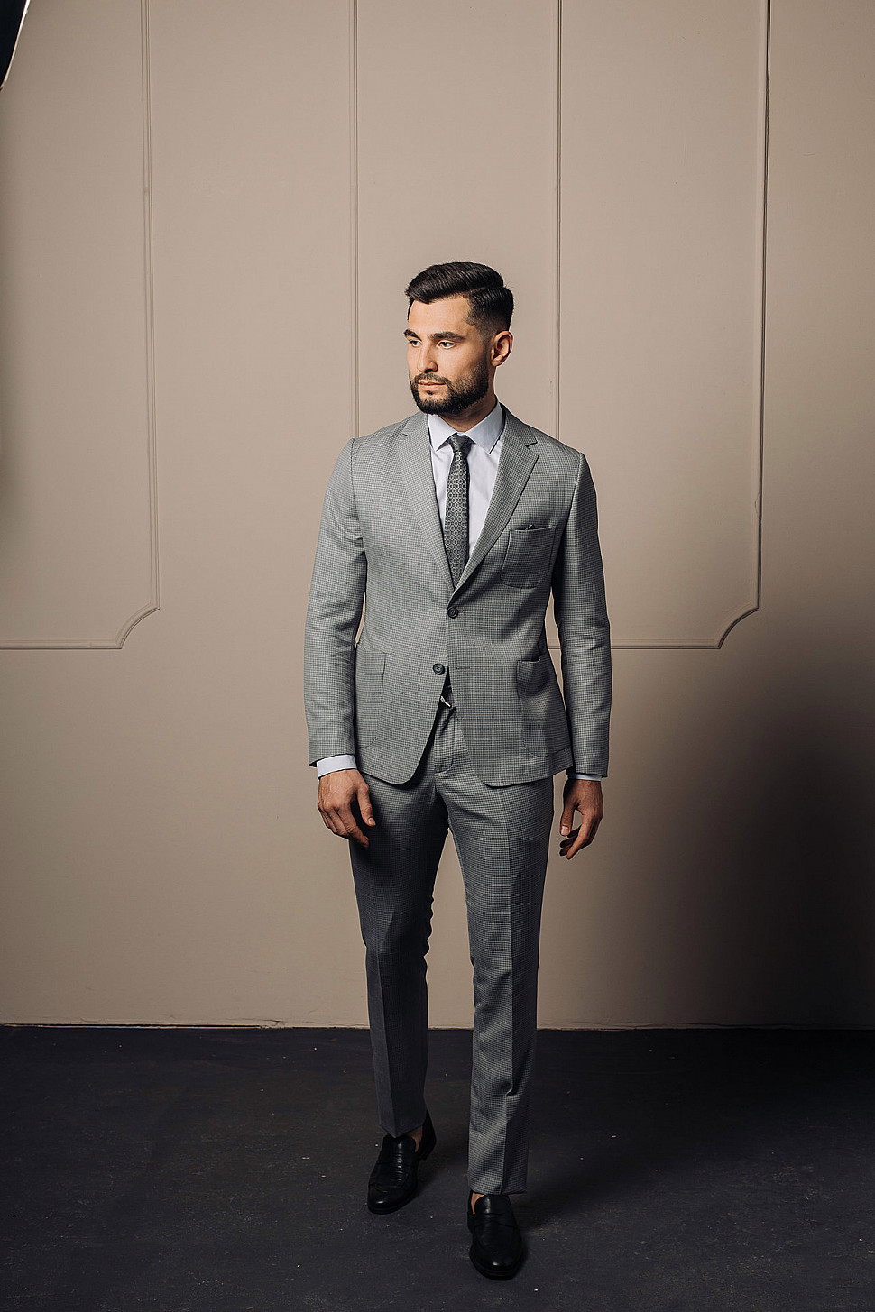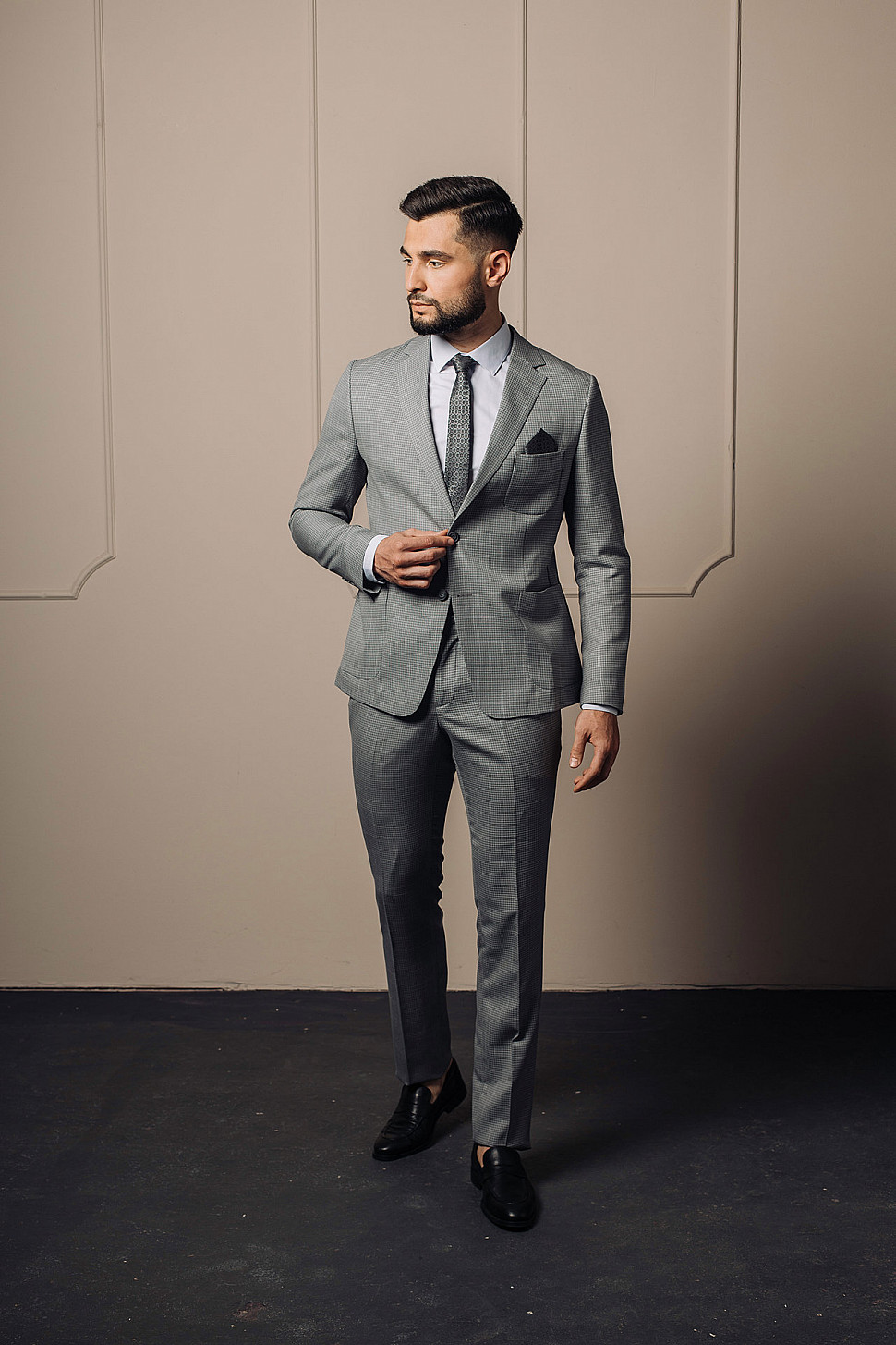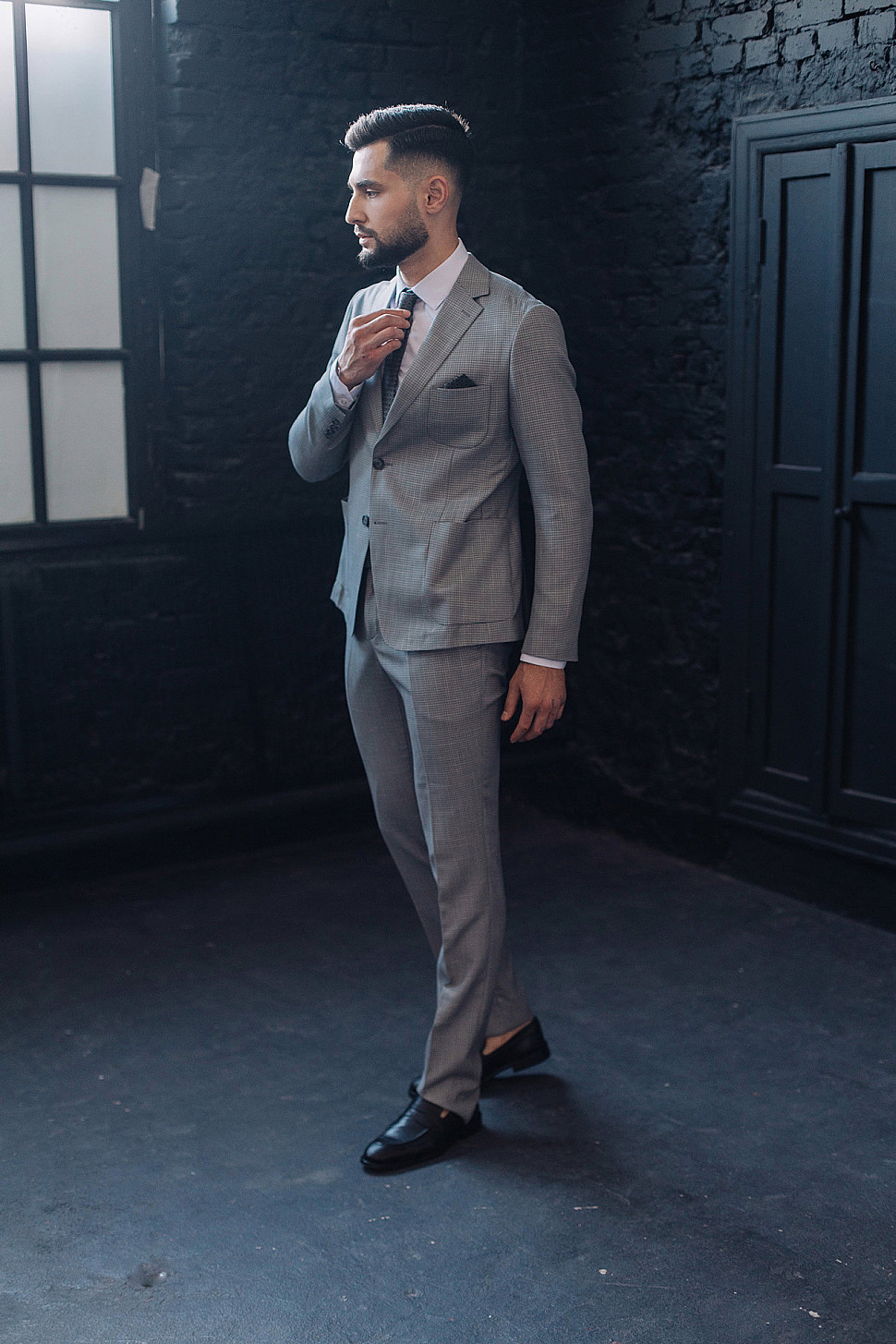 Мужской костюм двойка серого цвета в мелкую клетку с накладными карманами