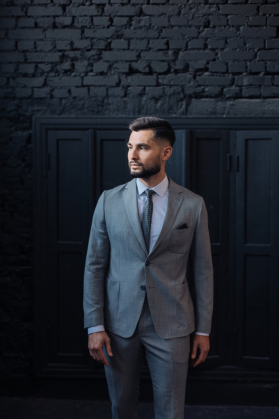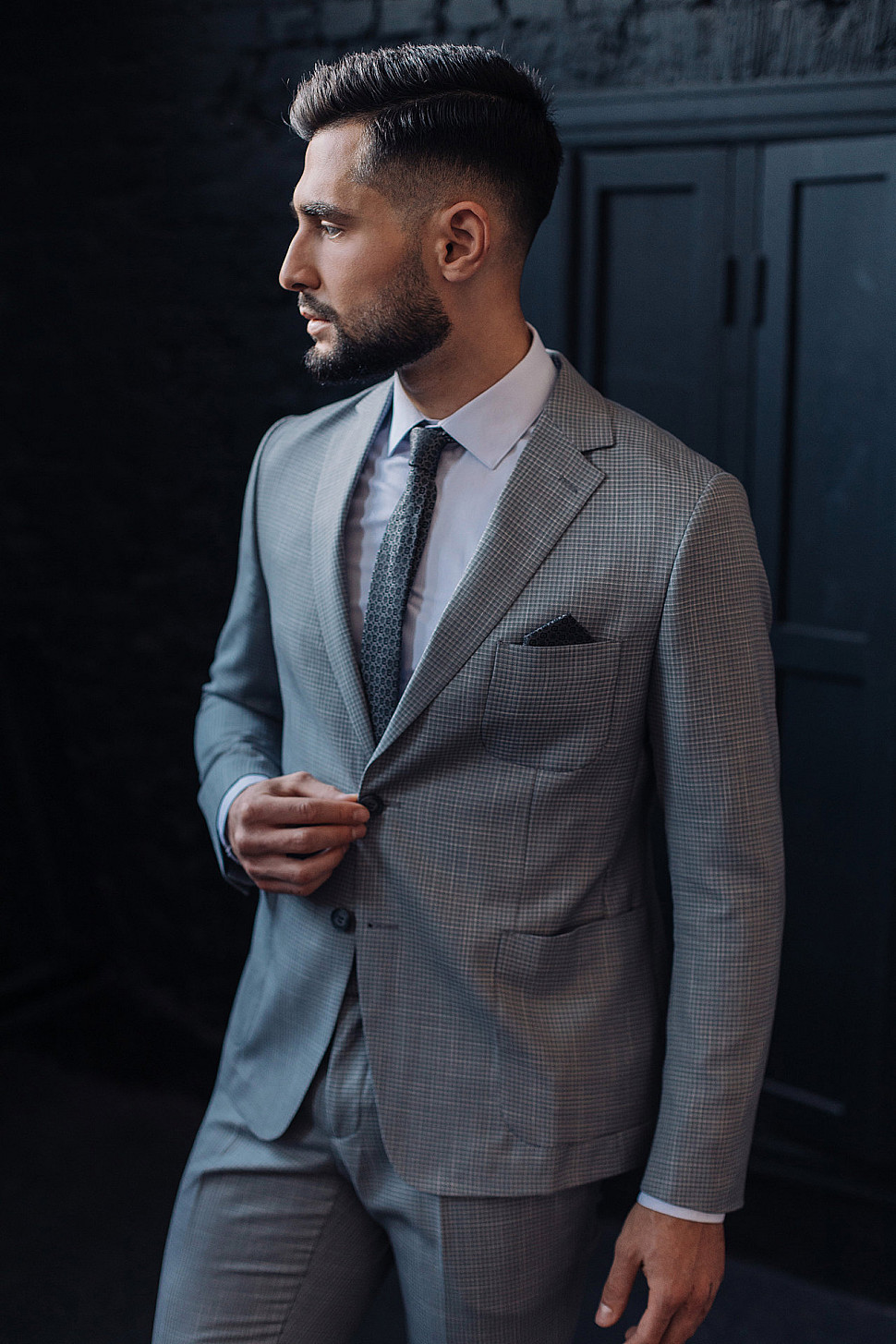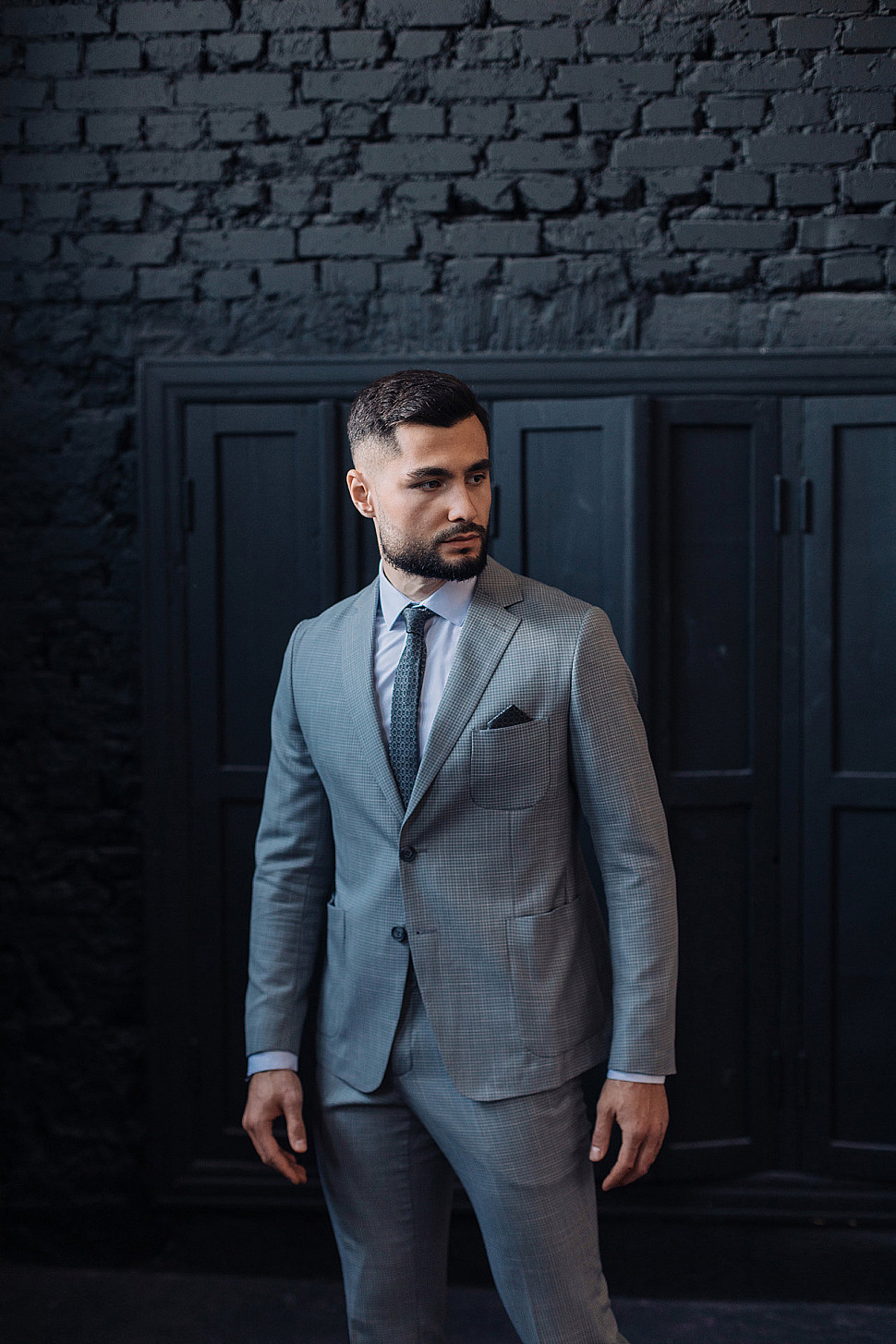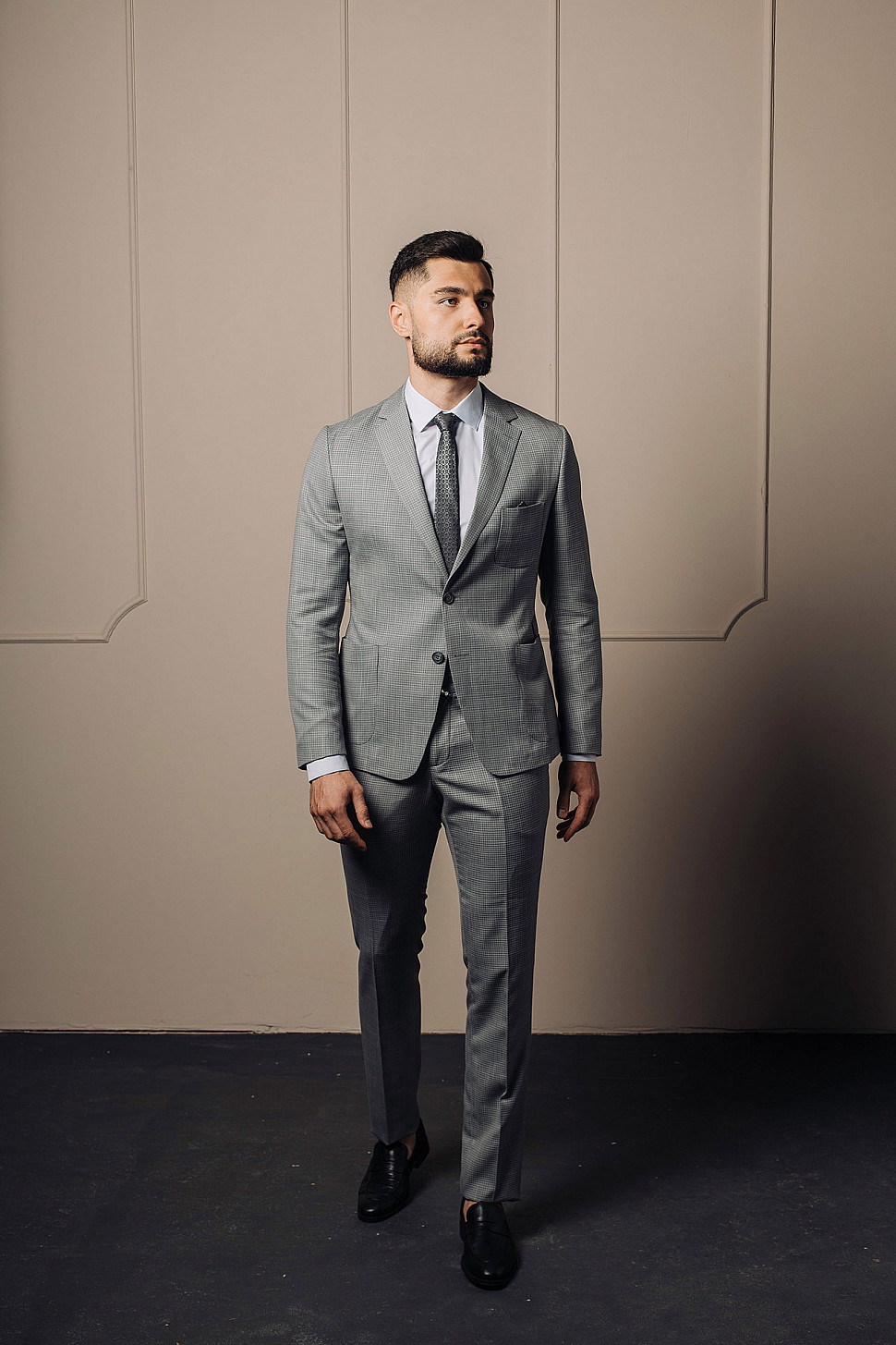 Мужской костюм двойка серого цвета в мелкую клетку с накладными карманами