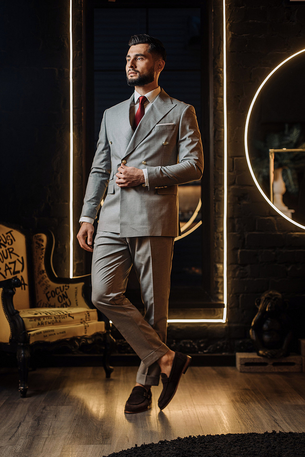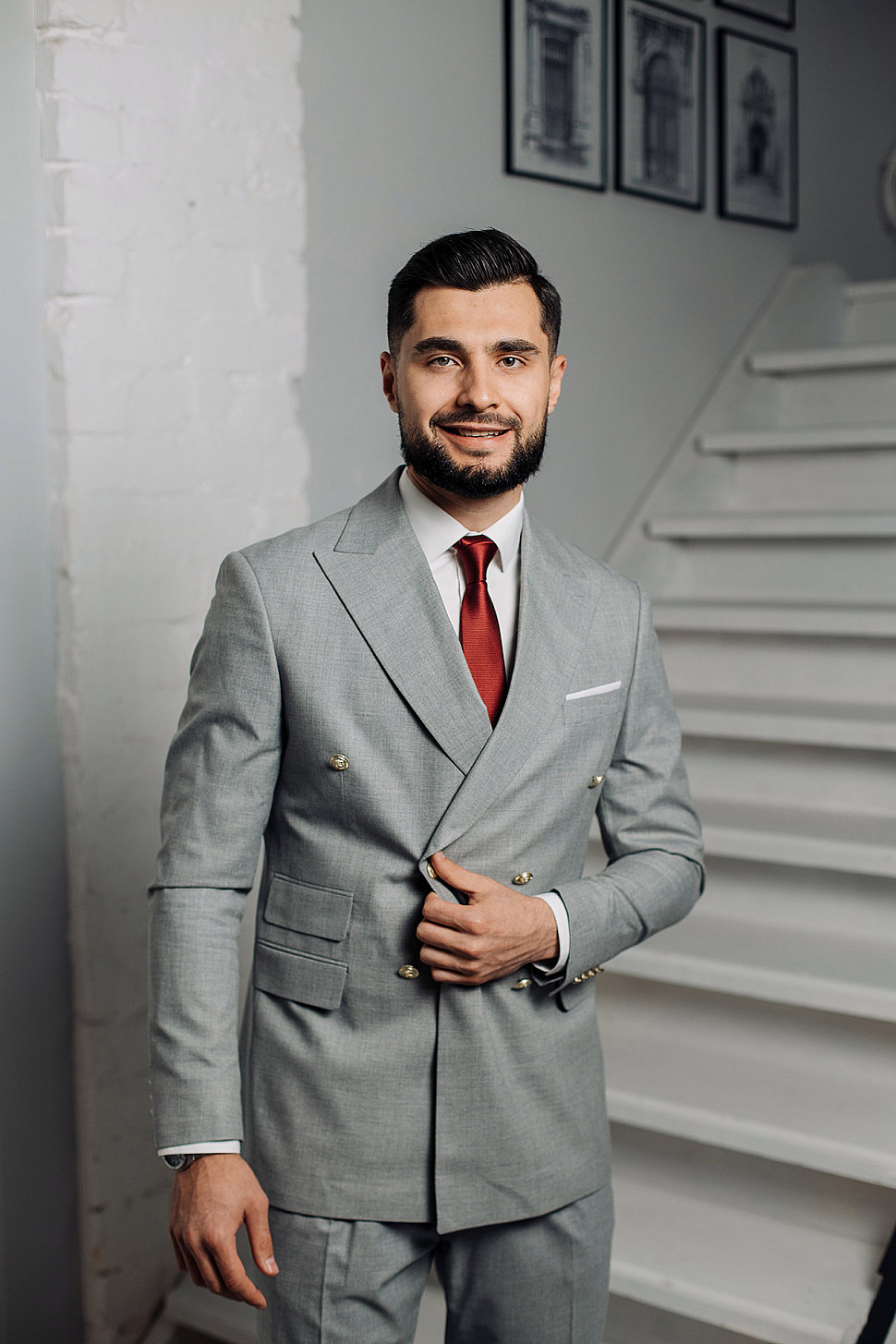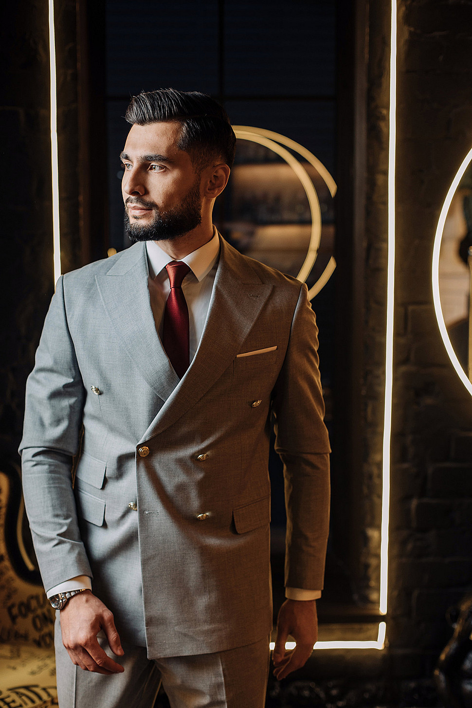 Мужской костюм двойка серый двубортный с золотыми пуговицами