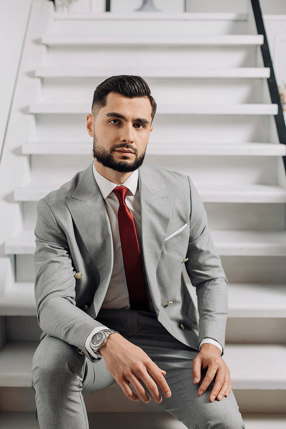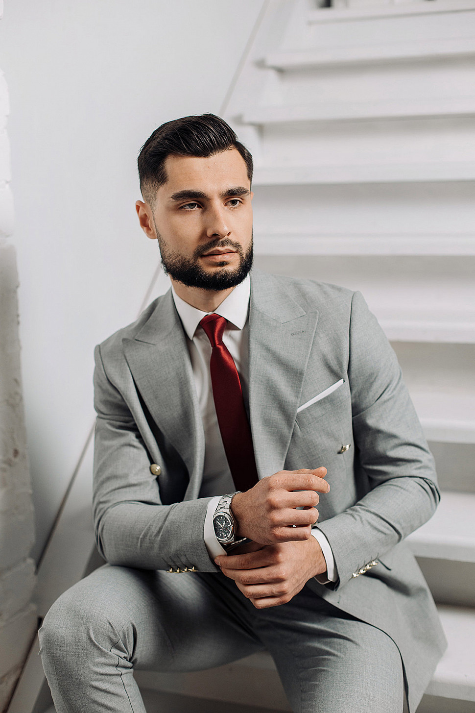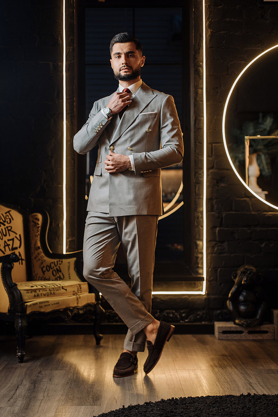 Мужской костюм двойка серый двубортный с золотыми пуговицами