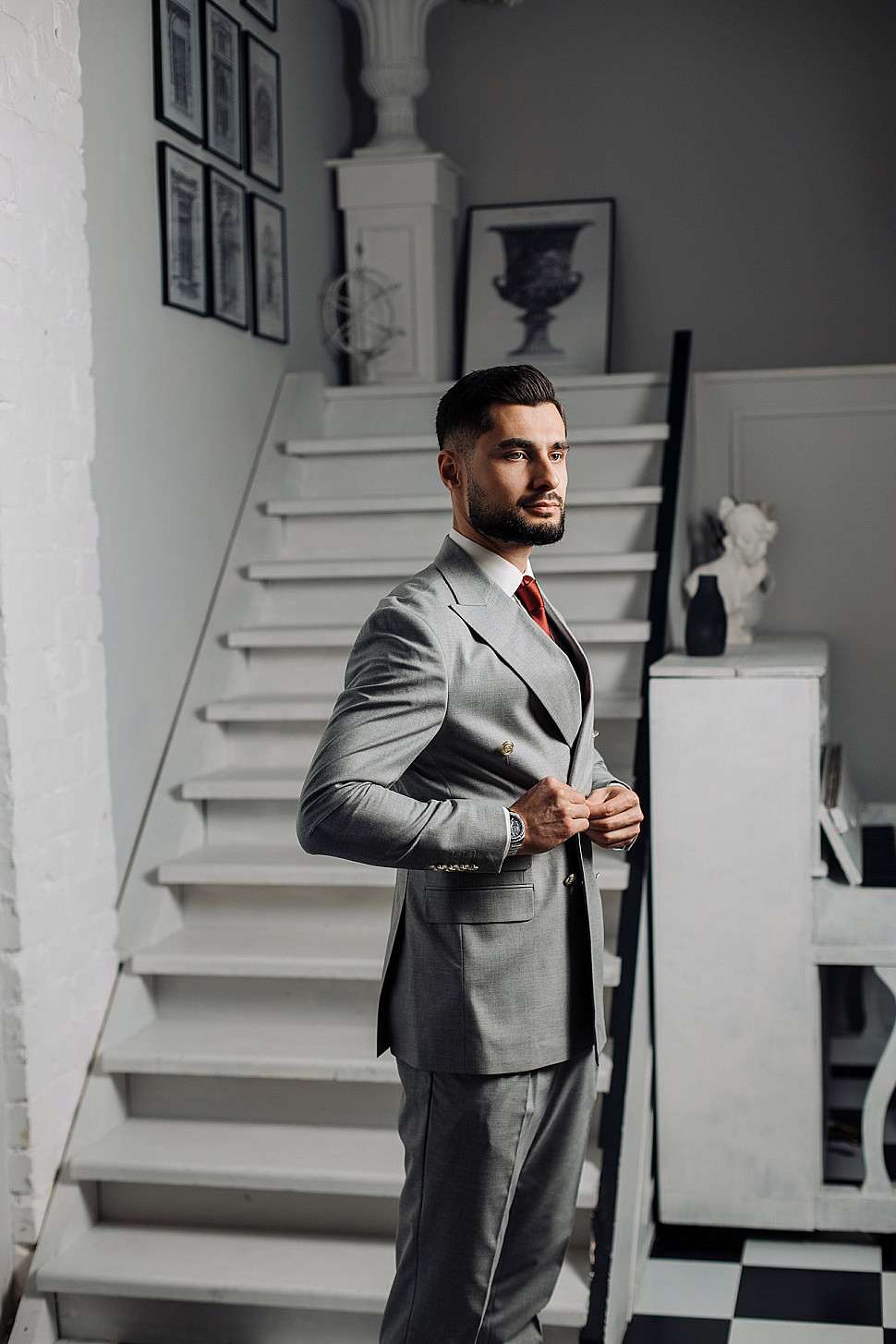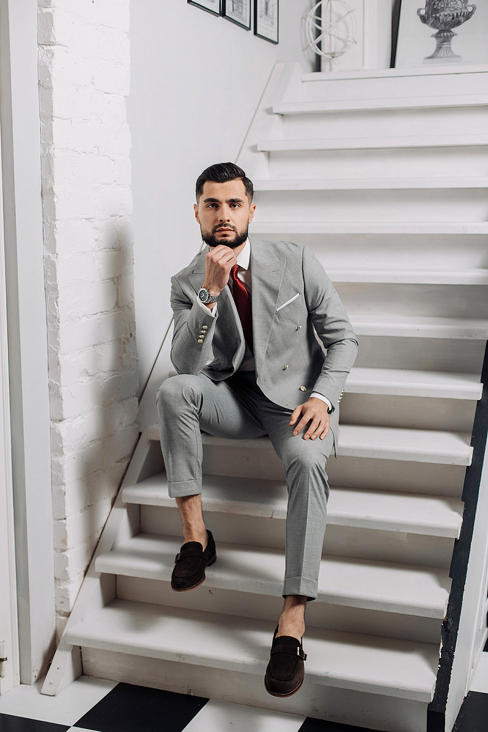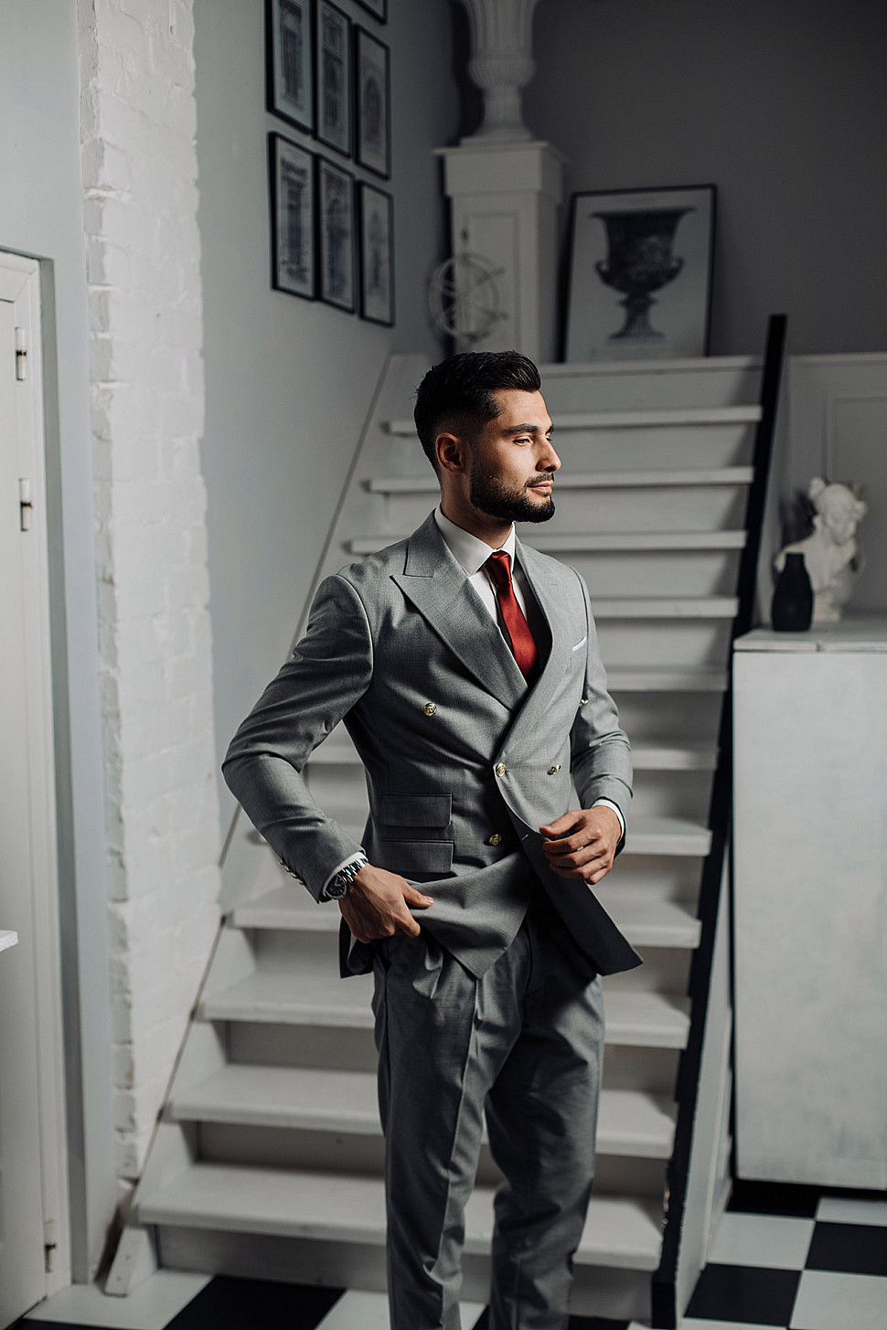 Мужской костюм тройка черного цвета и сноуборд
