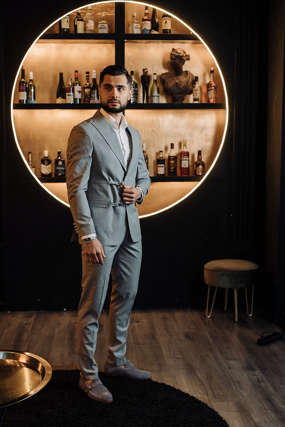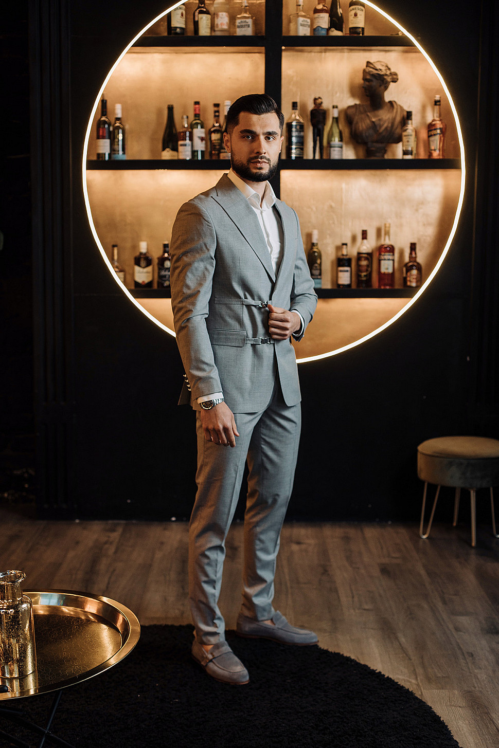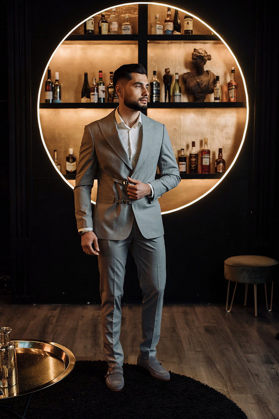 Мужской костюм двойка серый двубортный с золотыми пуговицами