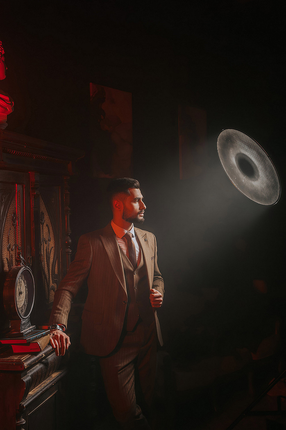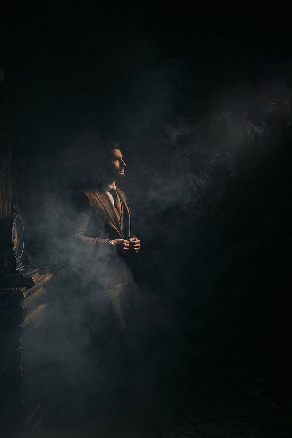 Мужской костюм тройка черного цвета и сноуборд