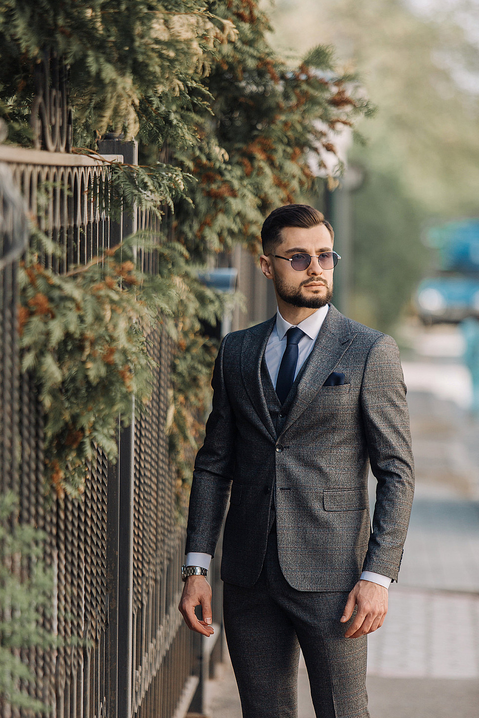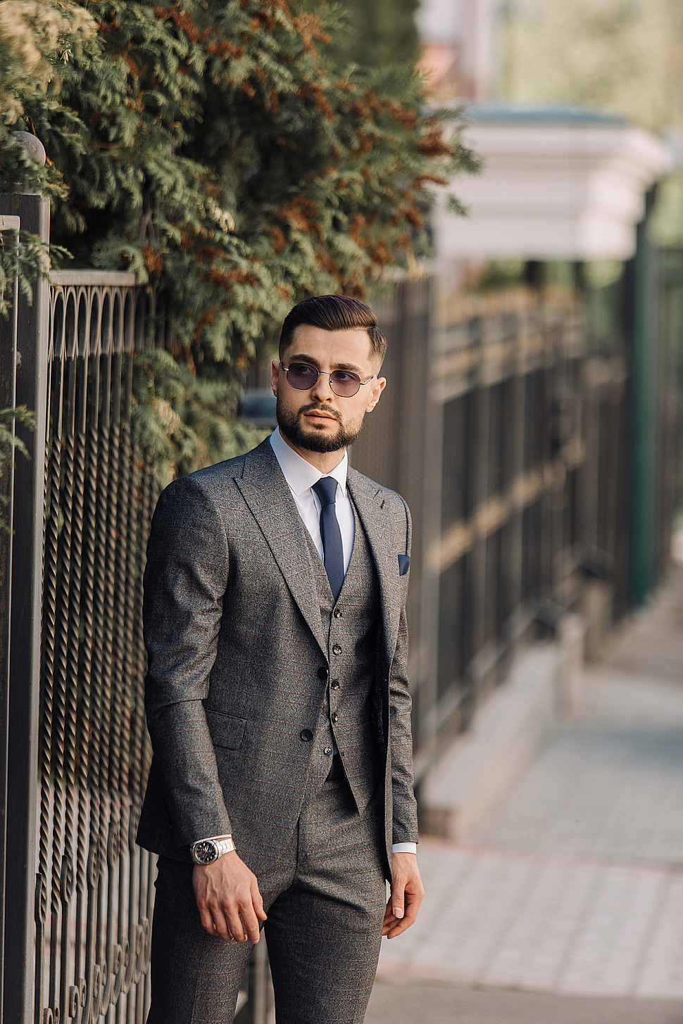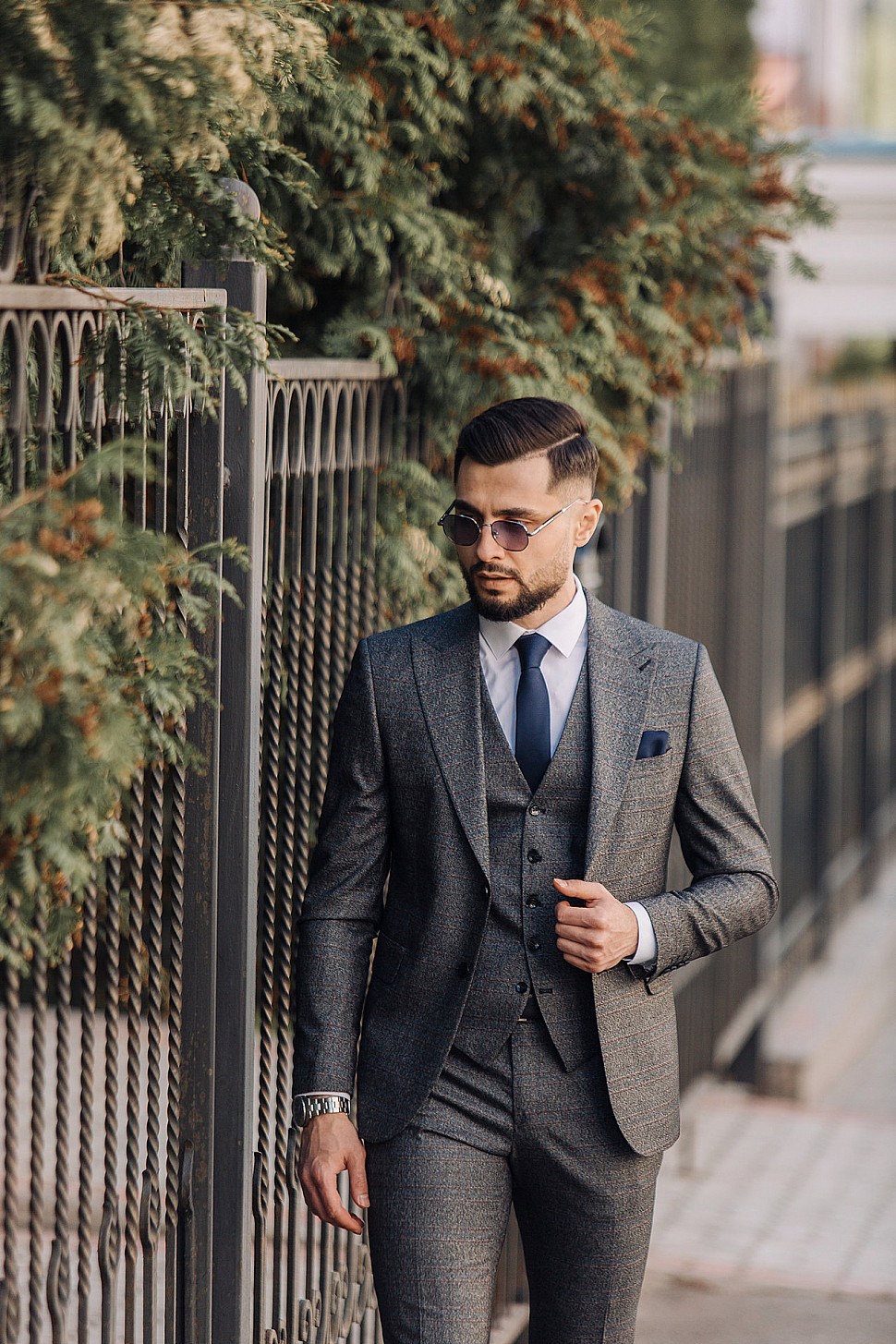 Мужской костюм двойка серого цвета в мелкую клетку с накладными карманами