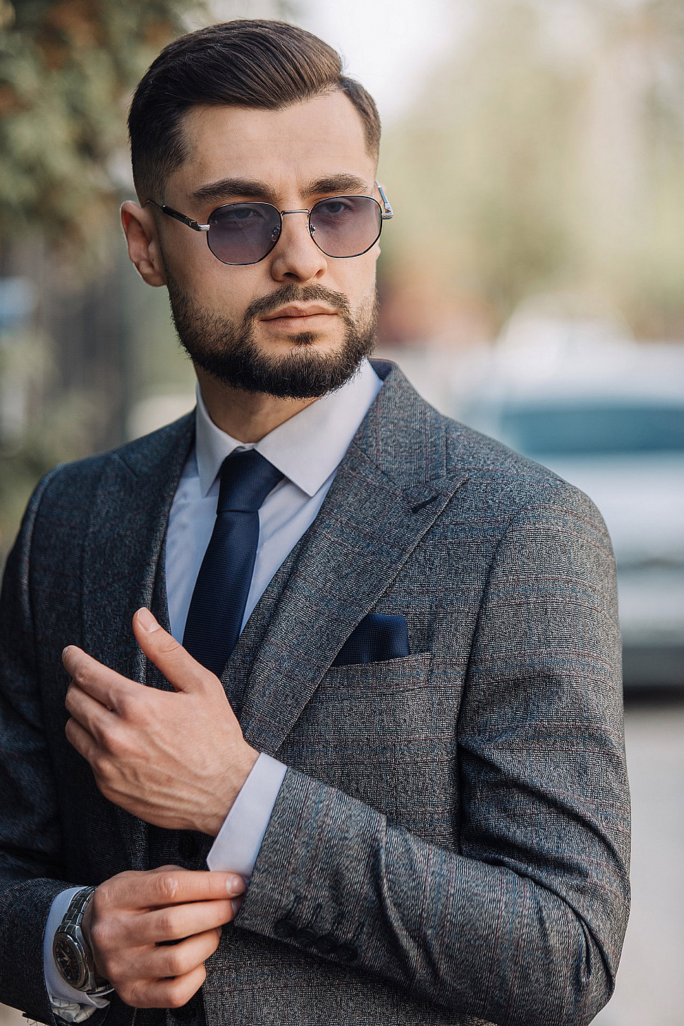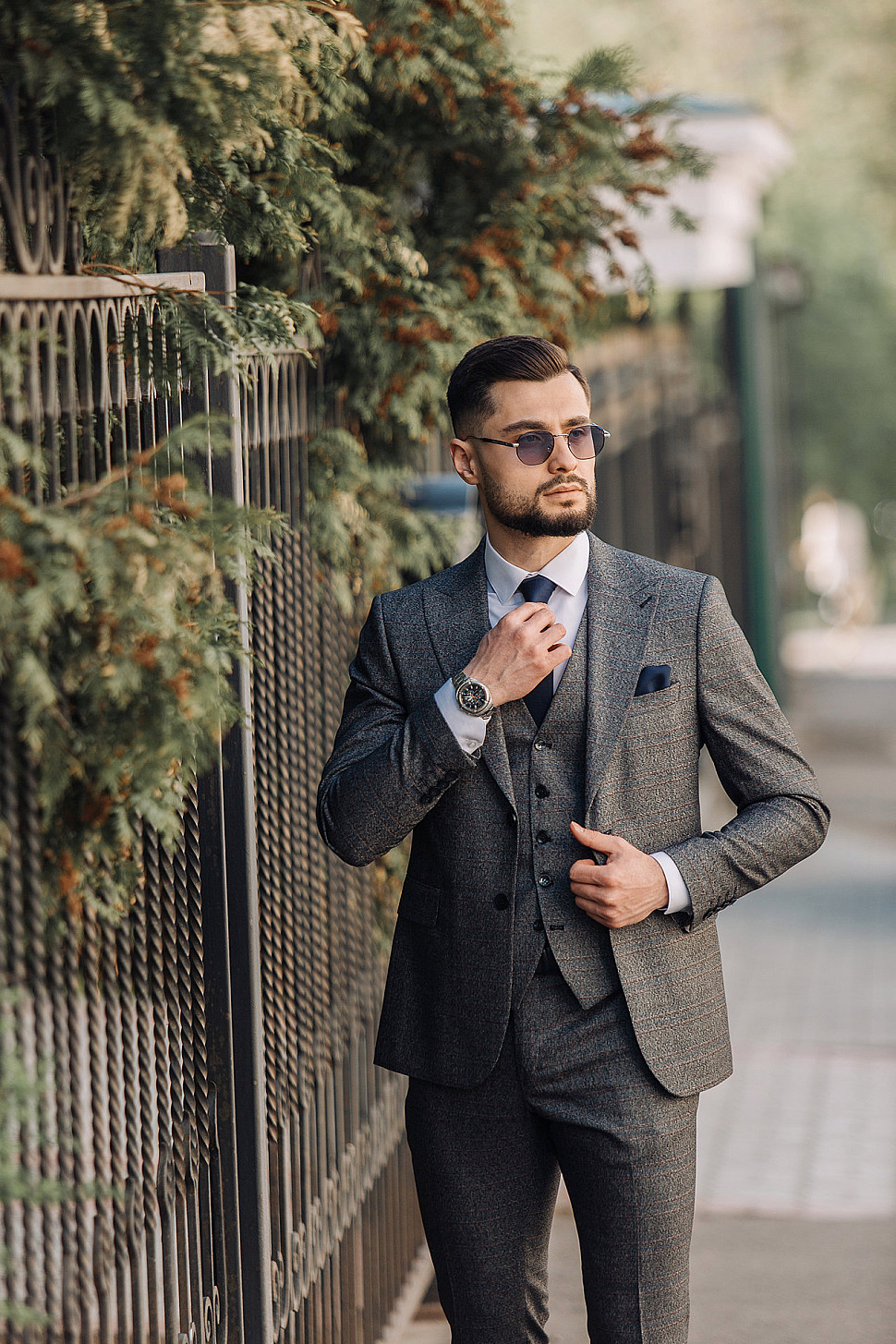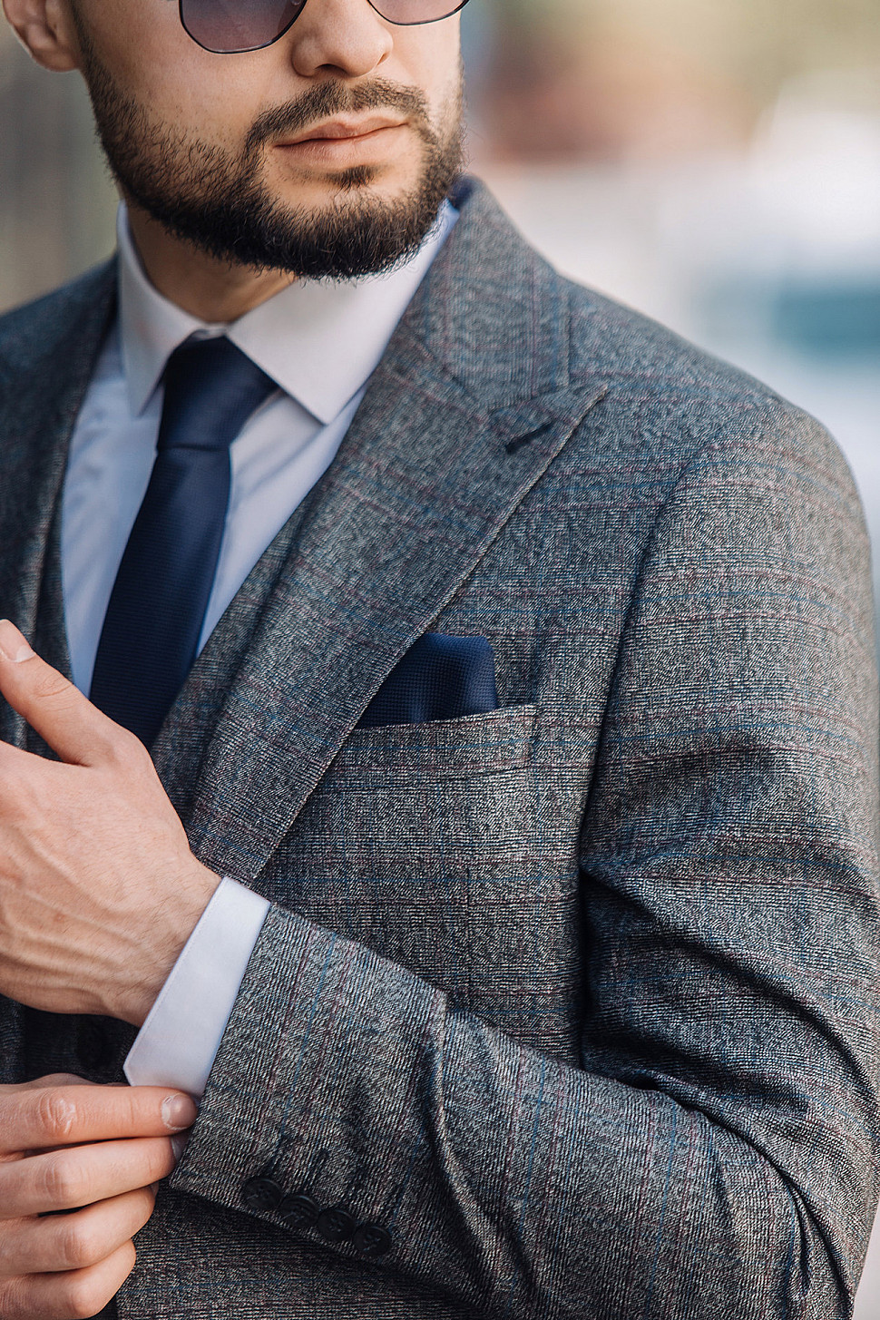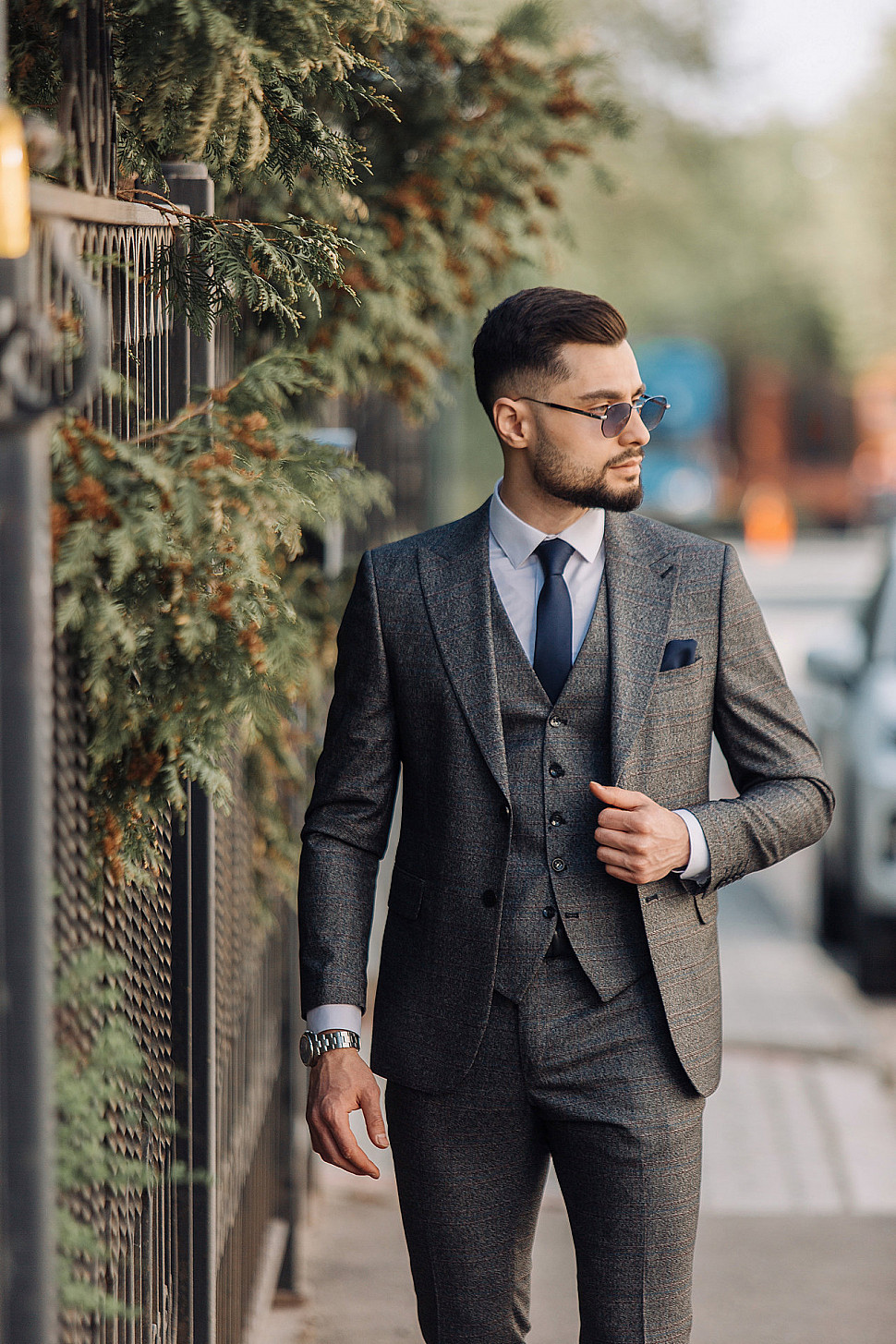 Мужской костюм двойка серого цвета в мелкую клетку с накладными карманами