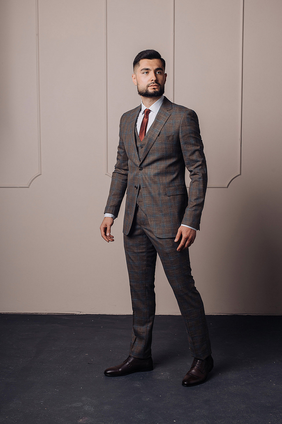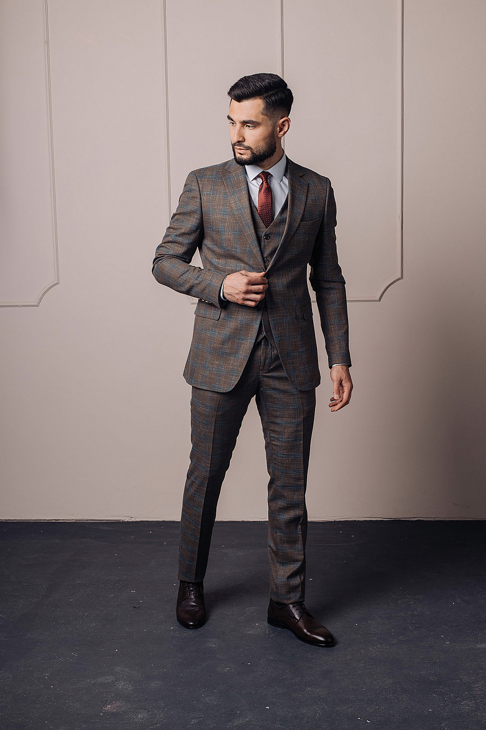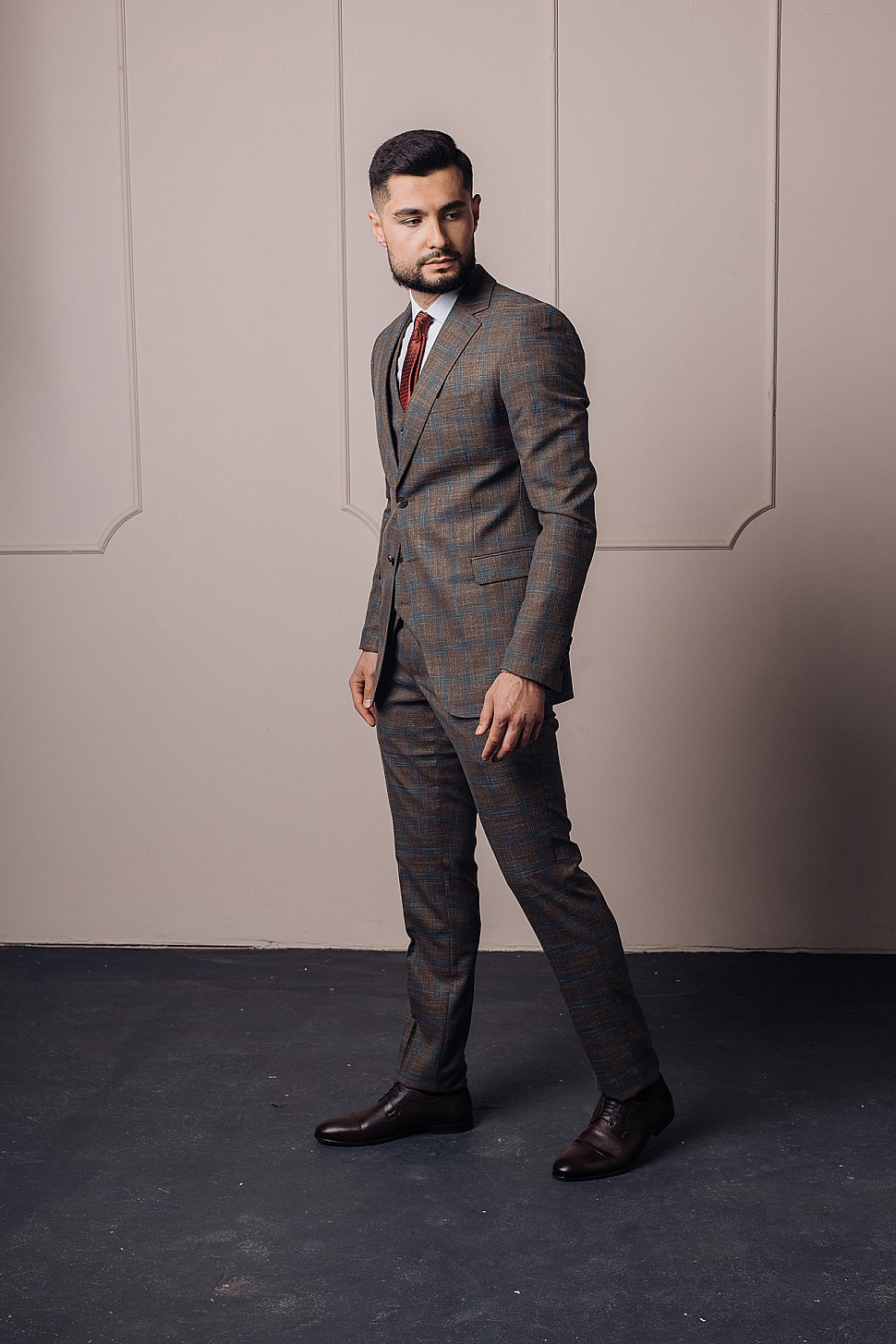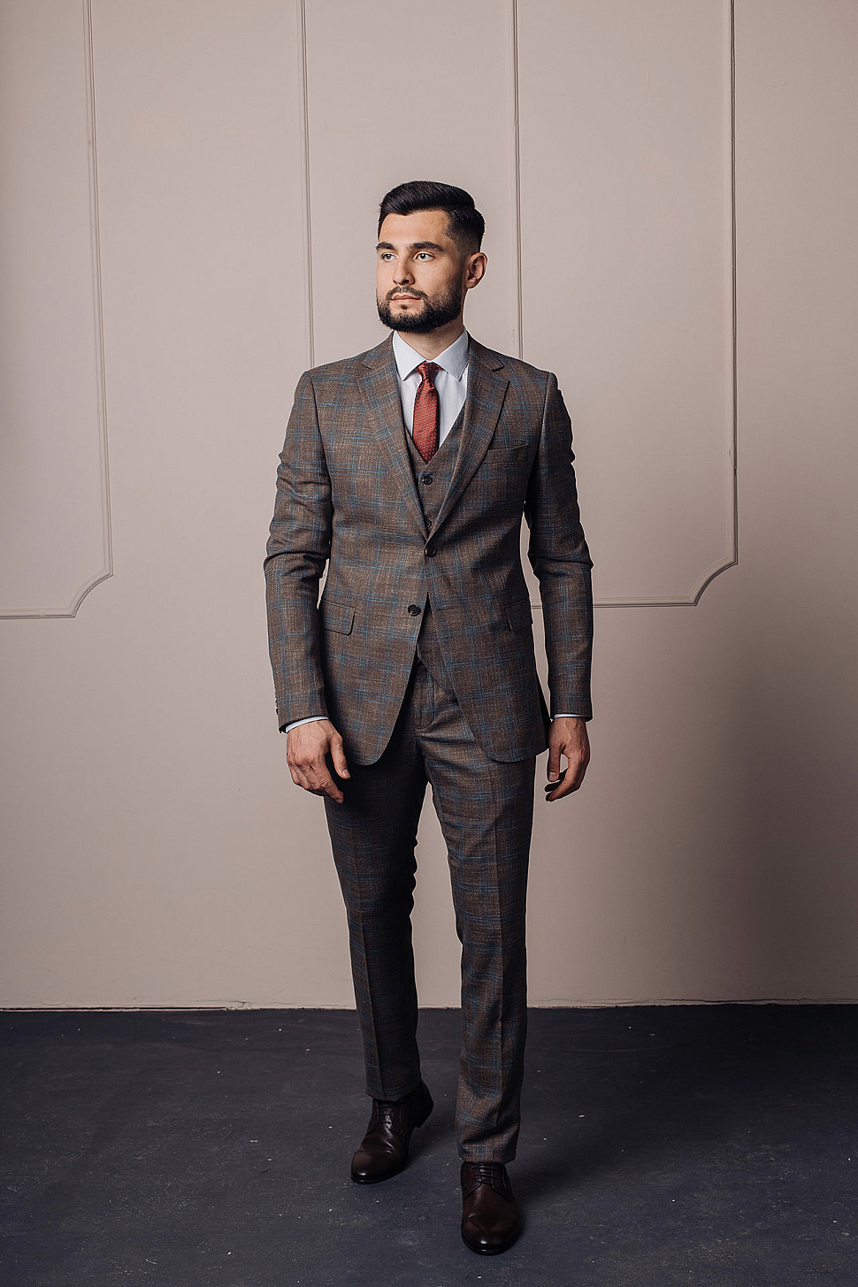 Мужской костюм тройка коричневого цвета в синюю клетку