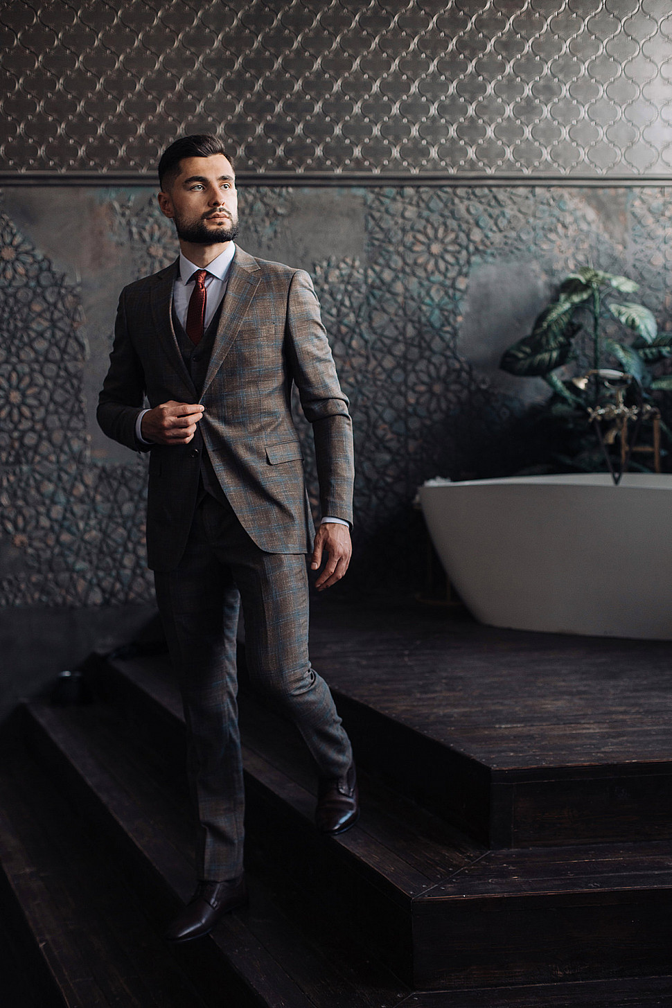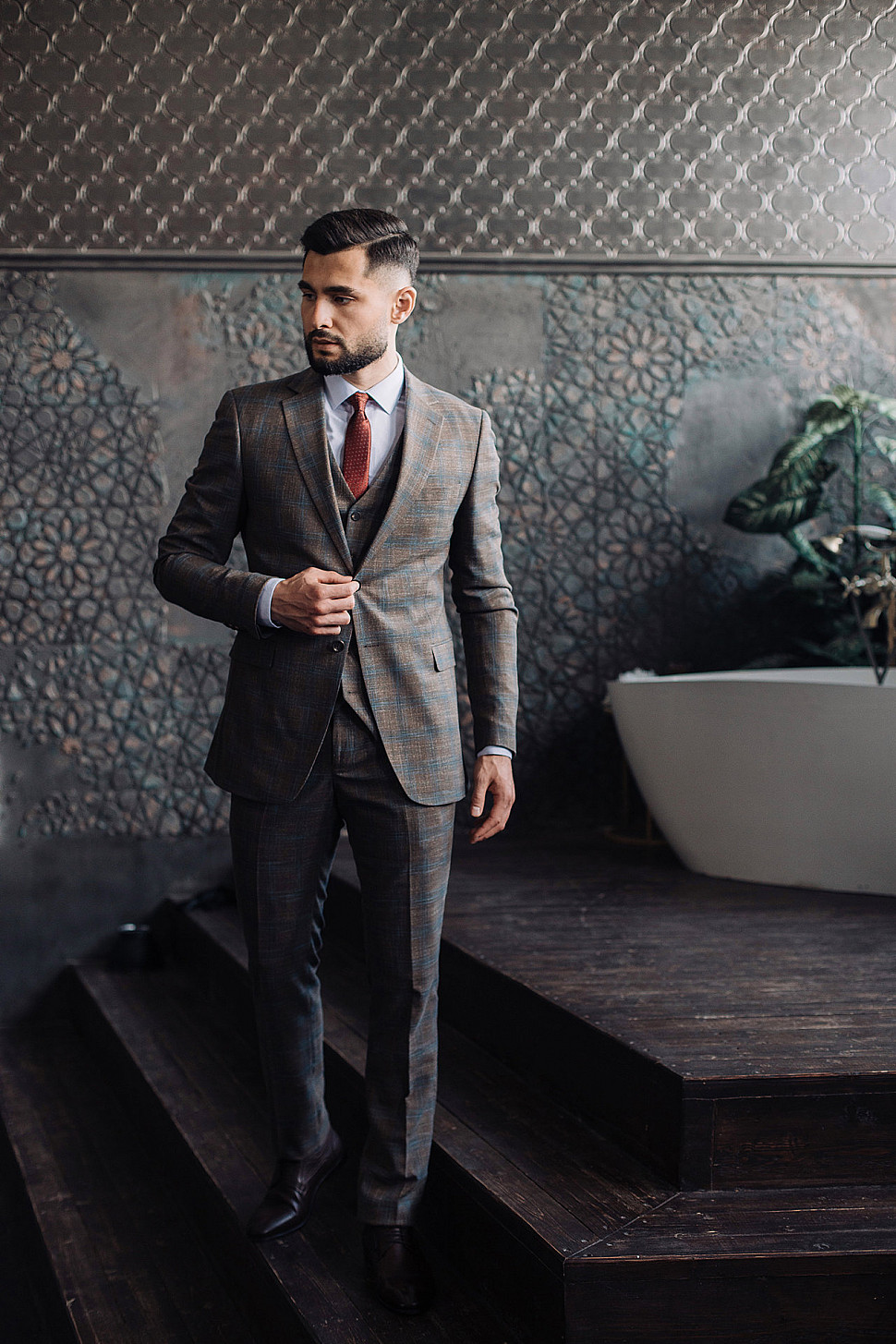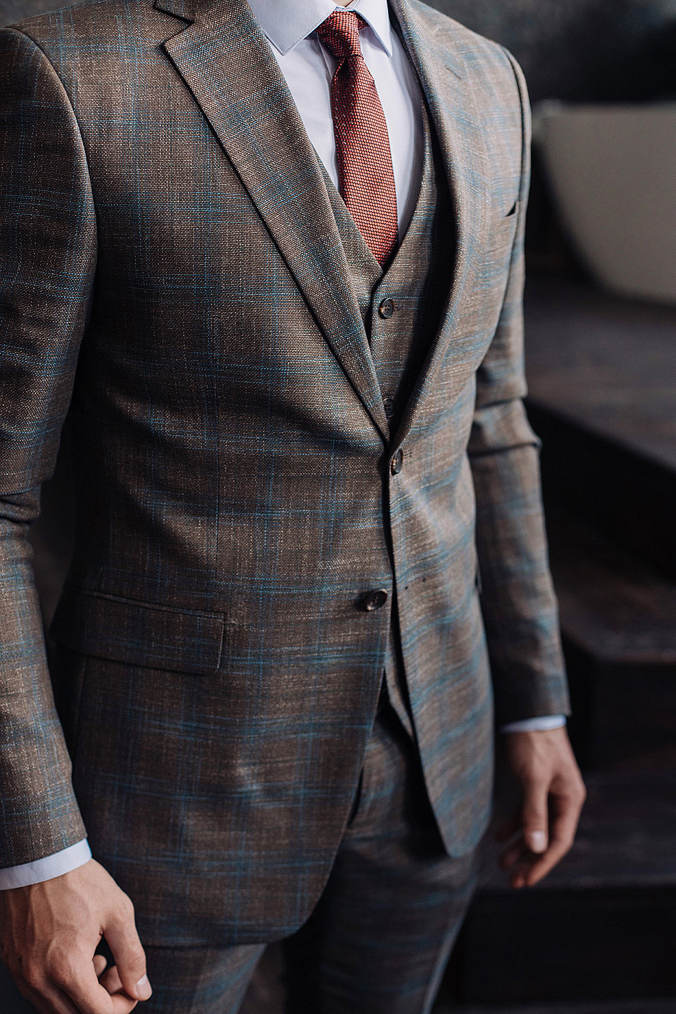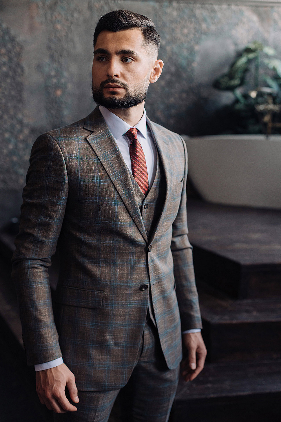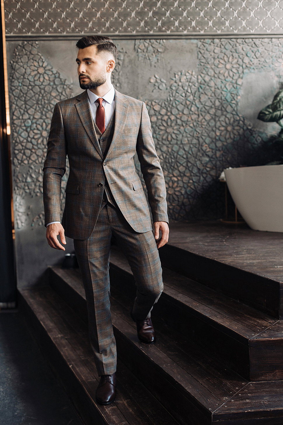 Мужской костюм тройка коричневого цвета в синюю клетку
