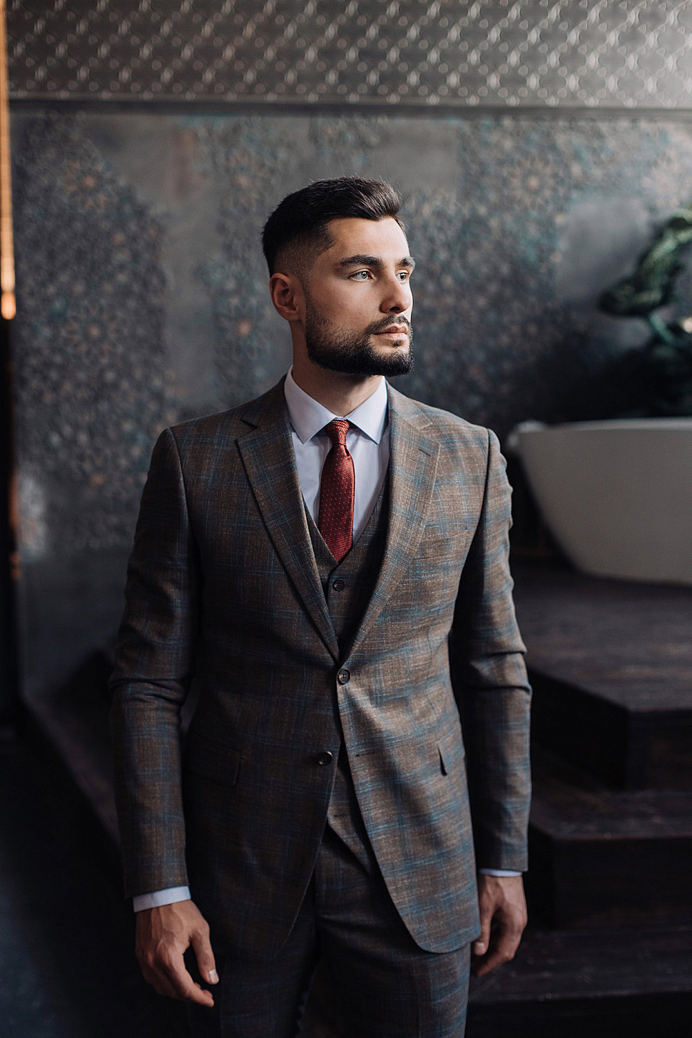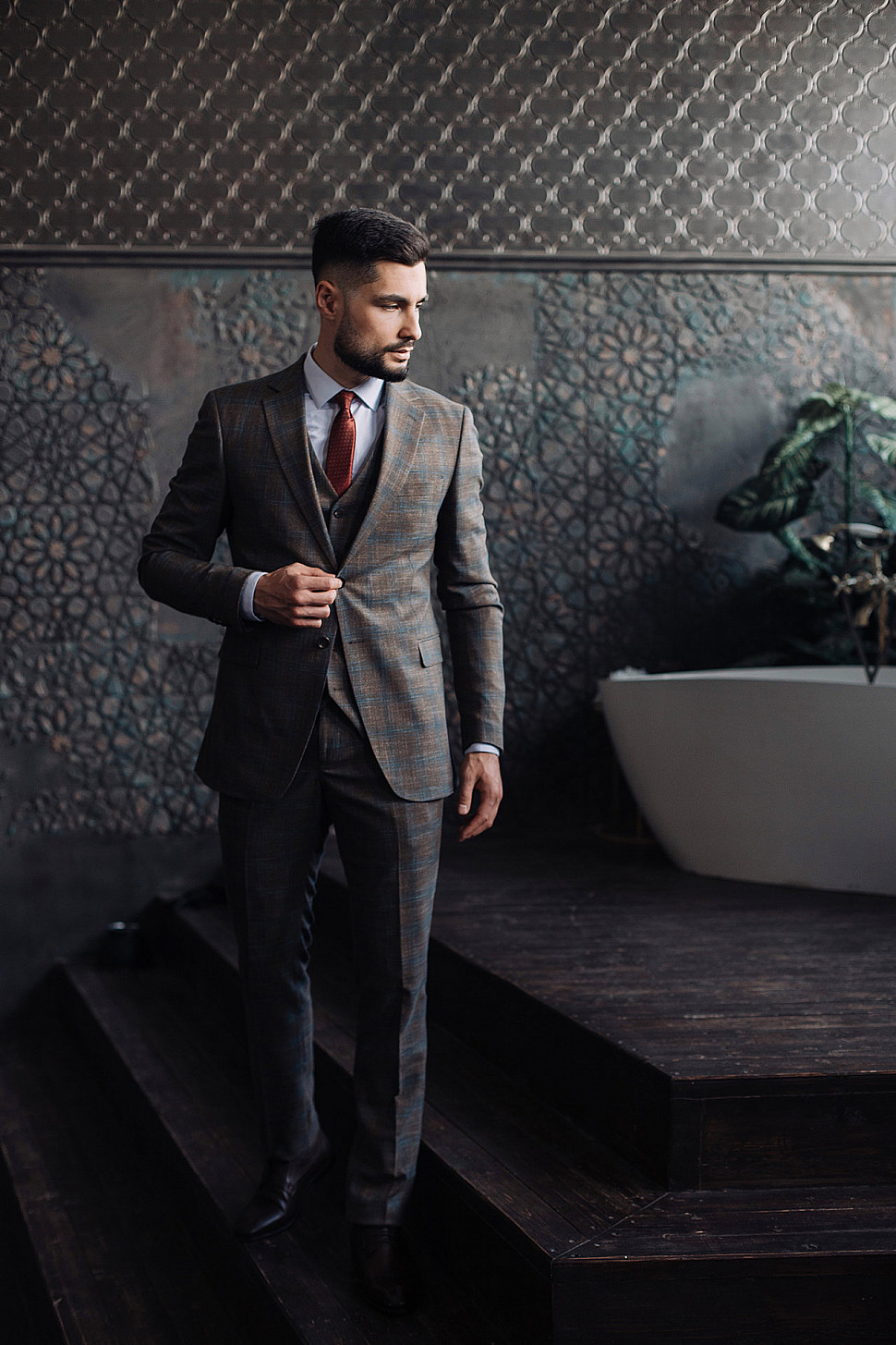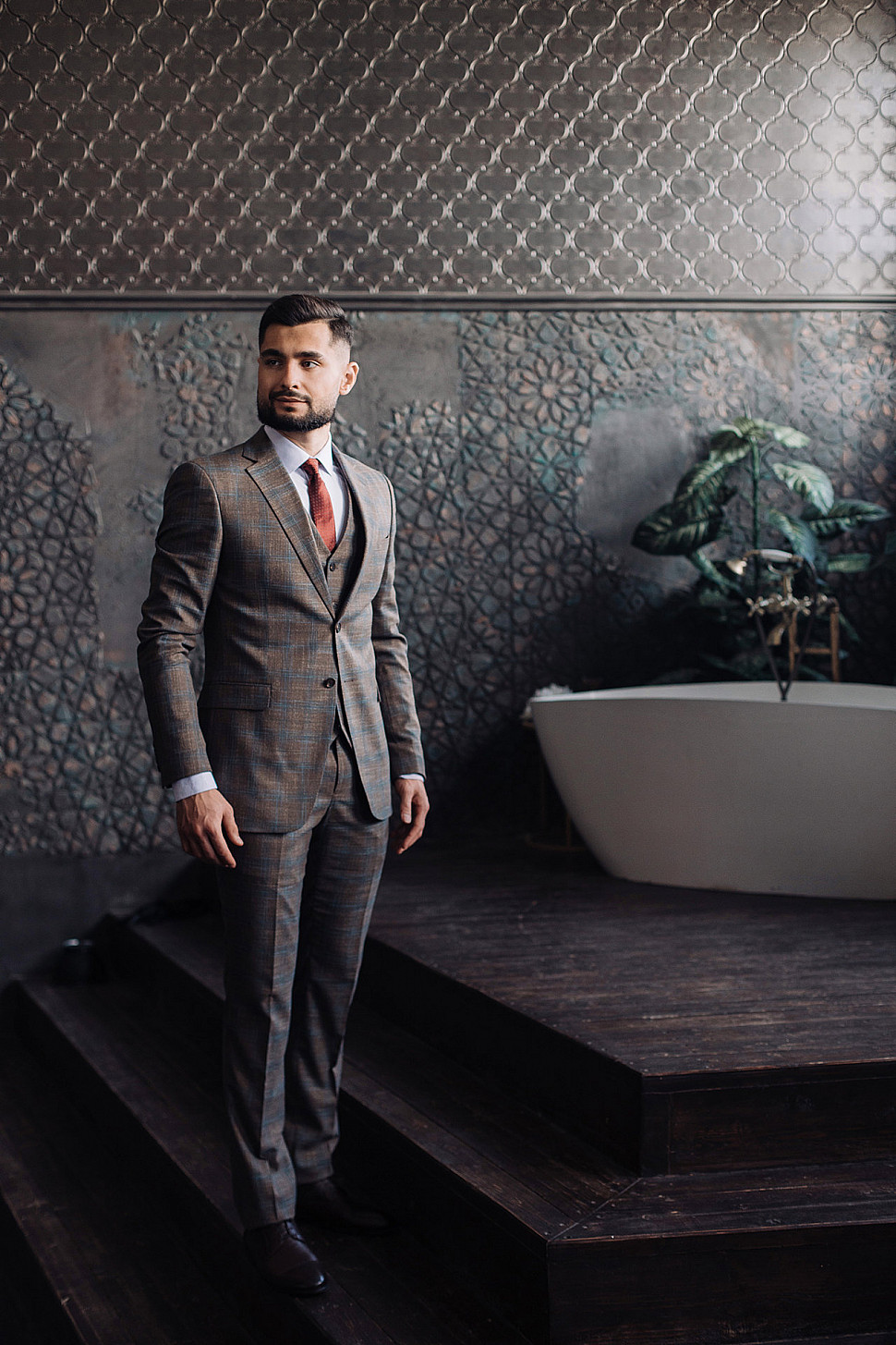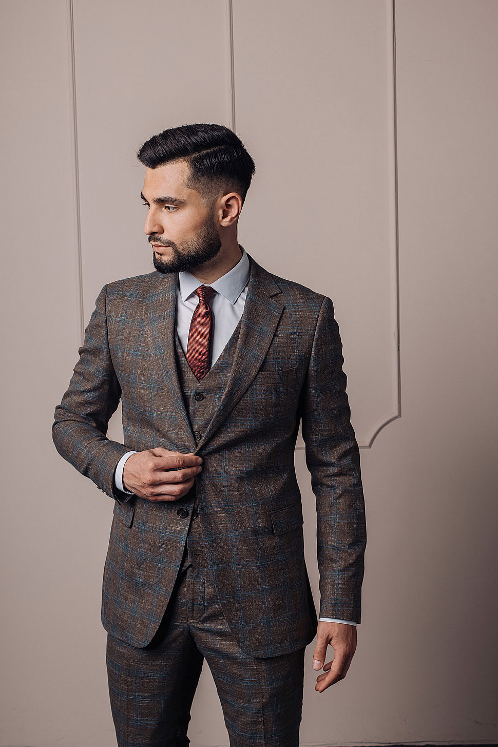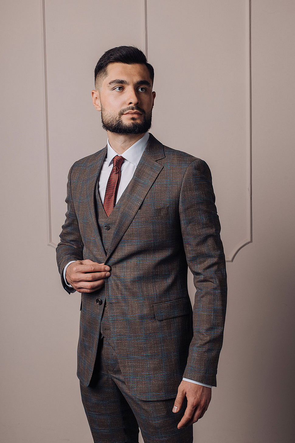 Мужской костюм тройка коричневого цвета фактурный в синюю клетку