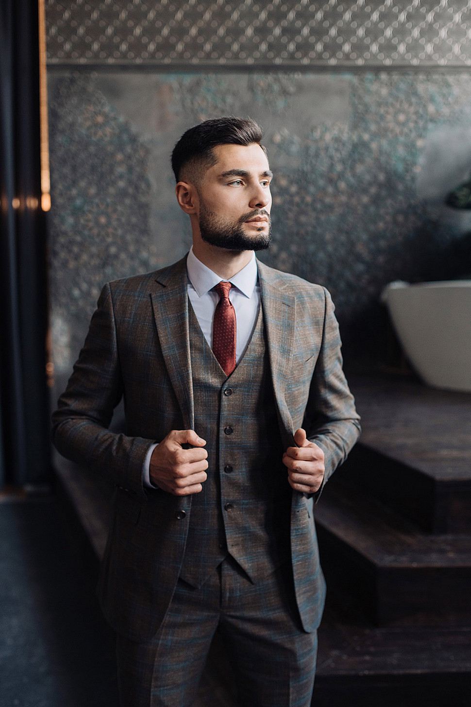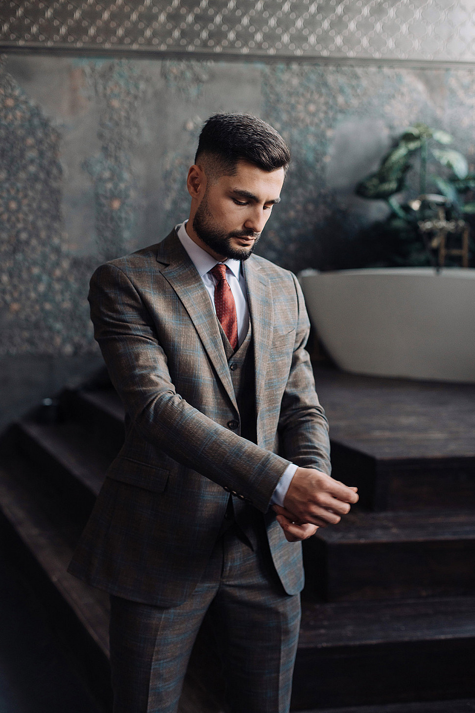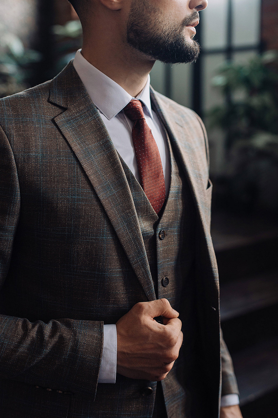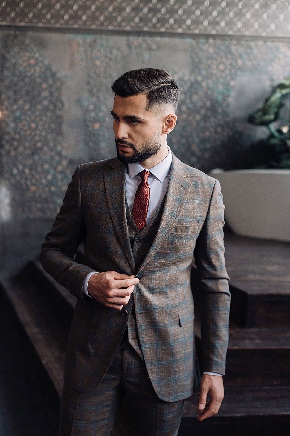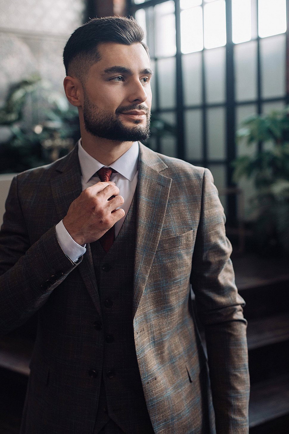 Мужской костюм тройка коричневого цвета фактурный в синюю клетку