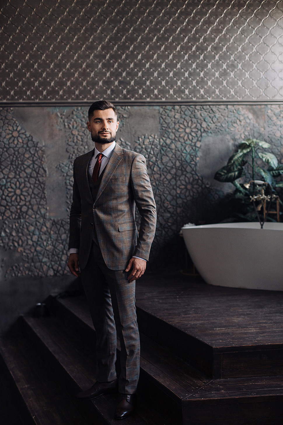 Мужской костюм тройка темно-синего цвета текстурный в клетку