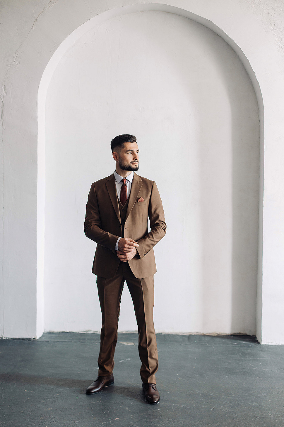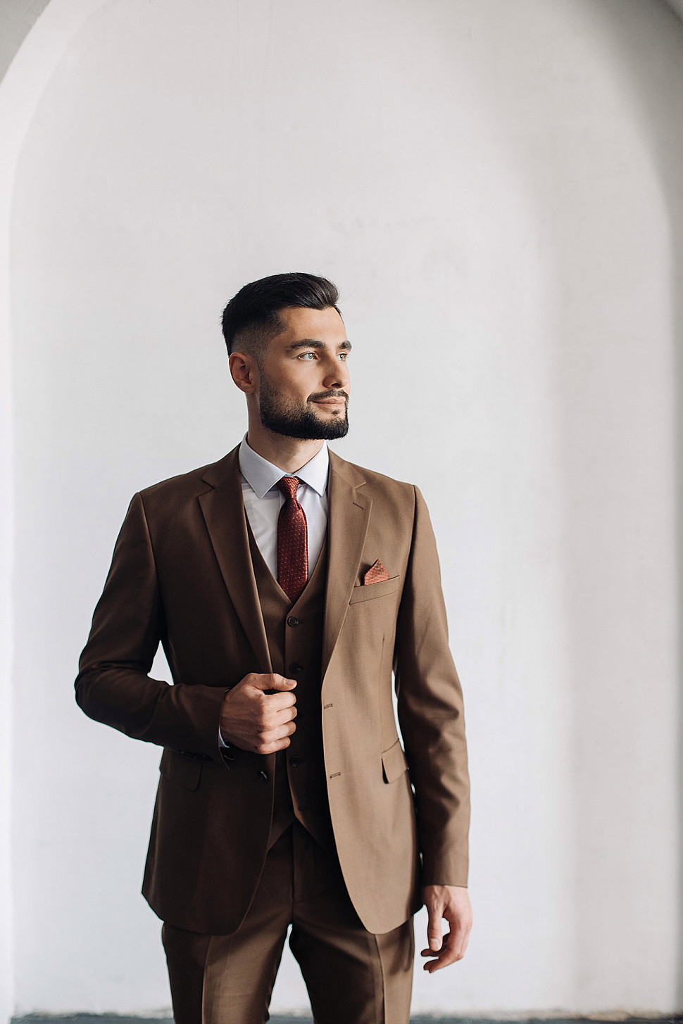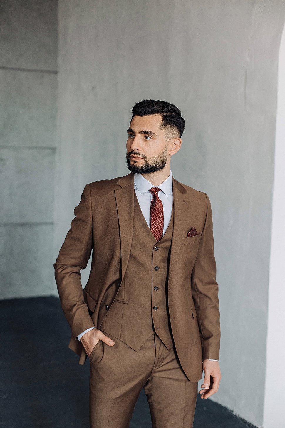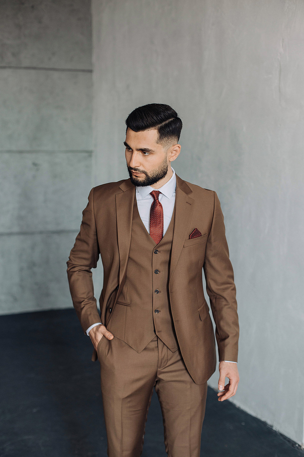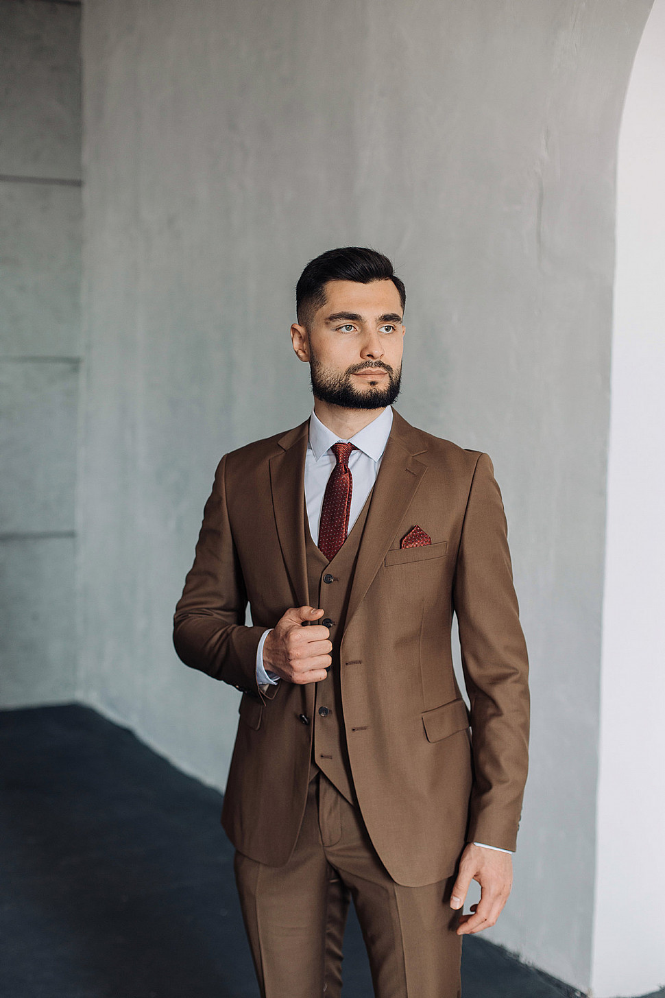Мужской костюм тройка однотонного коричневого цвета