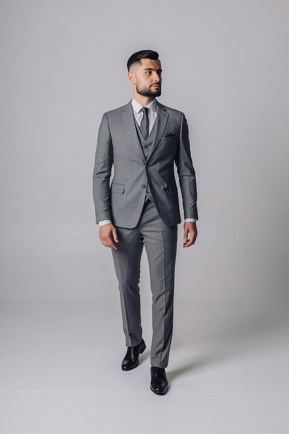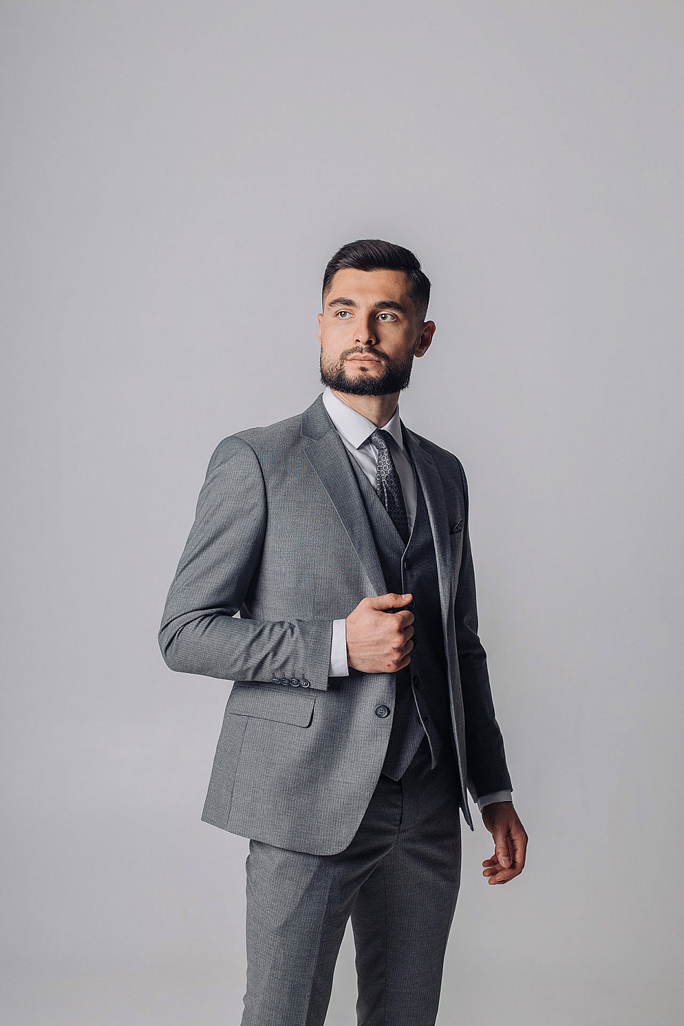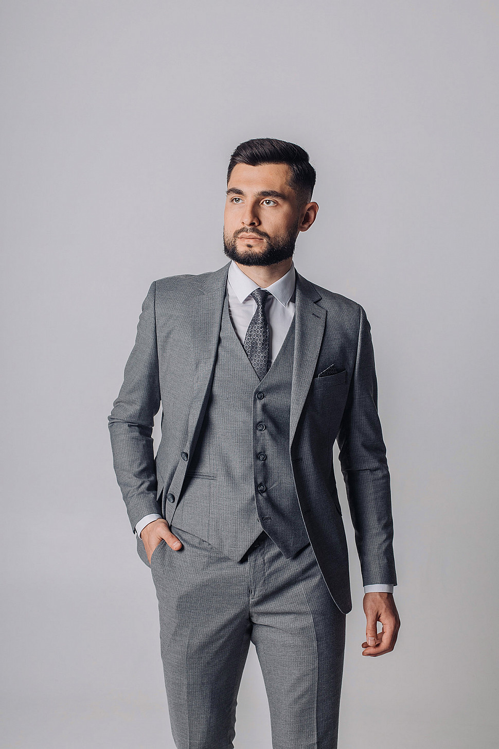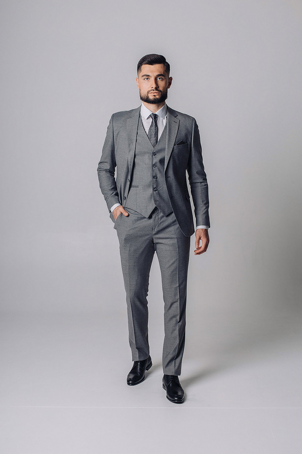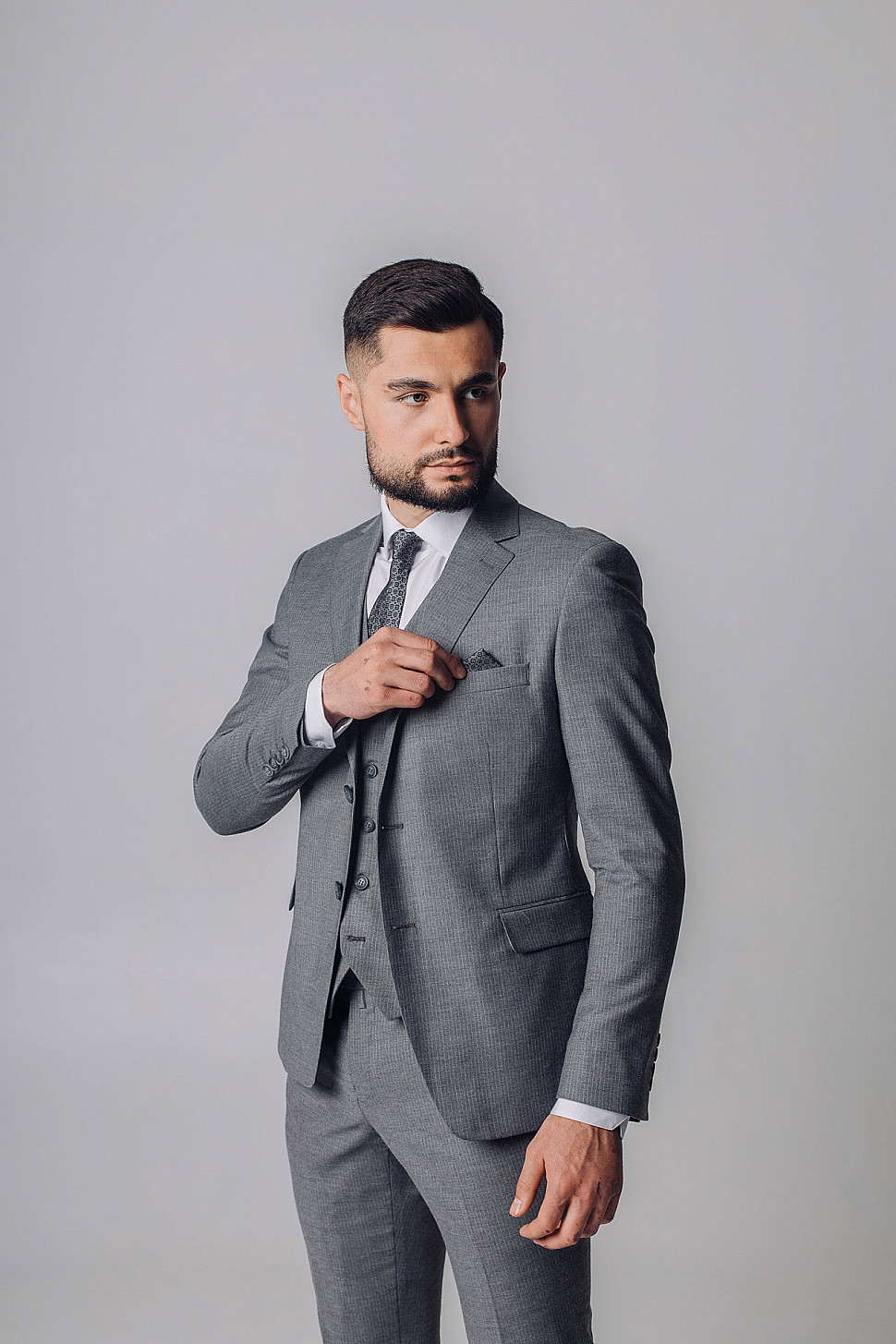 Мужской костюм тройка серого цвета фактурный