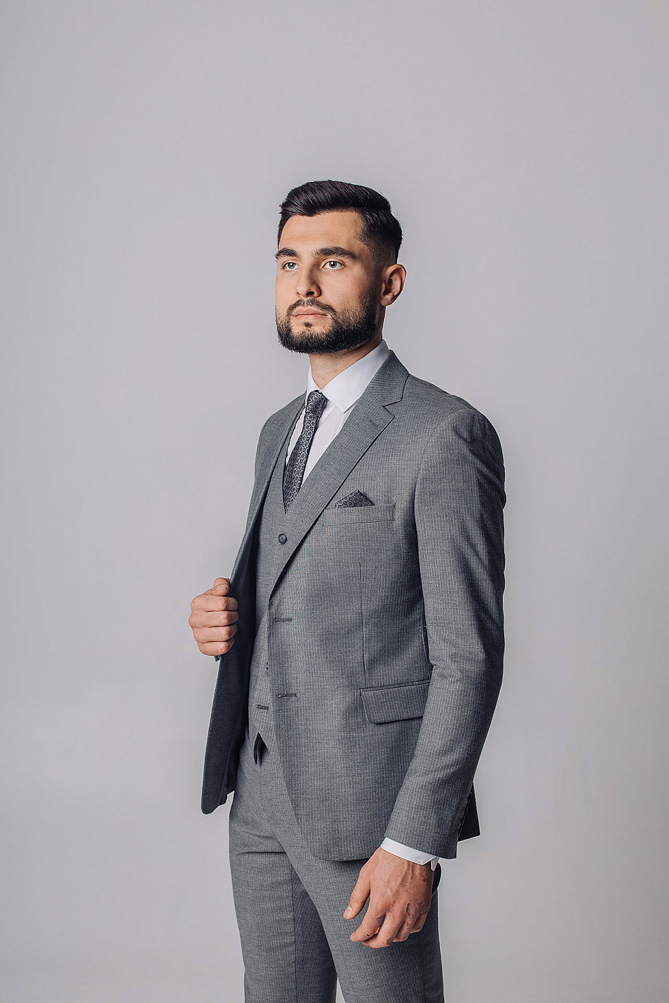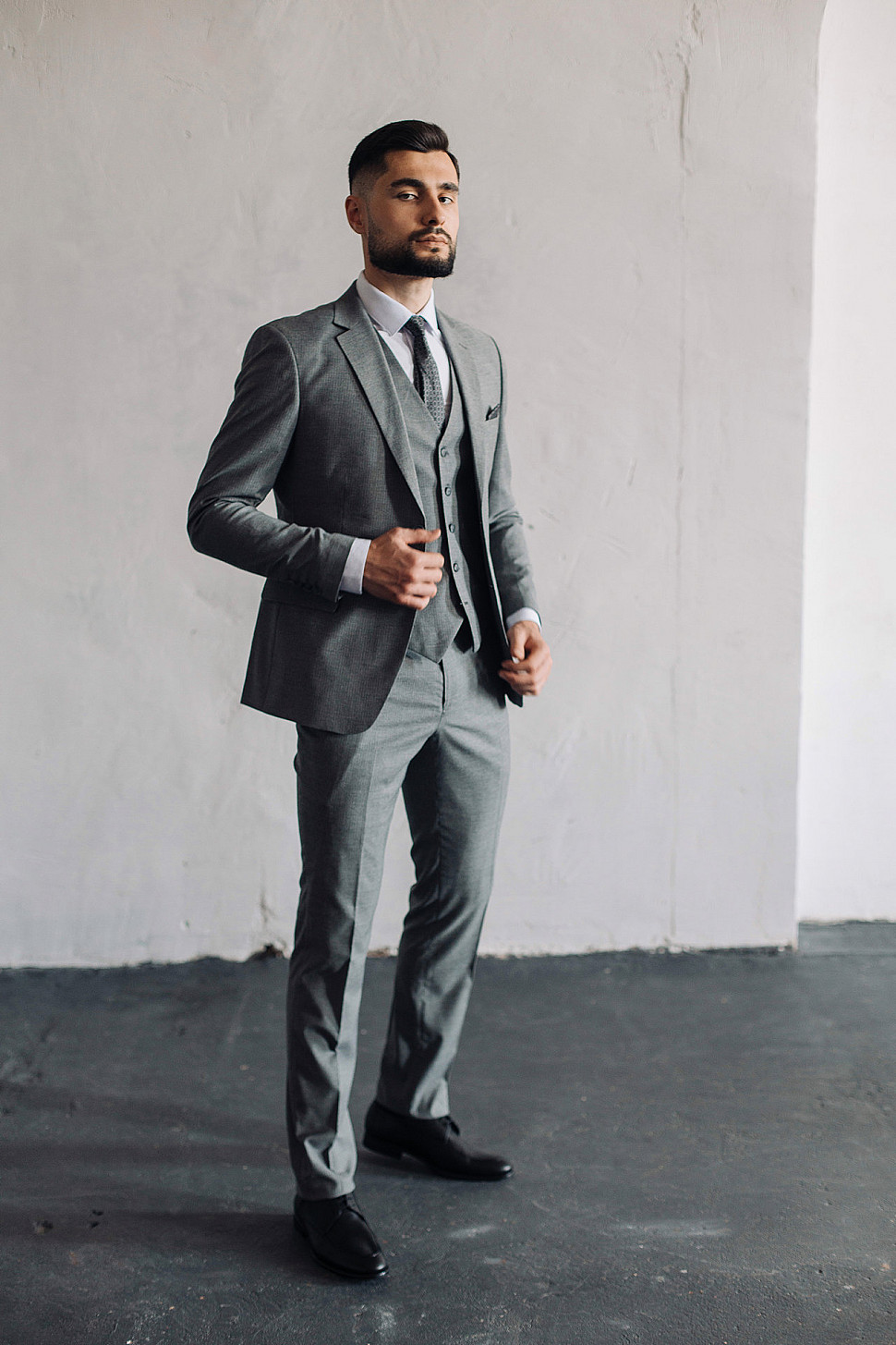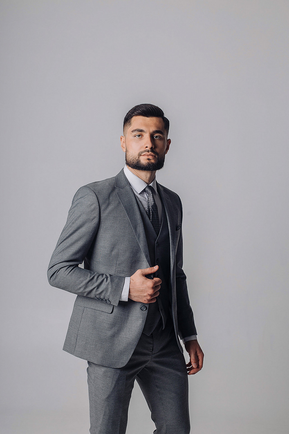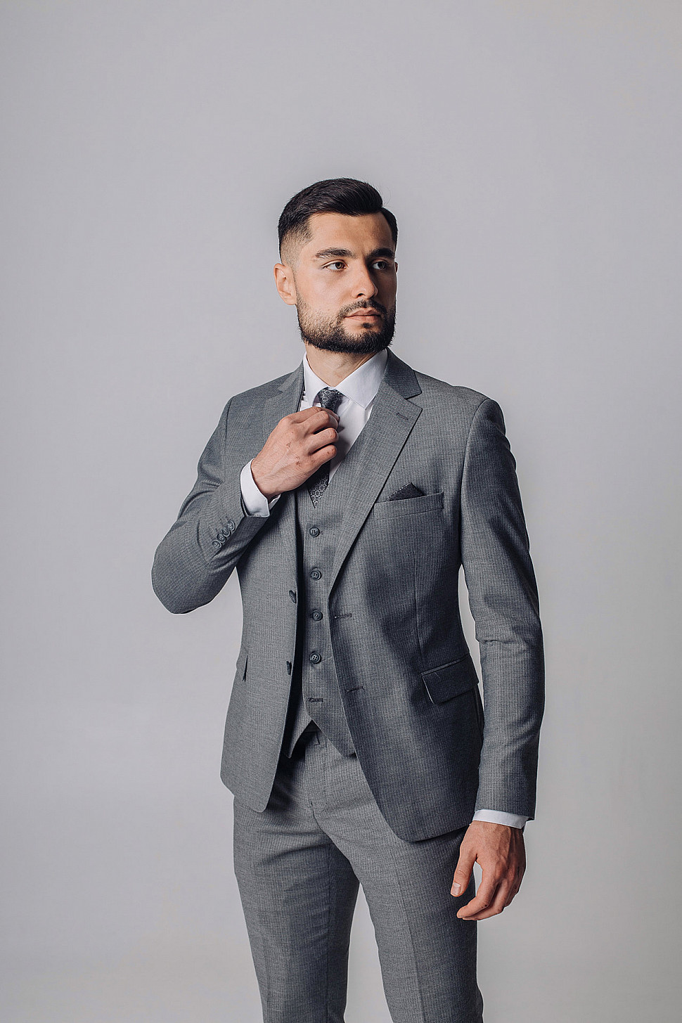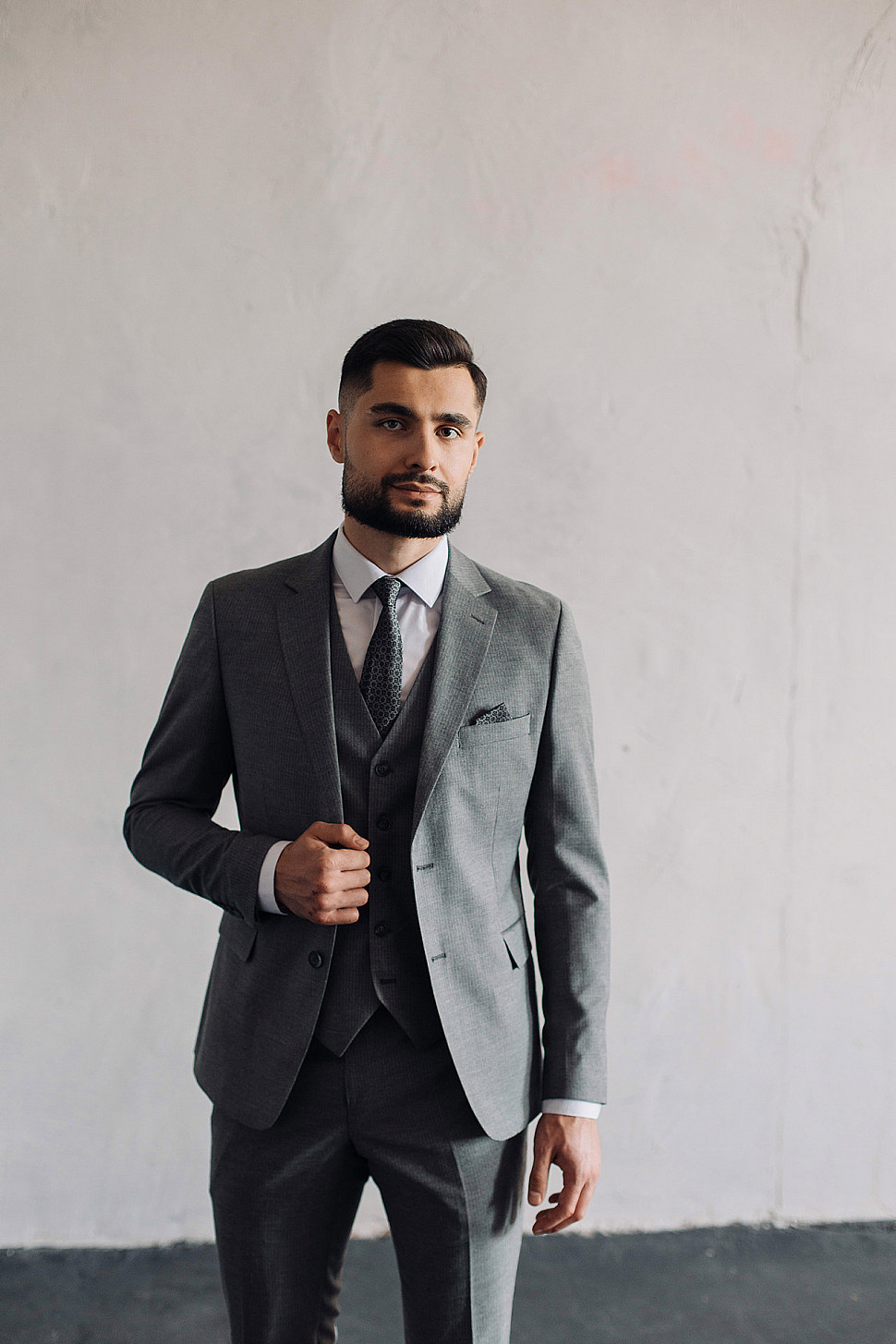 Мужской костюм тройка серого цвета фактурный