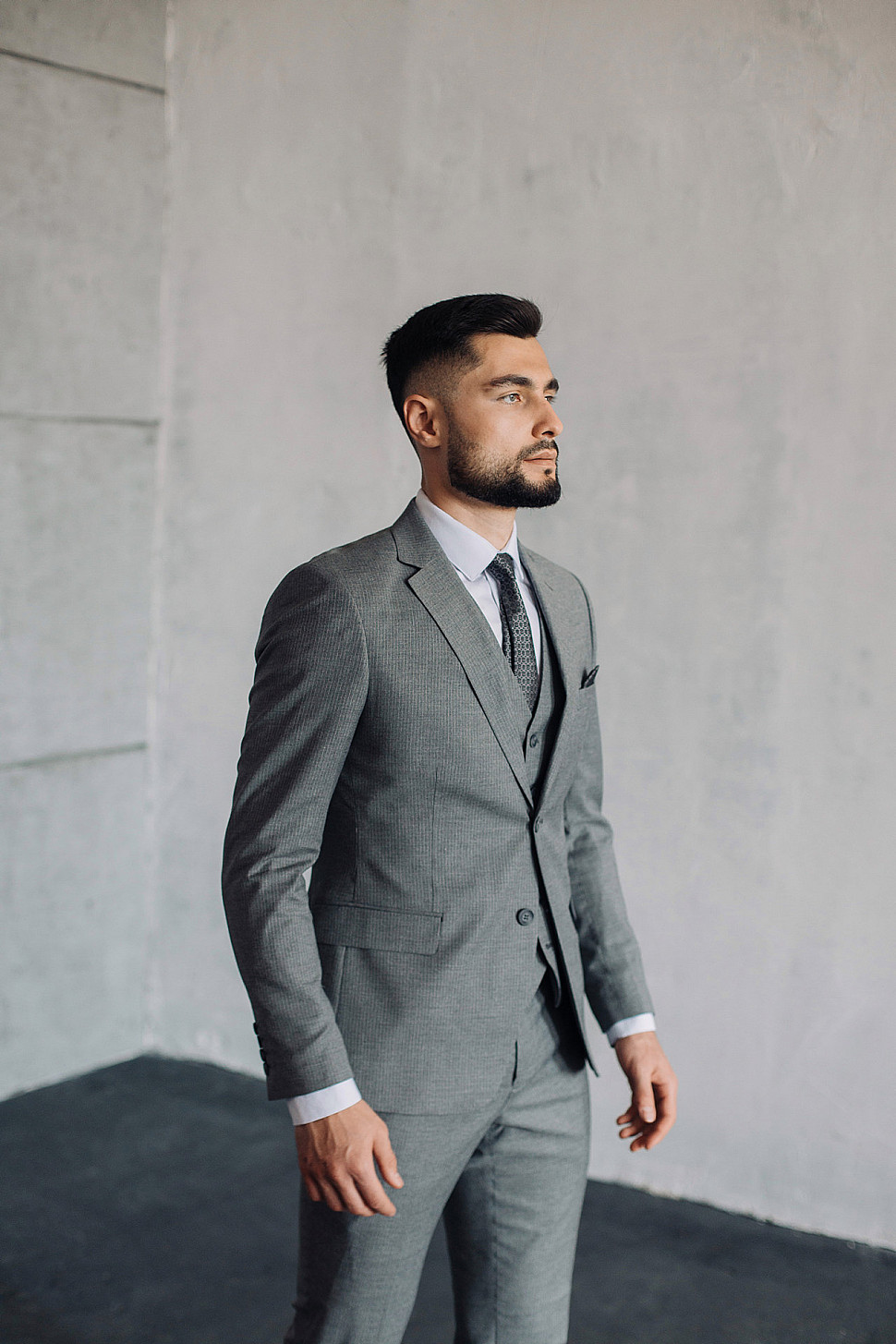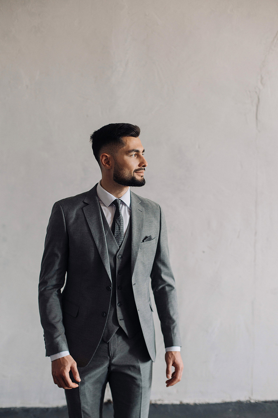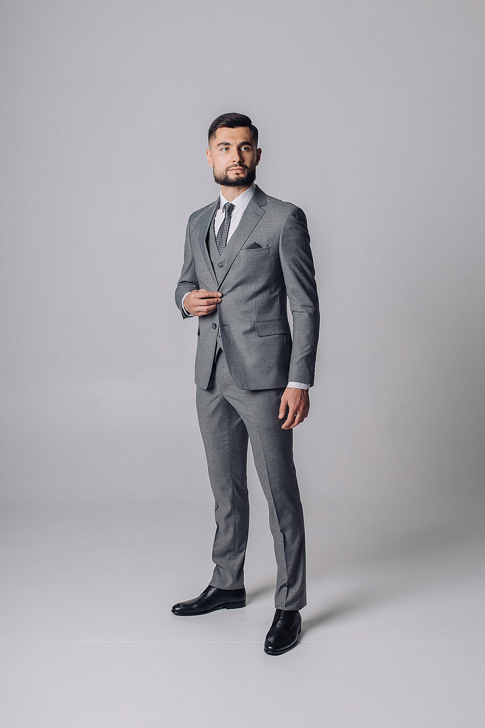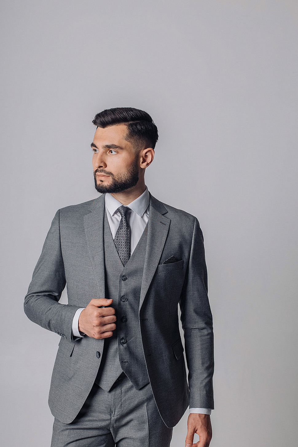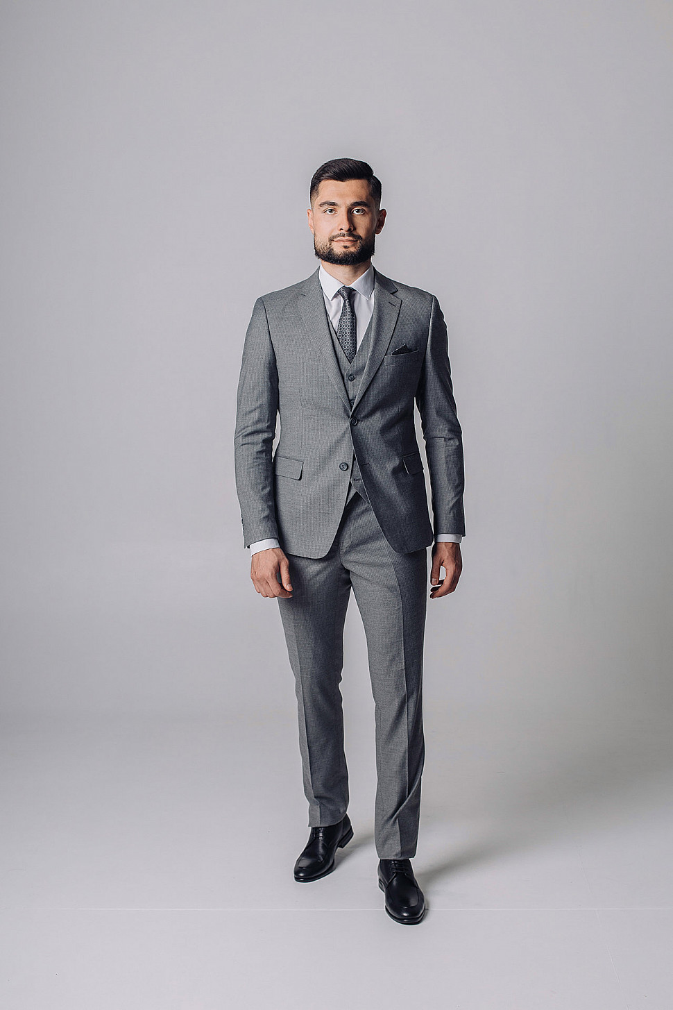 Мужской костюм тройка серого цвета фактурный