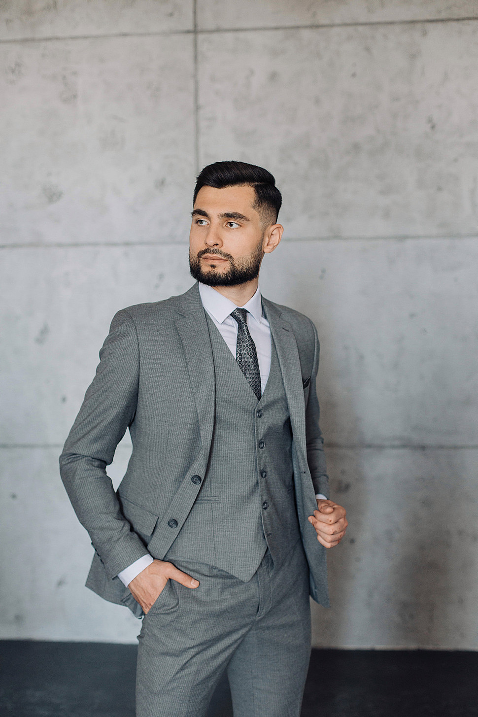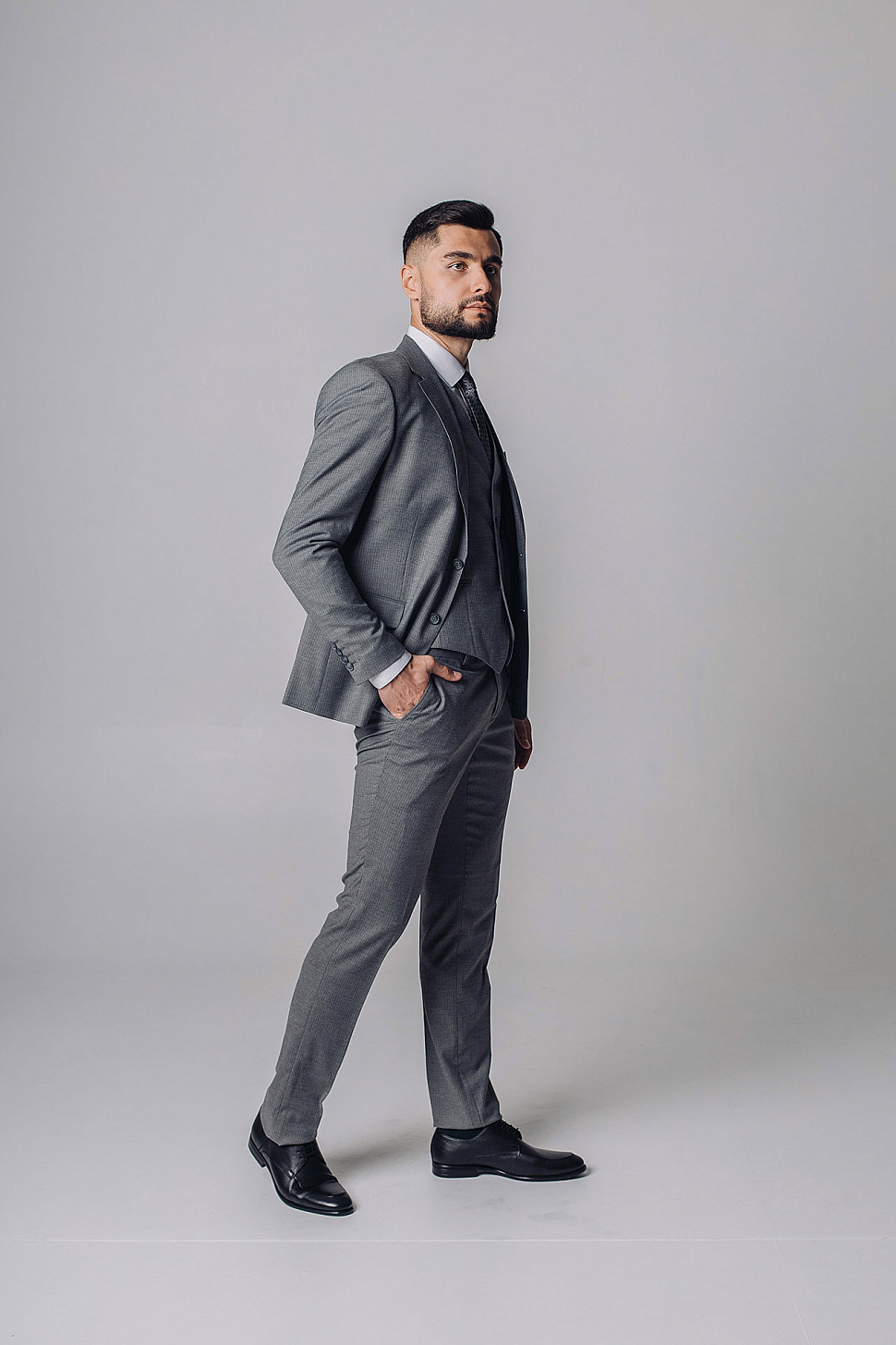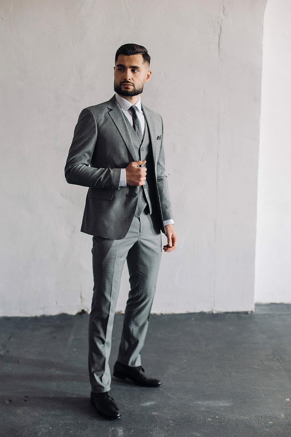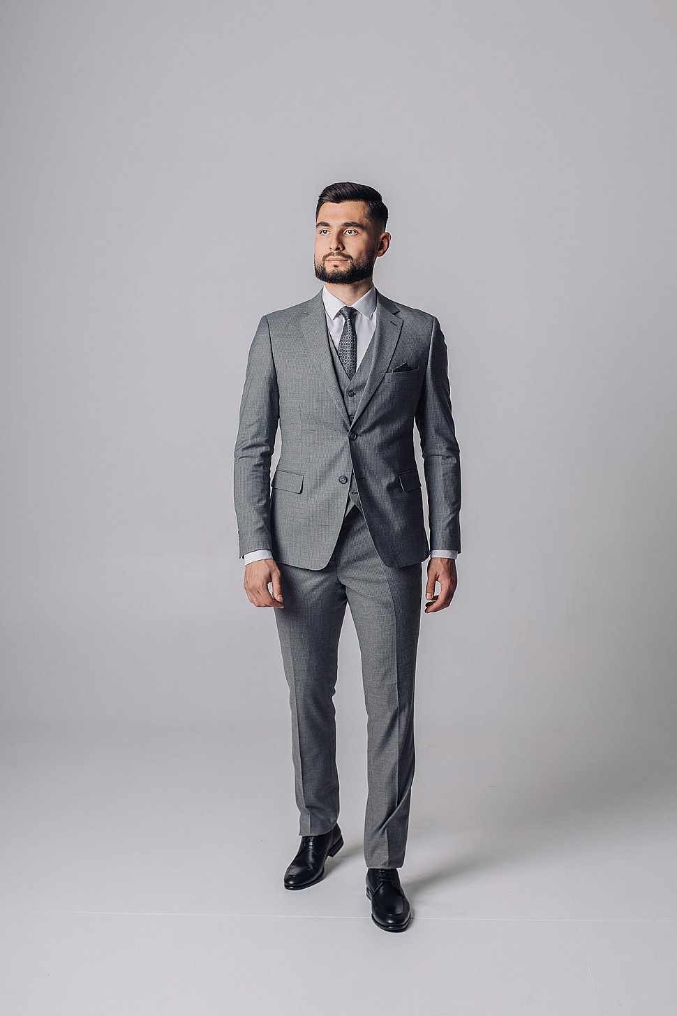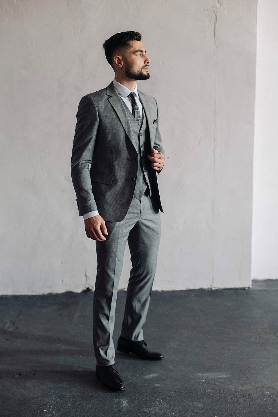 Мужской костюм тройка серого цвета фактурный
