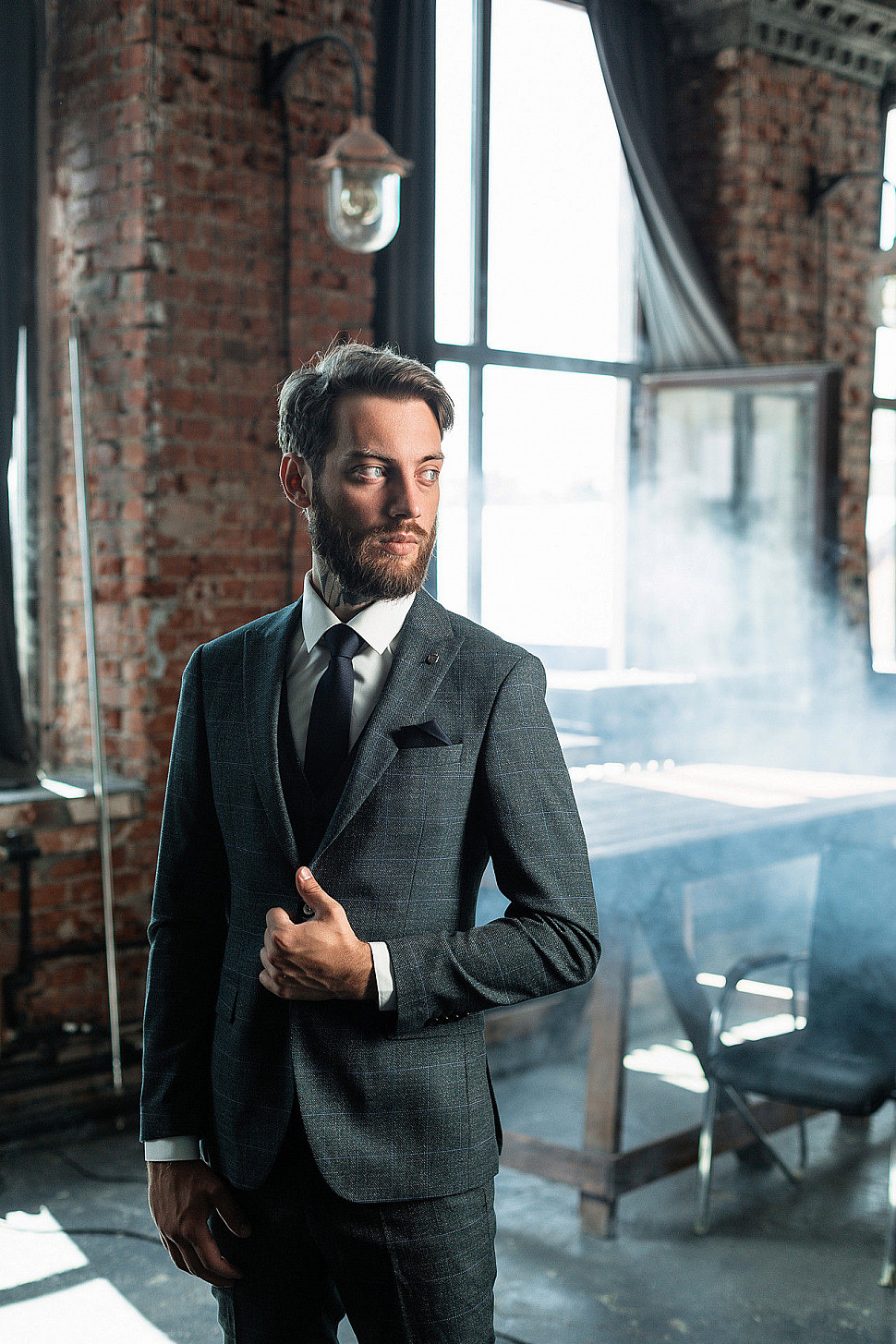 Мужской костюм двойка серого цвета в мелкую клетку с накладными карманами