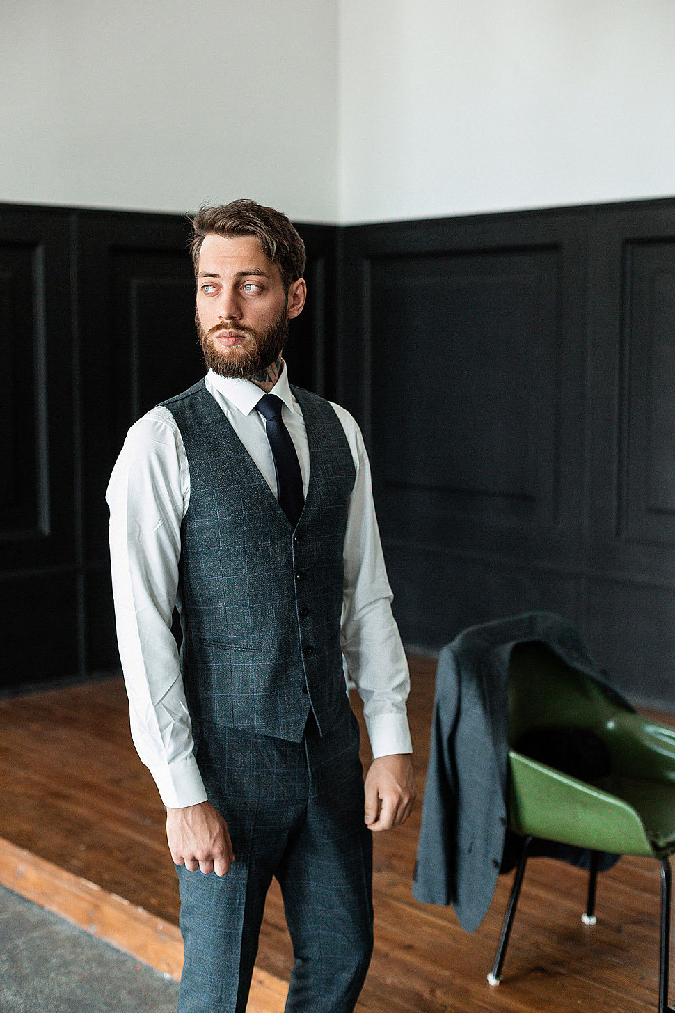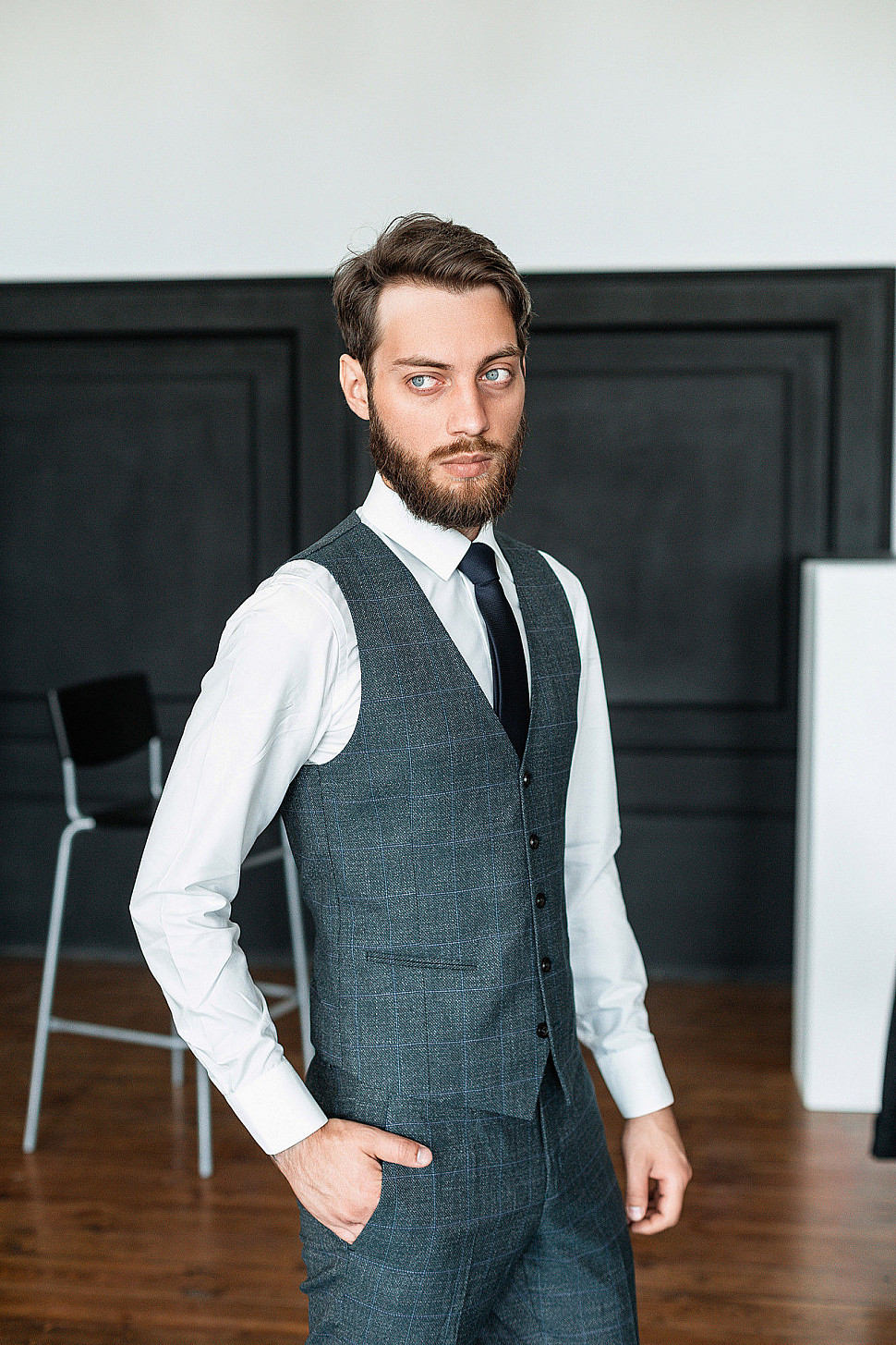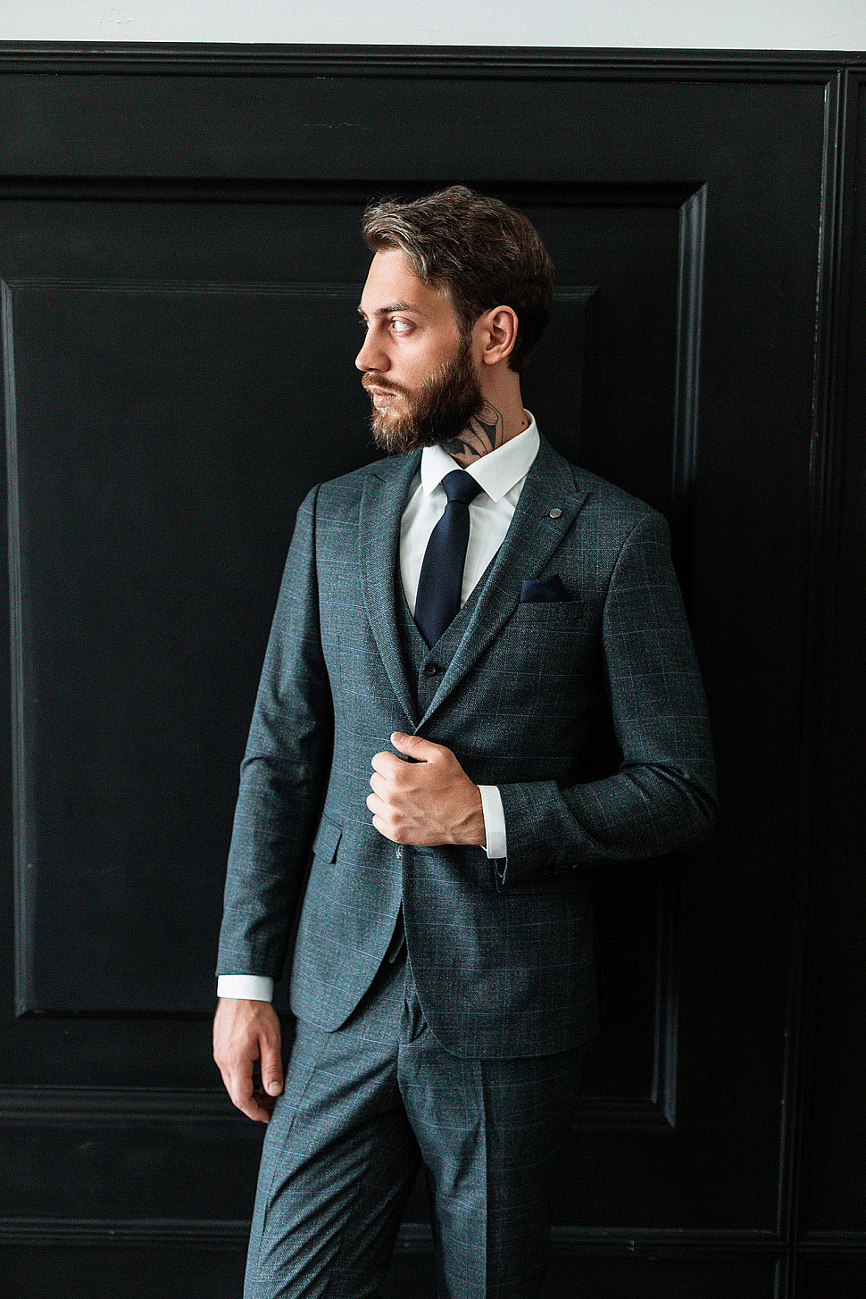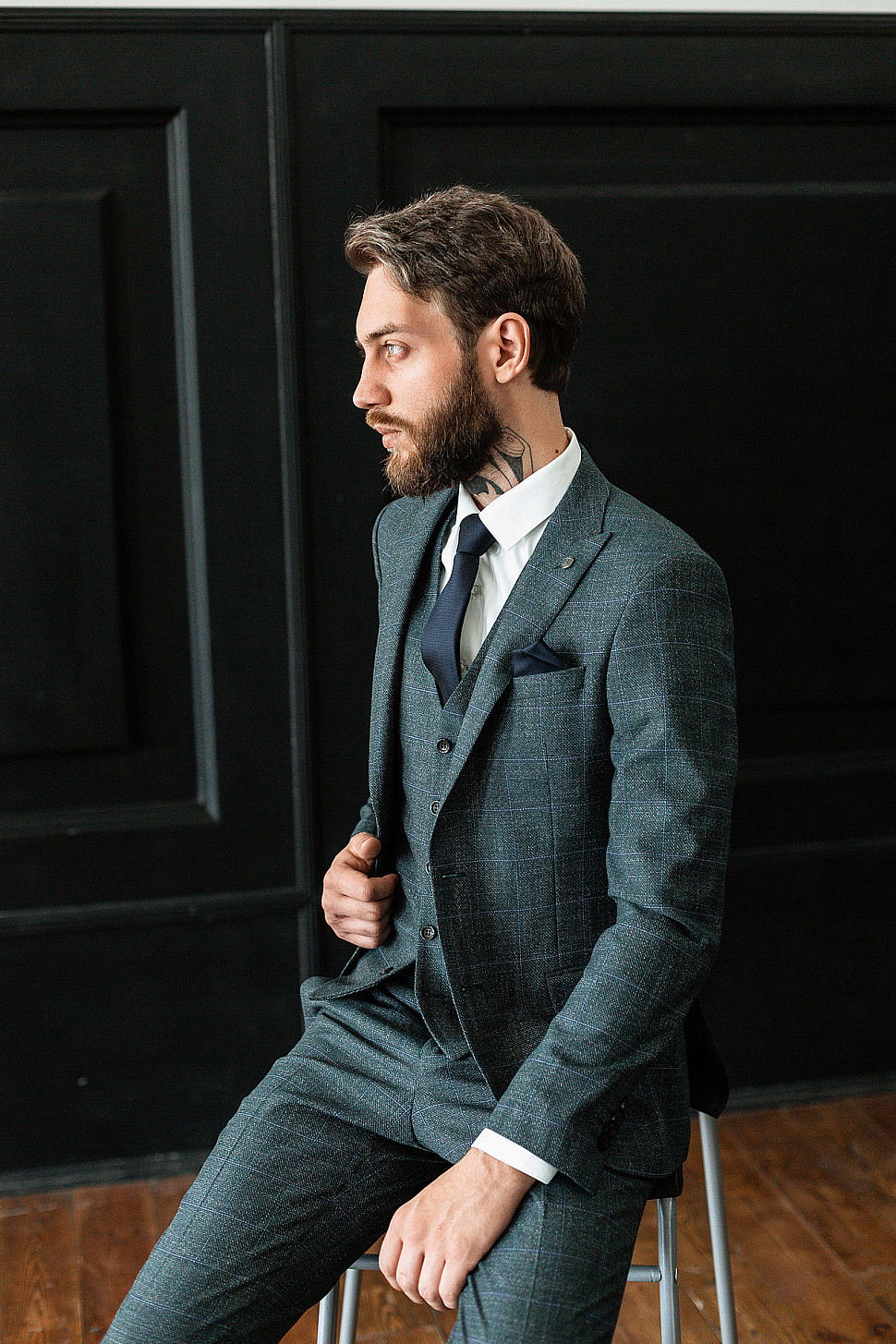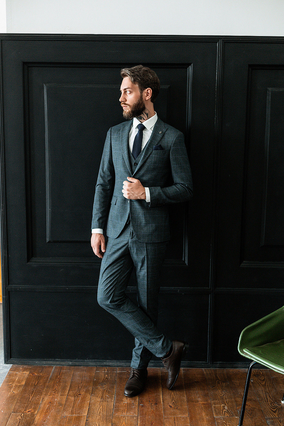 Мужской костюм тройка темно-синего цвета текстурный в клетку