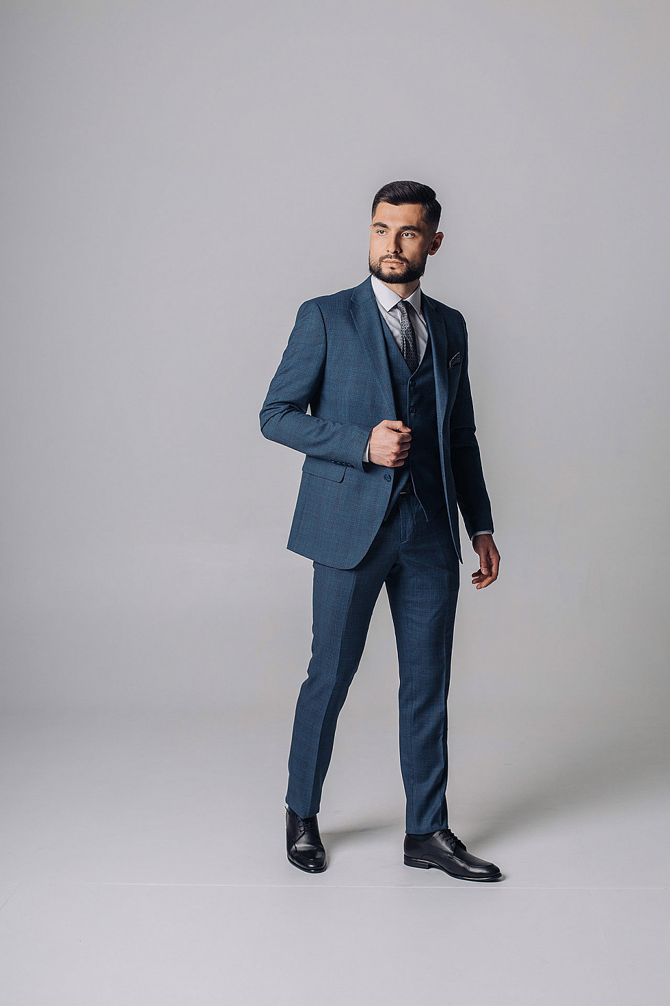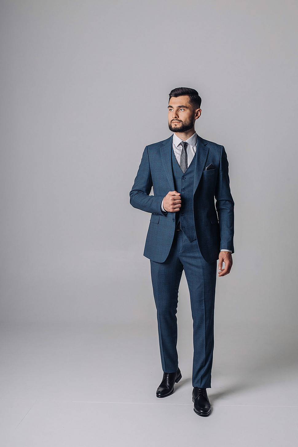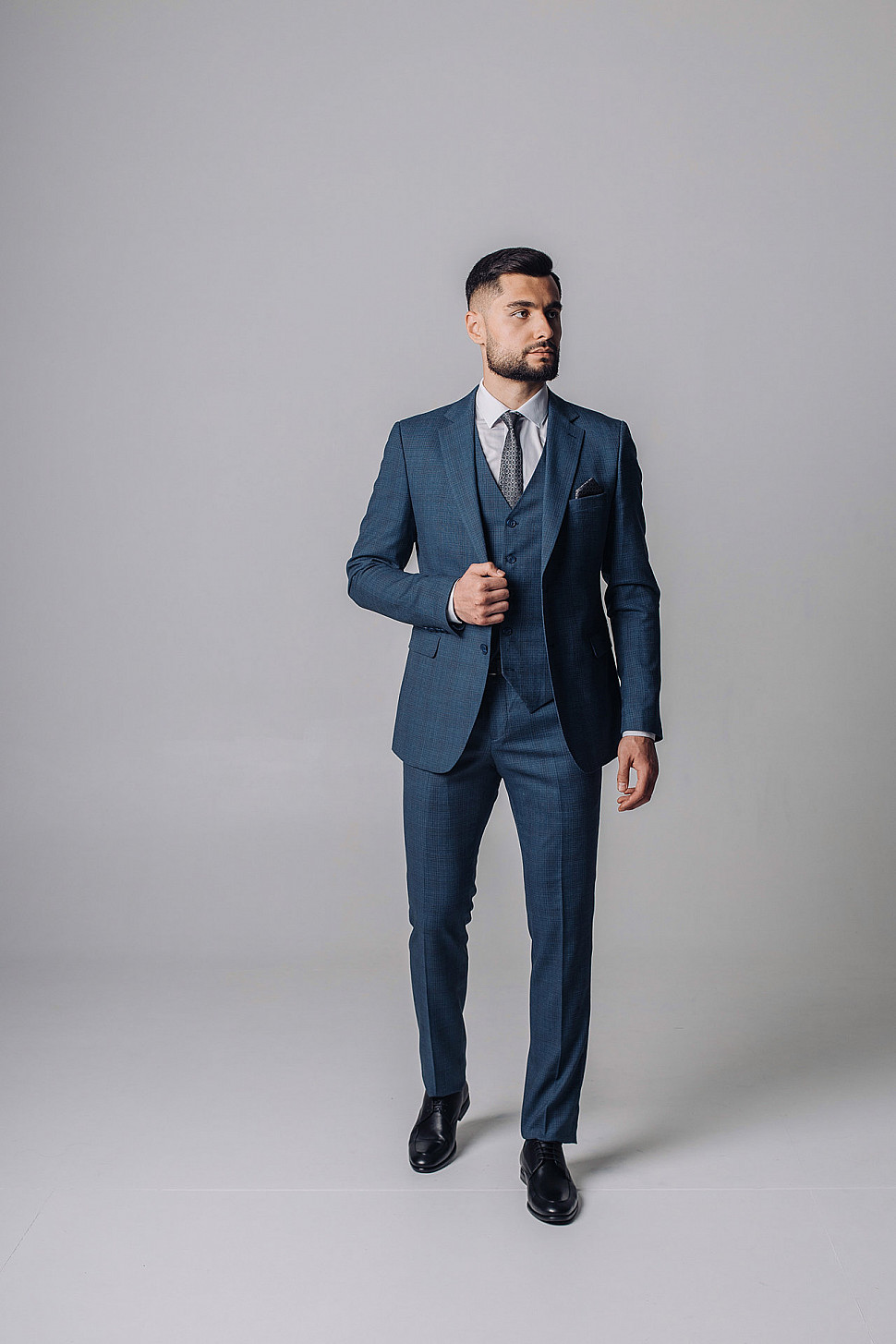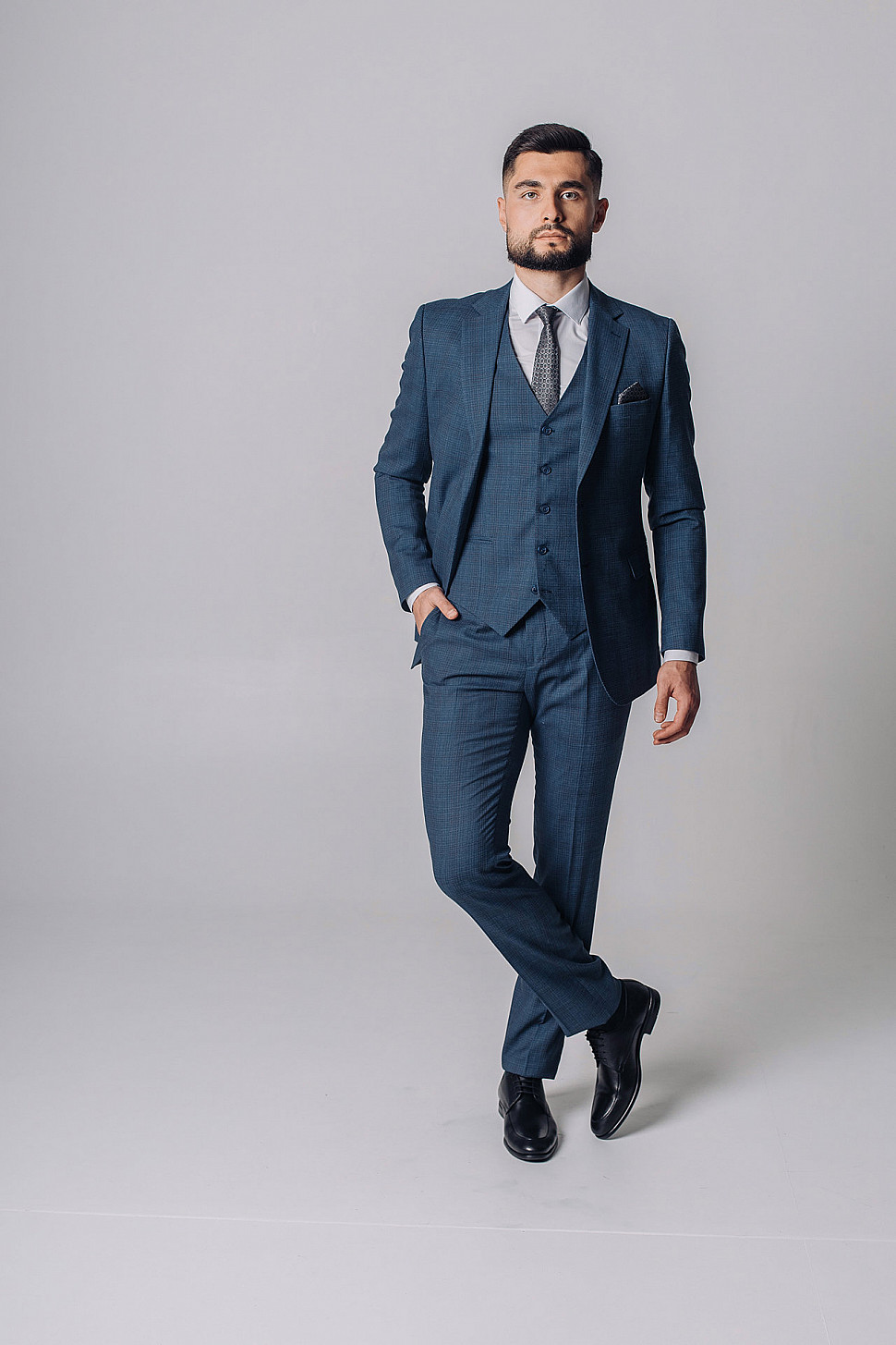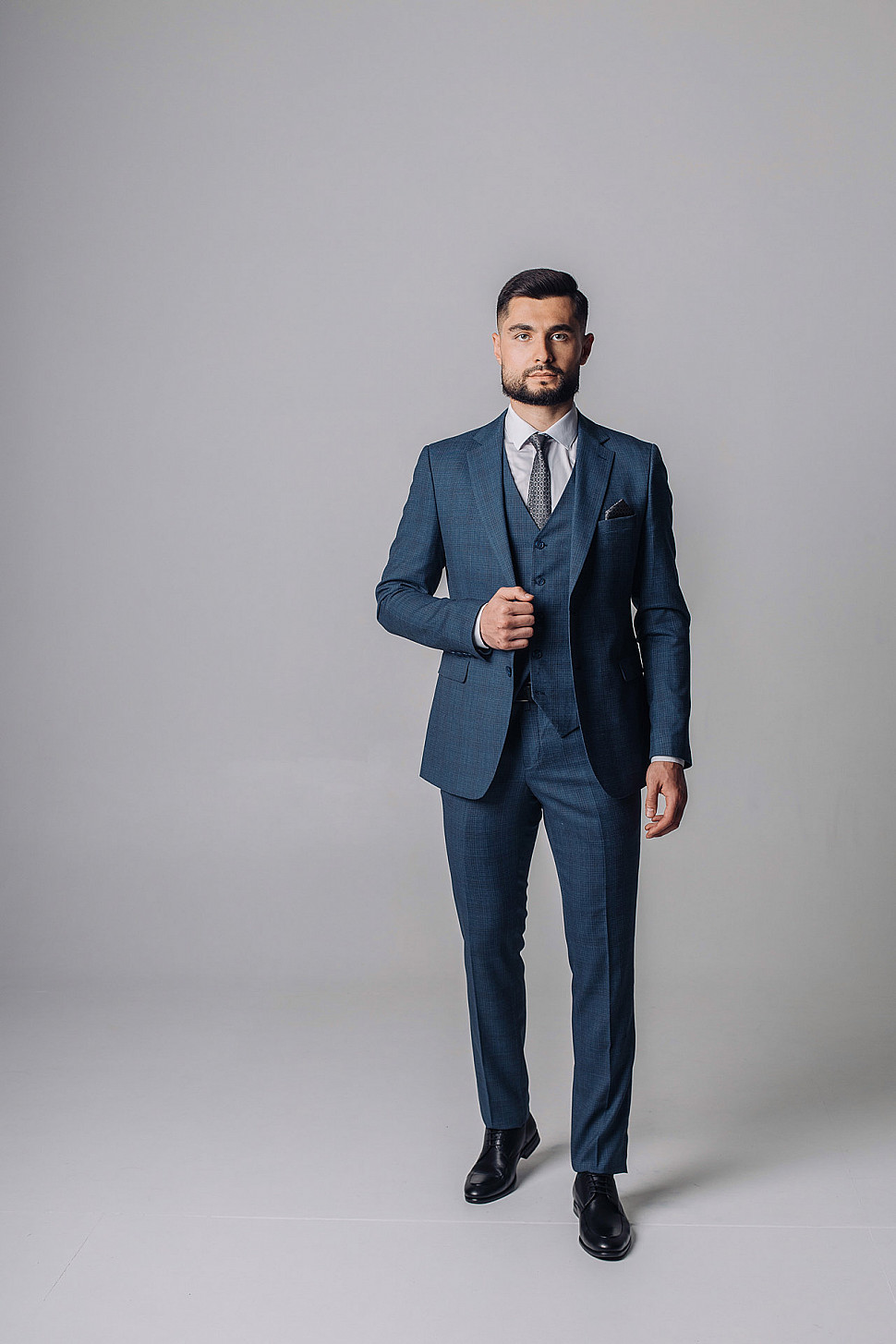 Мужской костюм тройка темно-синего цвета текстурный в клетку