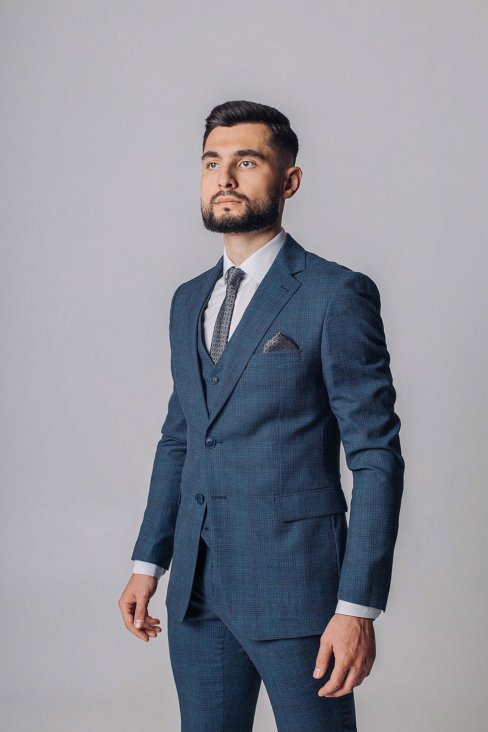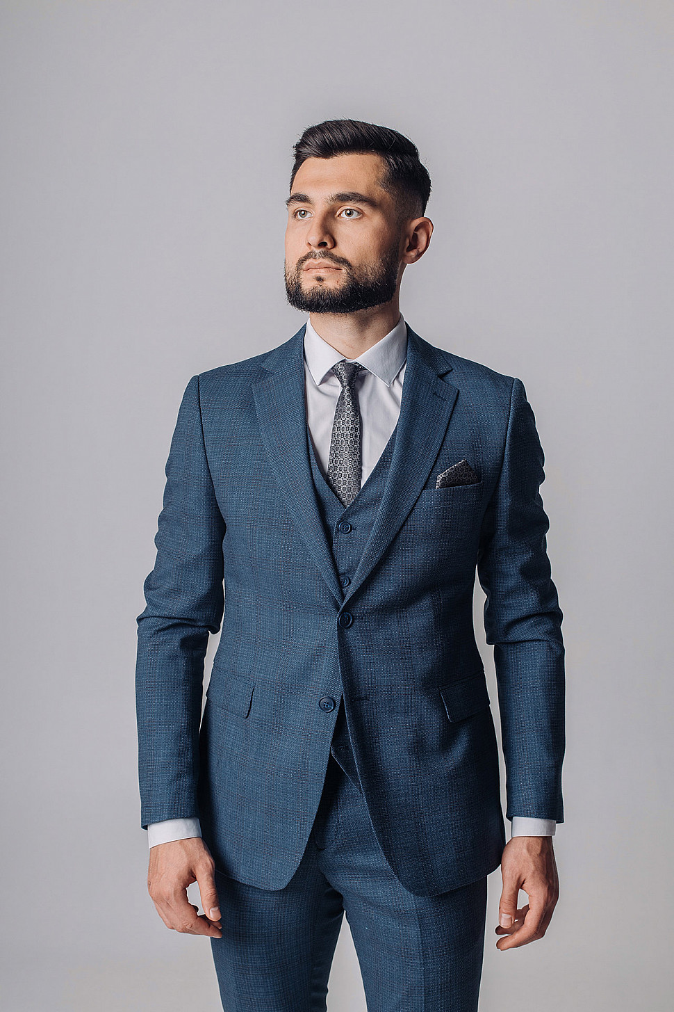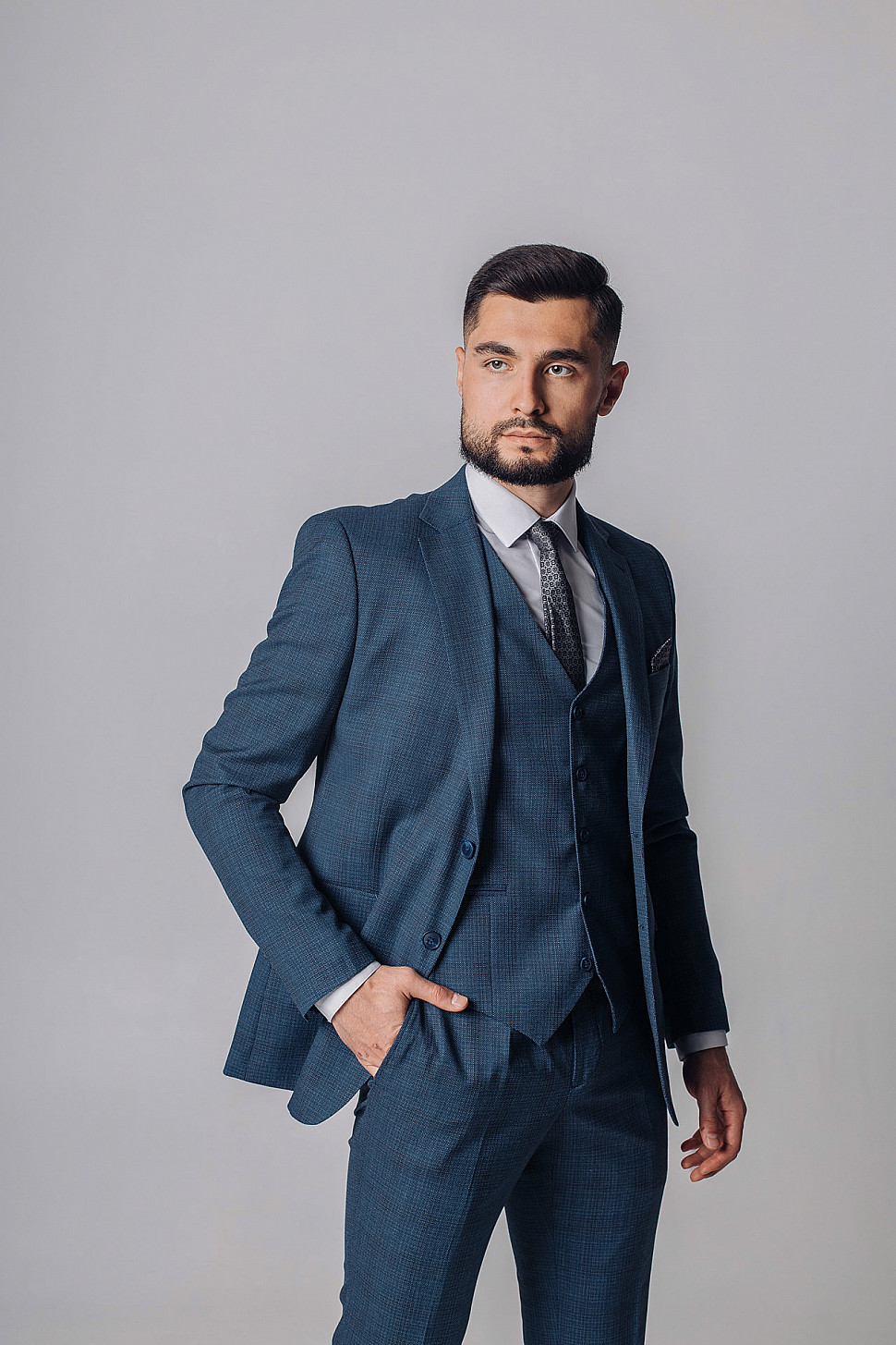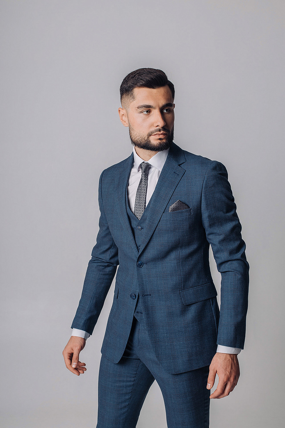 Мужской костюм тройка серого цвета фактурный