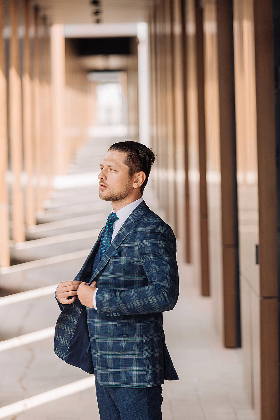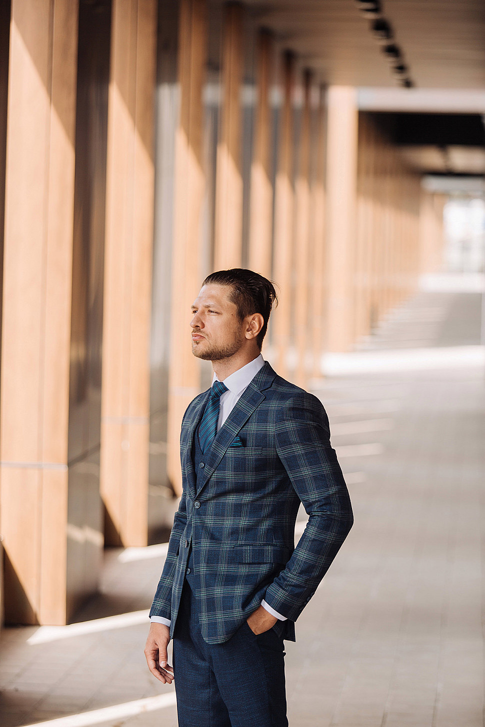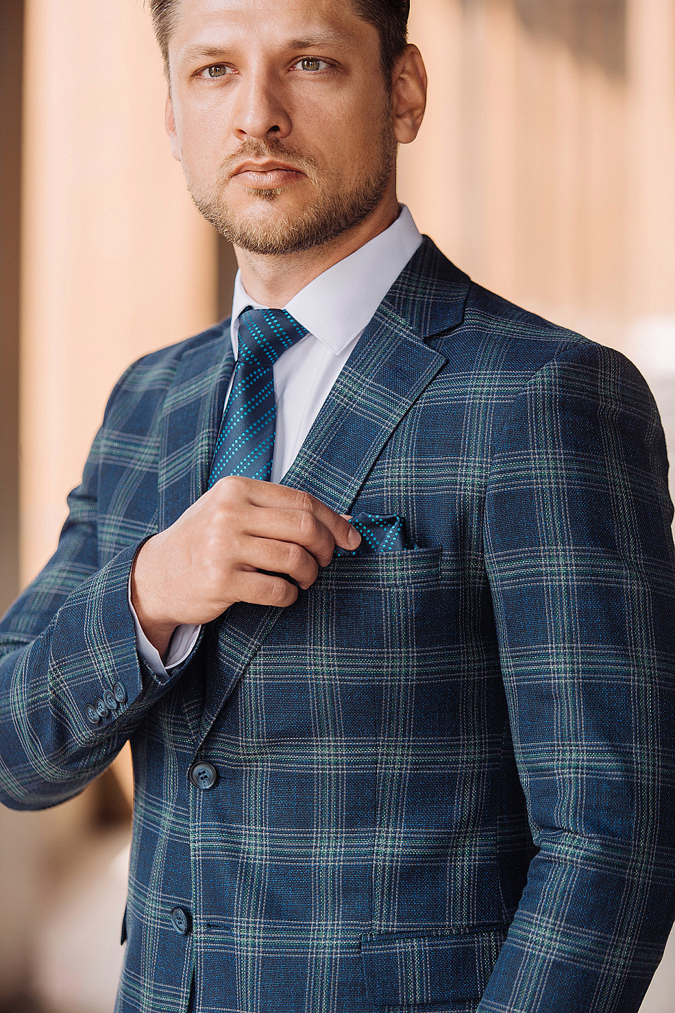Костюм светло-коричневый двойка в клетку, повседневный и классический образ
