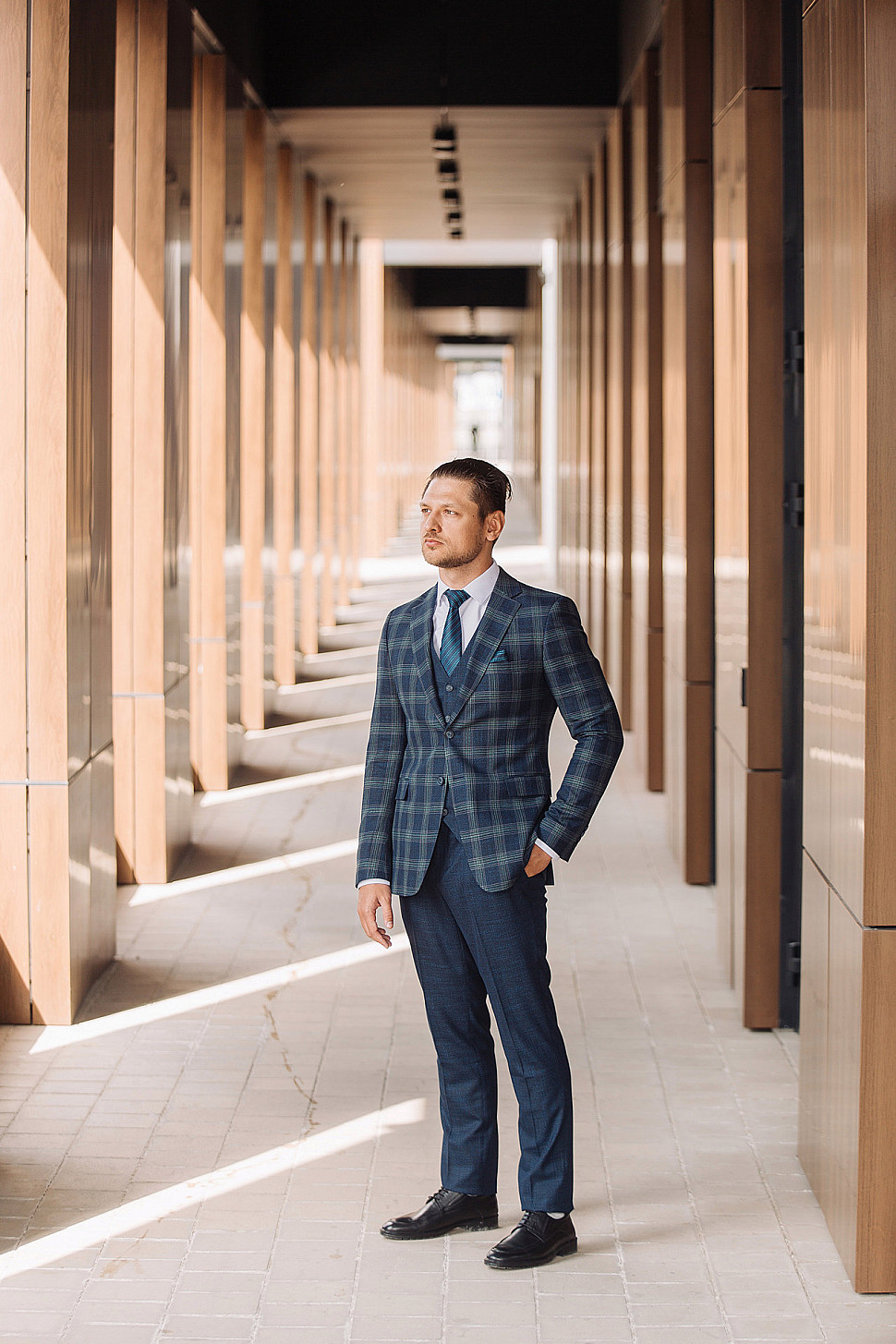 Мужской костюм тройка синего цвета в зеленую клетку