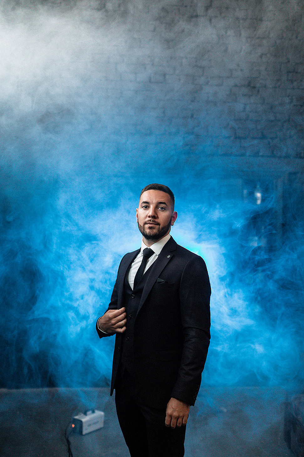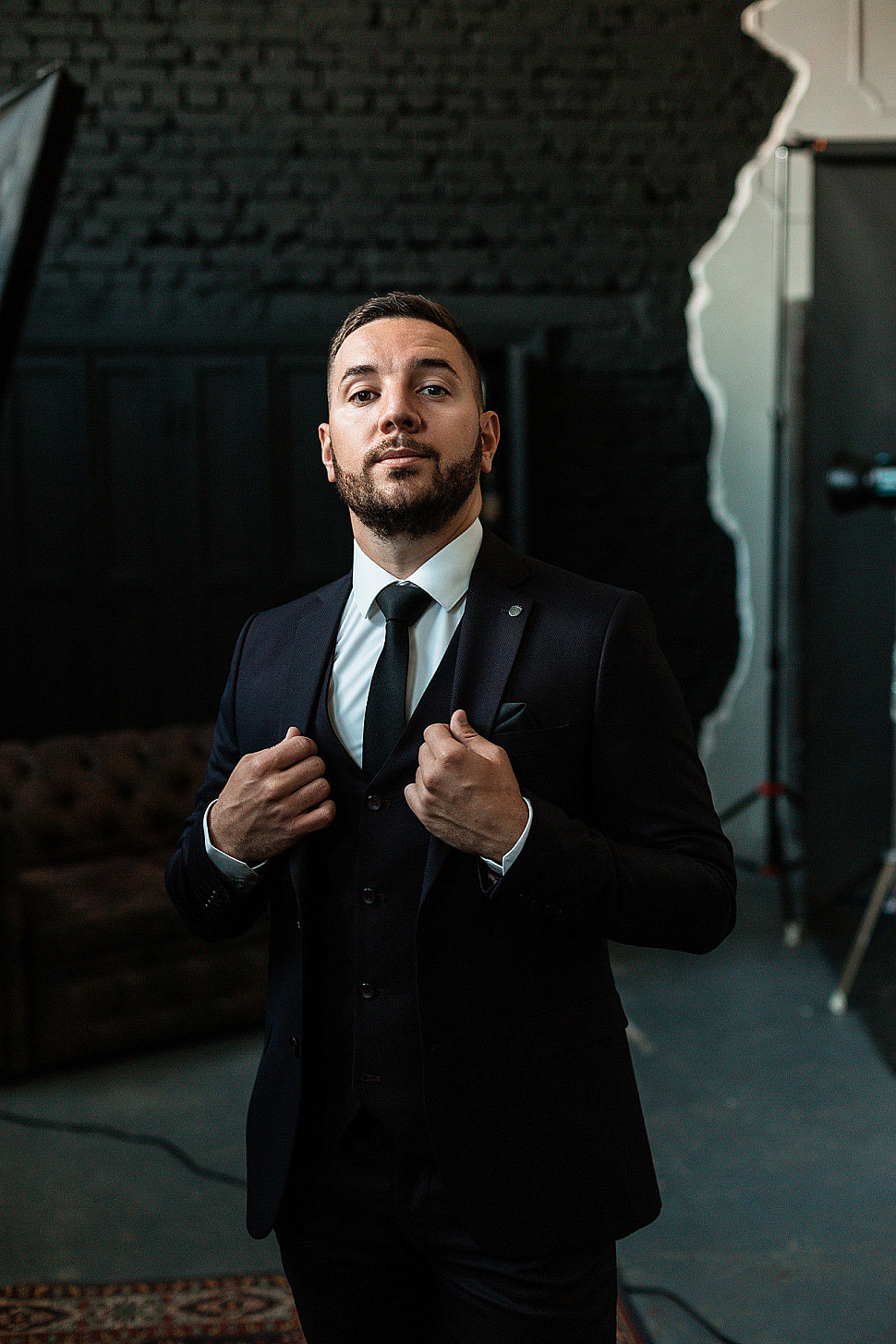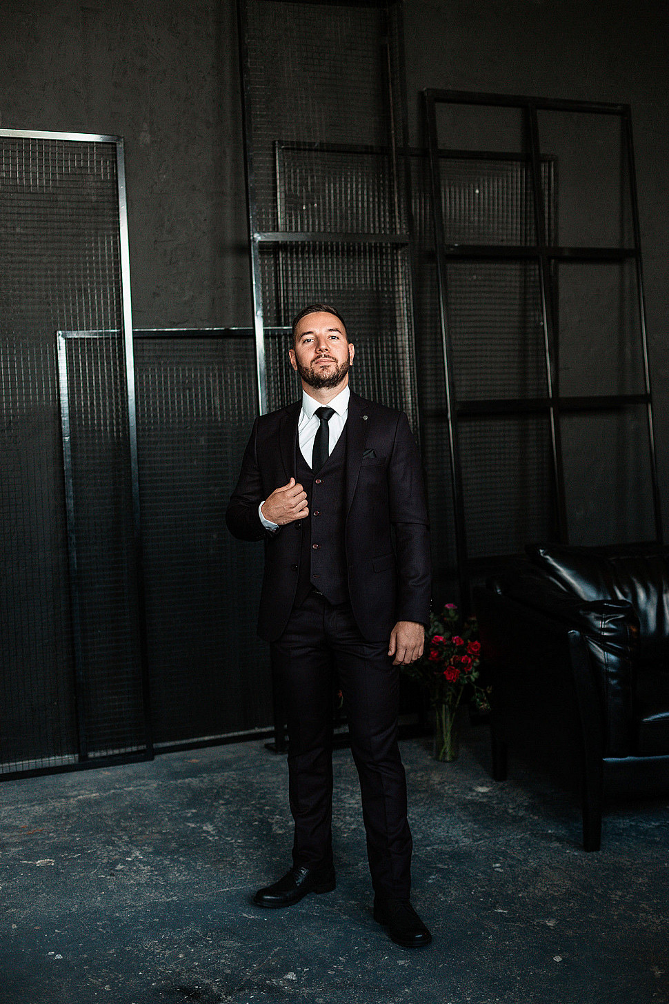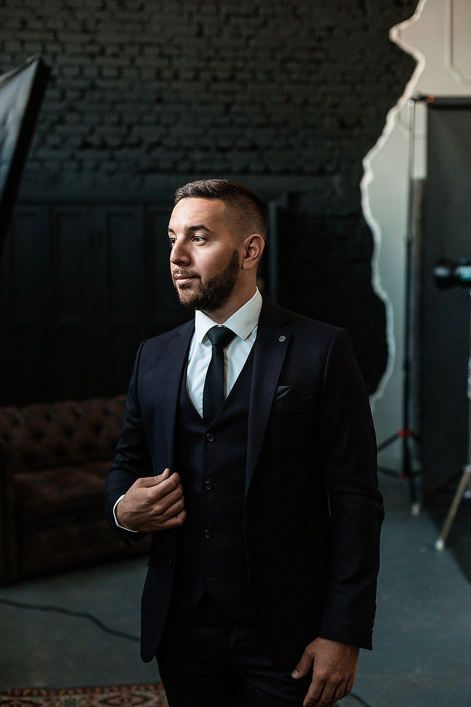 Мужской костюм тройка черного цвета и сноуборд