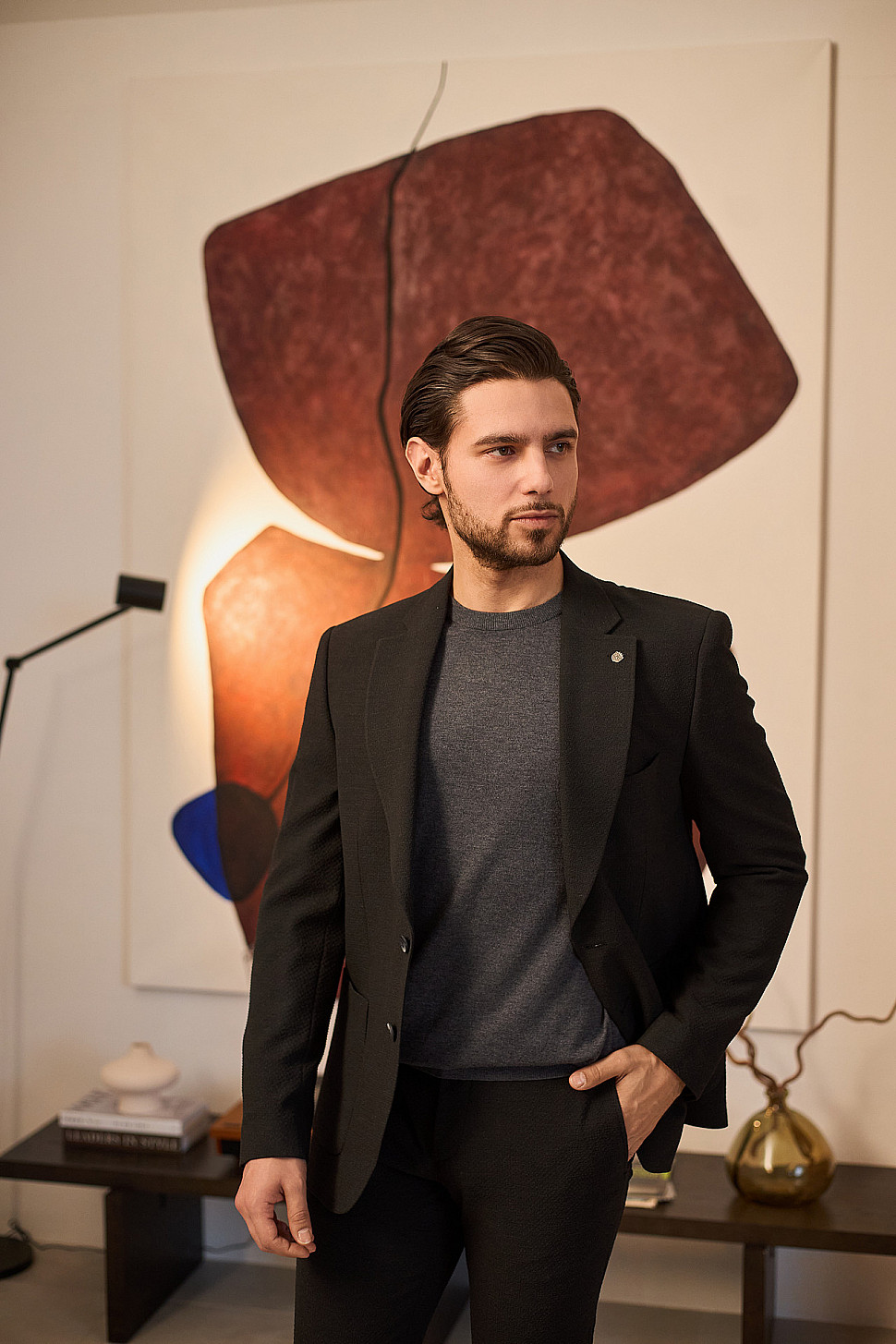 Мужской костюм тройка черного цвета и сноуборд